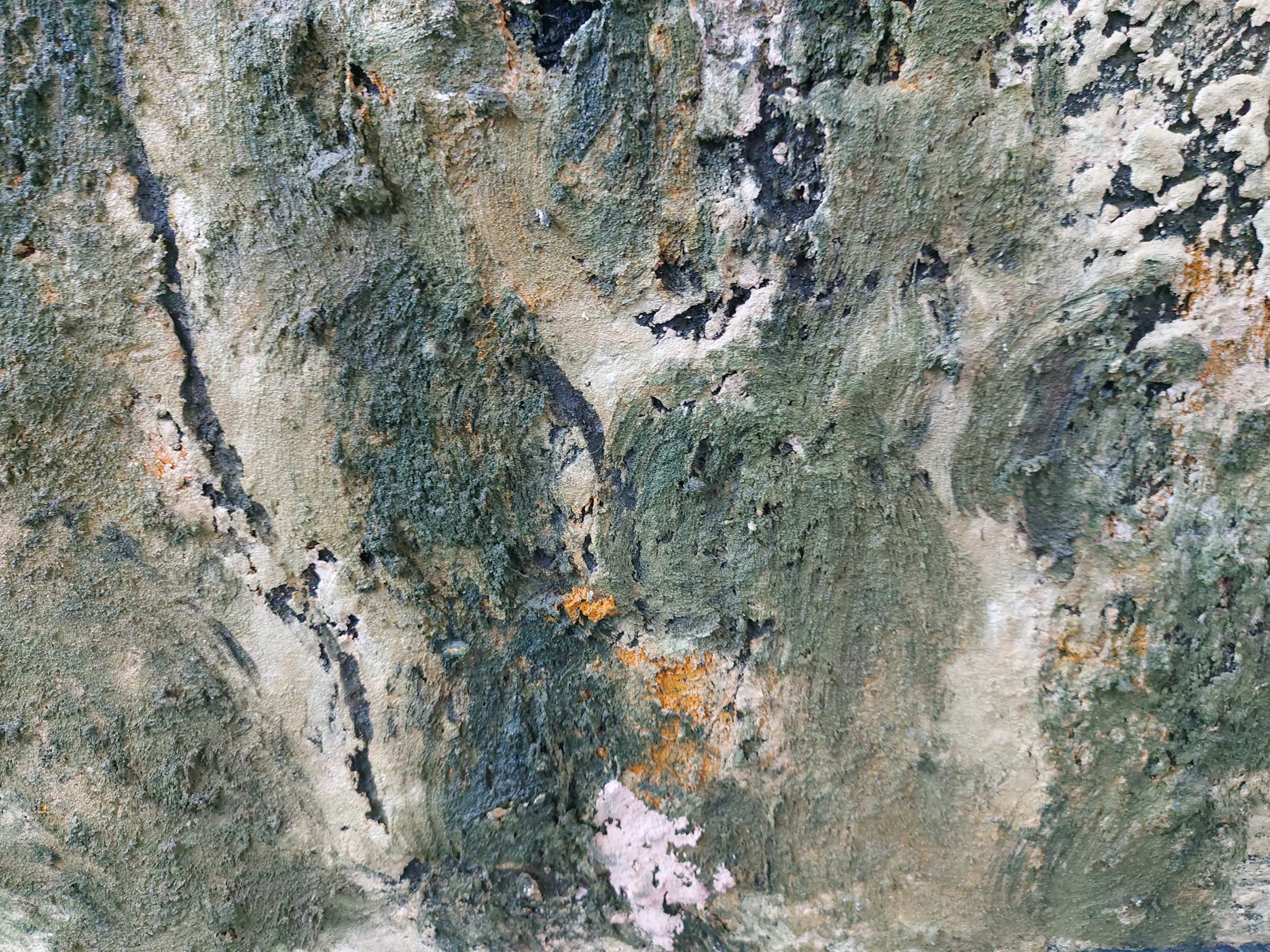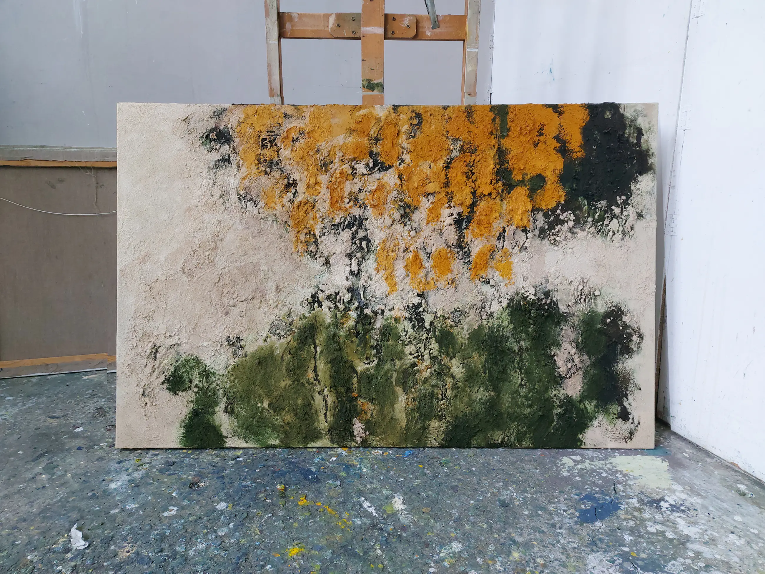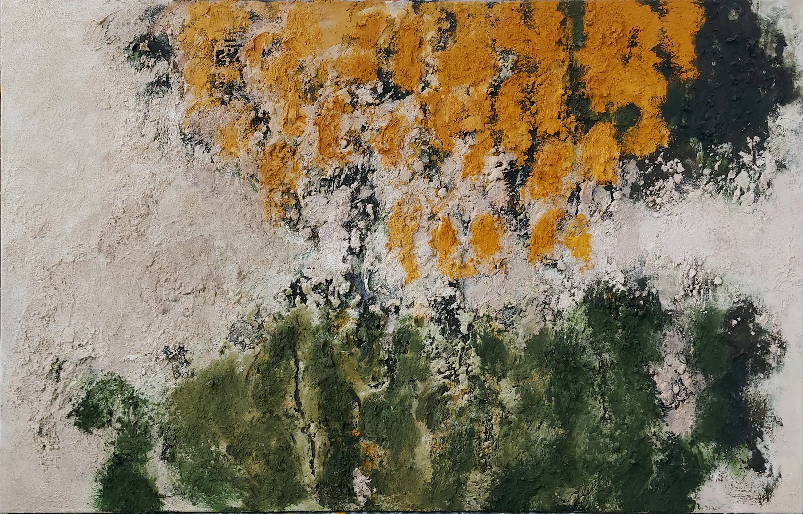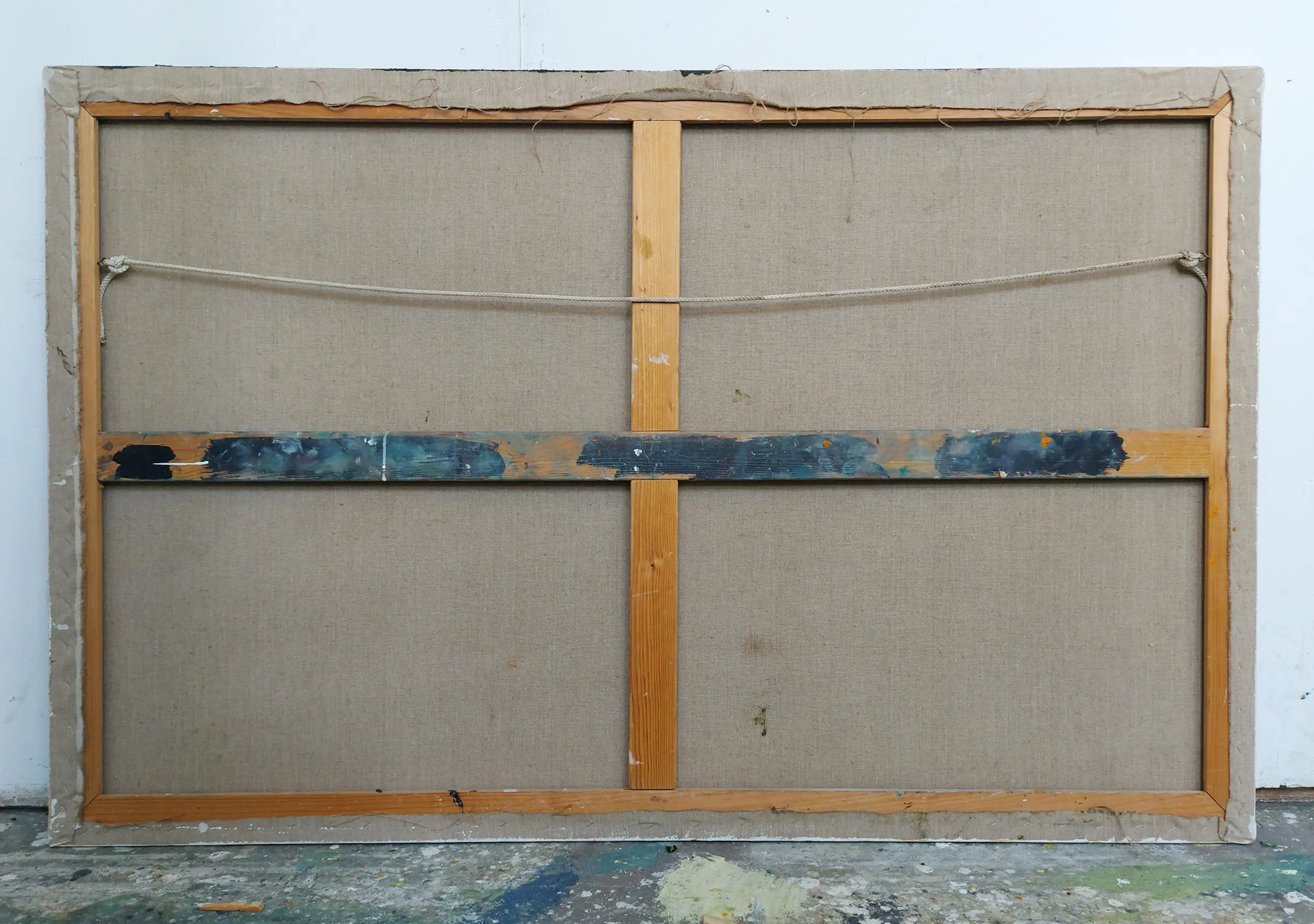 Olieverf met zand op doek. Door zijn verfbehandeling met vele vele lagen verf hebben veel van de schilderijen van Gerard Strik een bijna geboetseerde oppervlaktestructuur. Het zand dat hij aan zijn olieverf toevoegt, is niet alleen voor de structuur; het maakt zijn verf ‘aards’. Het geabstraheerde landschap wordt voelbaar.
