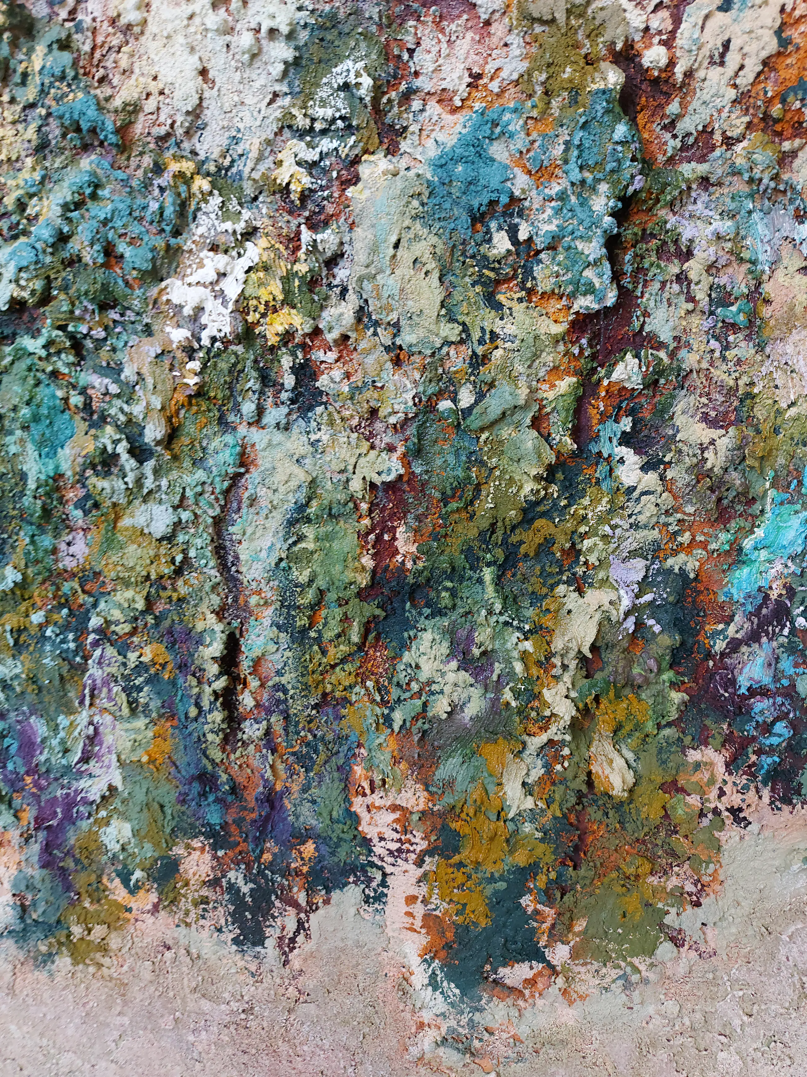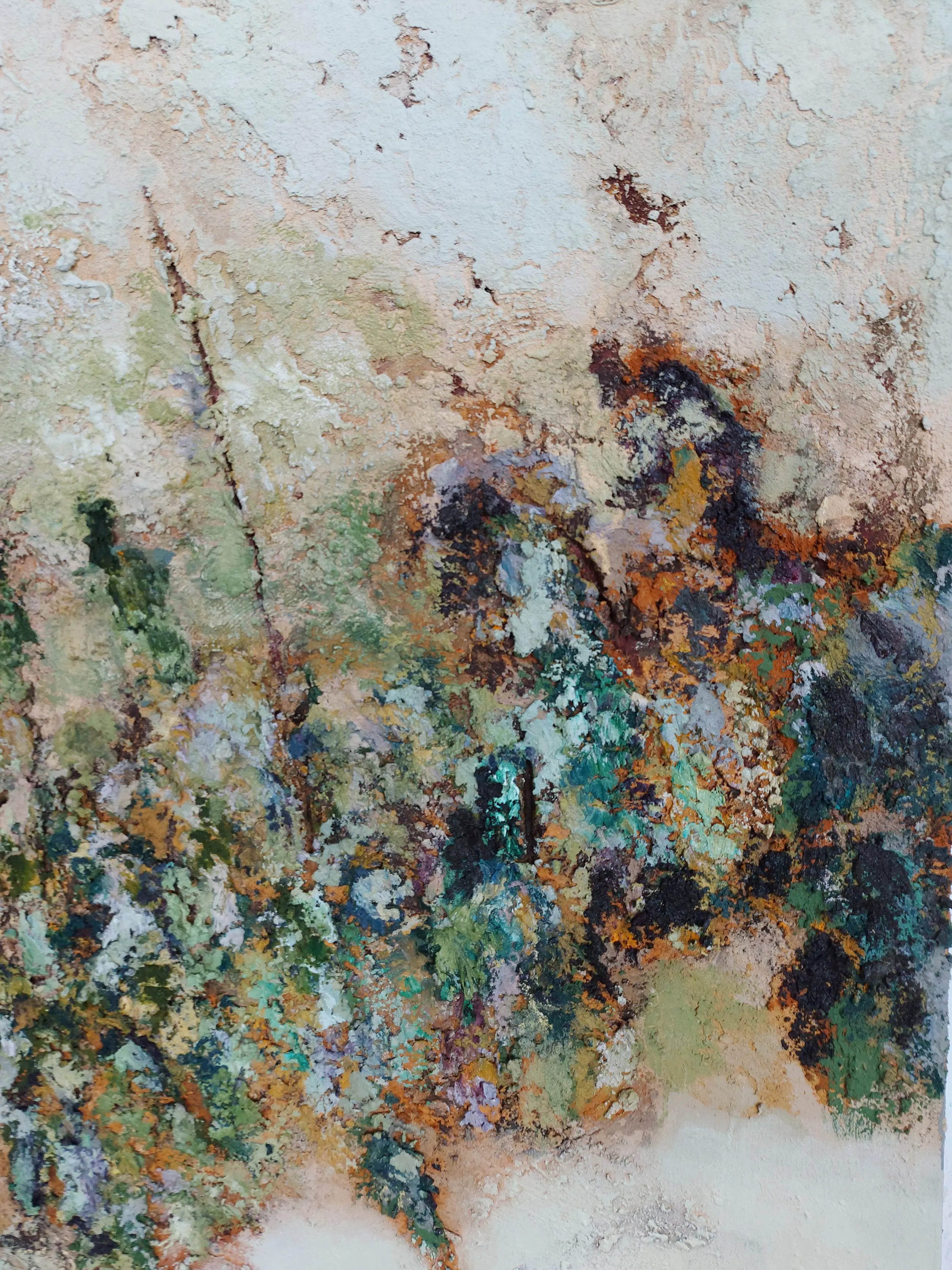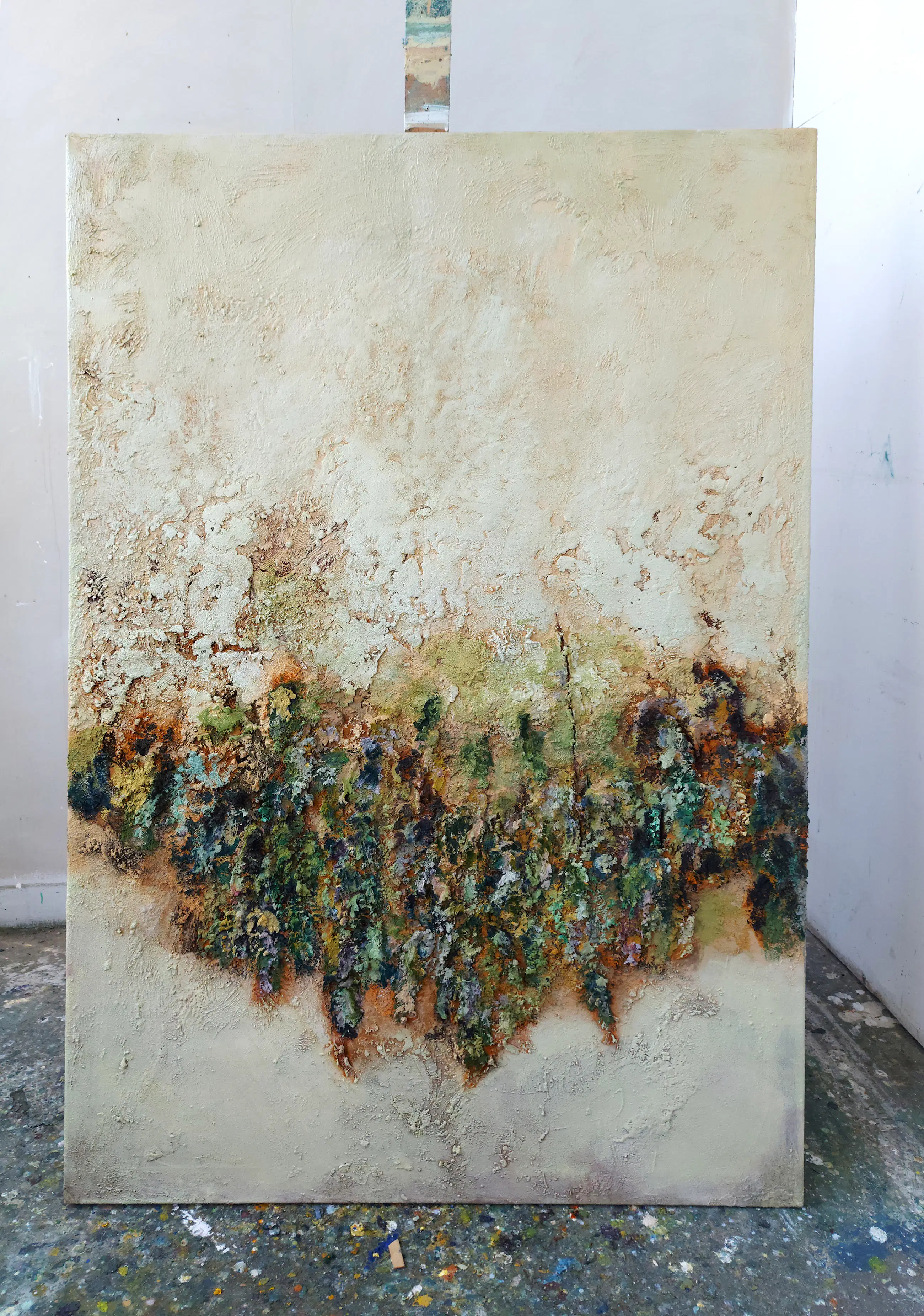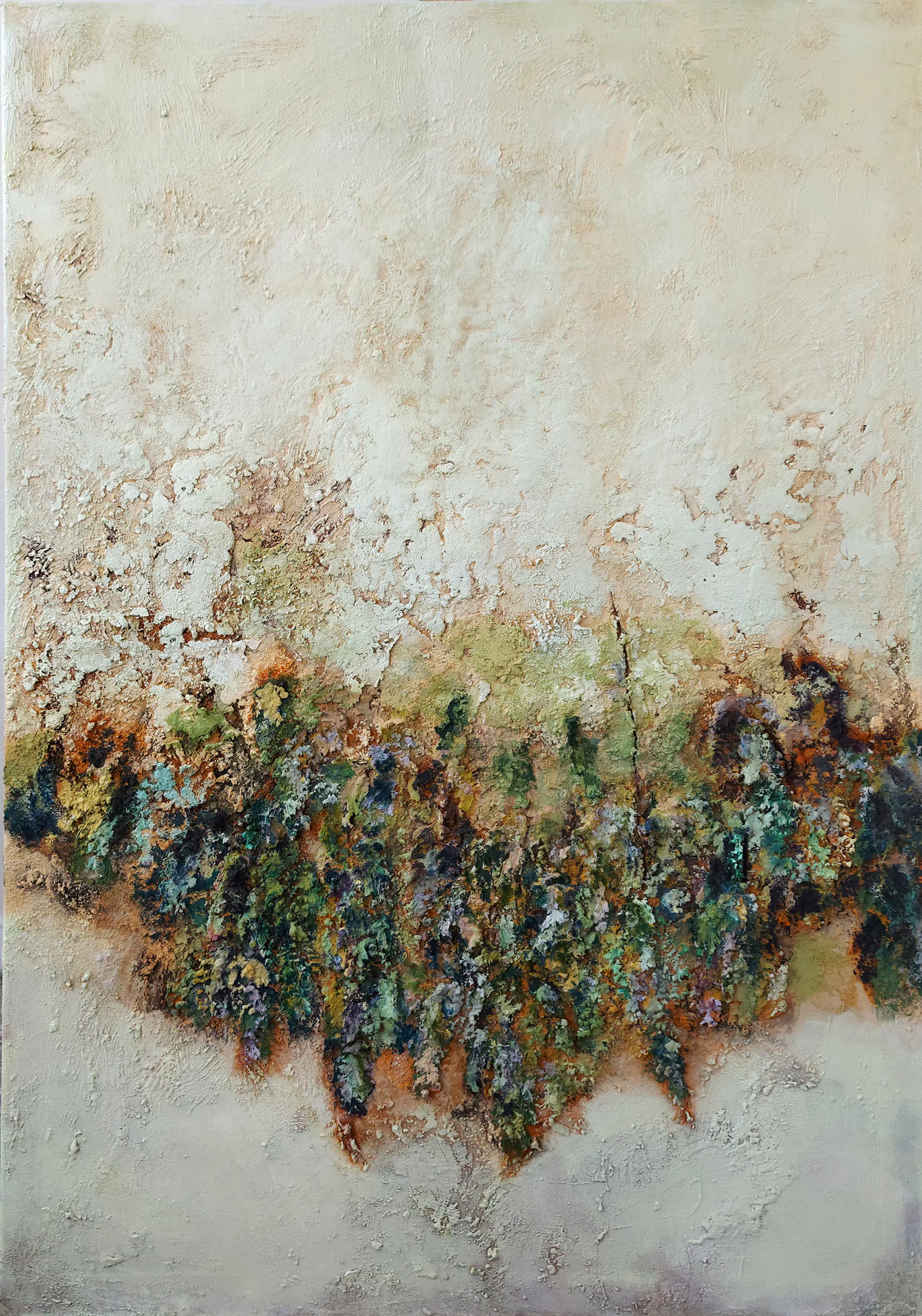 Olieverf met zand op doek. Door zijn verfbehandeling met vele vele lagen verf hebben veel van de schilderijen van Gerard Strik een bijna geboetseerde oppervlaktestructuur. Het zand dat hij aan zijn olieverf toevoegt, is niet alleen voor de structuur; het maakt zijn verf ‘aards’. Het geabstraheerde landschap wordt voelbaar.