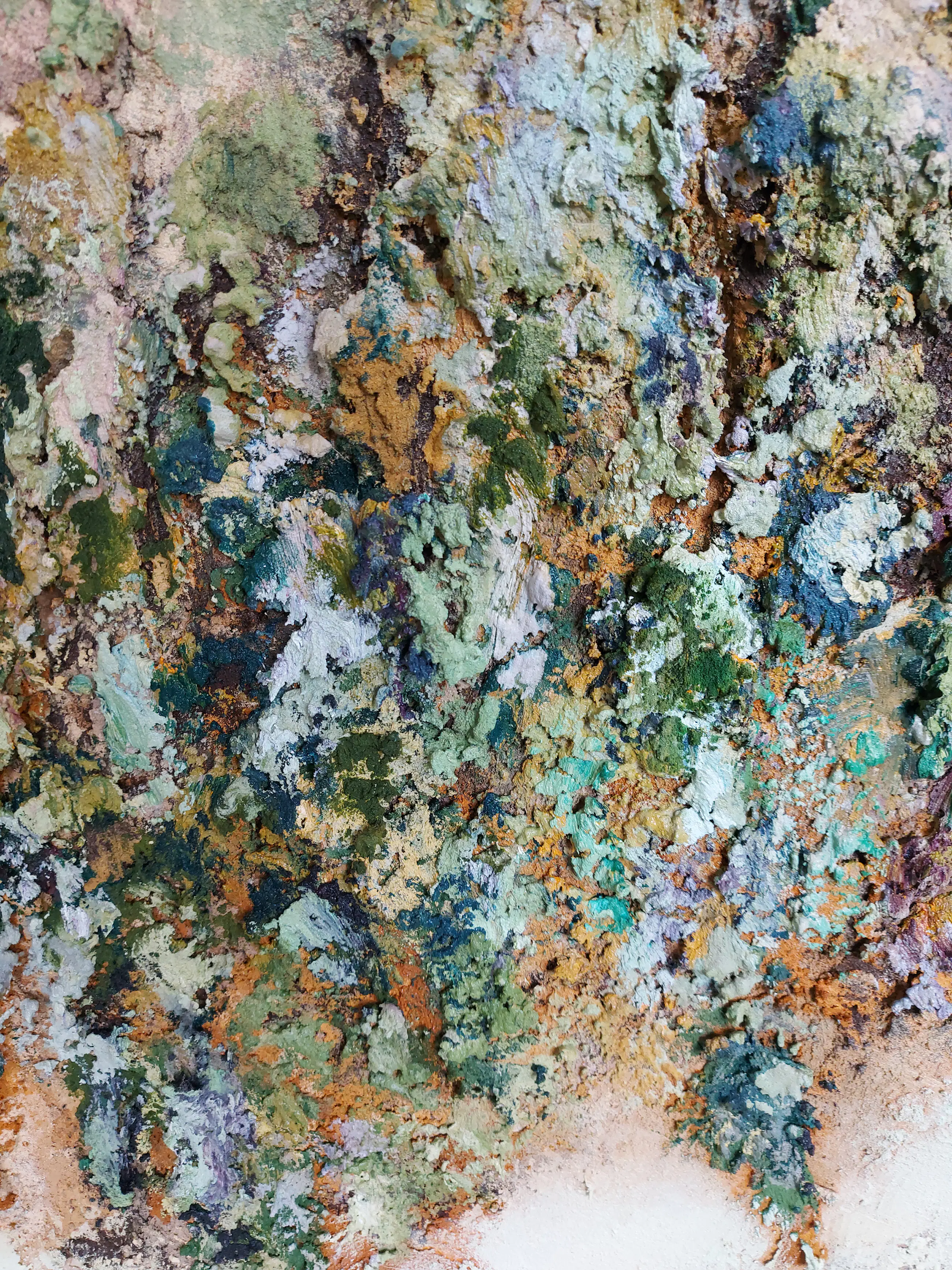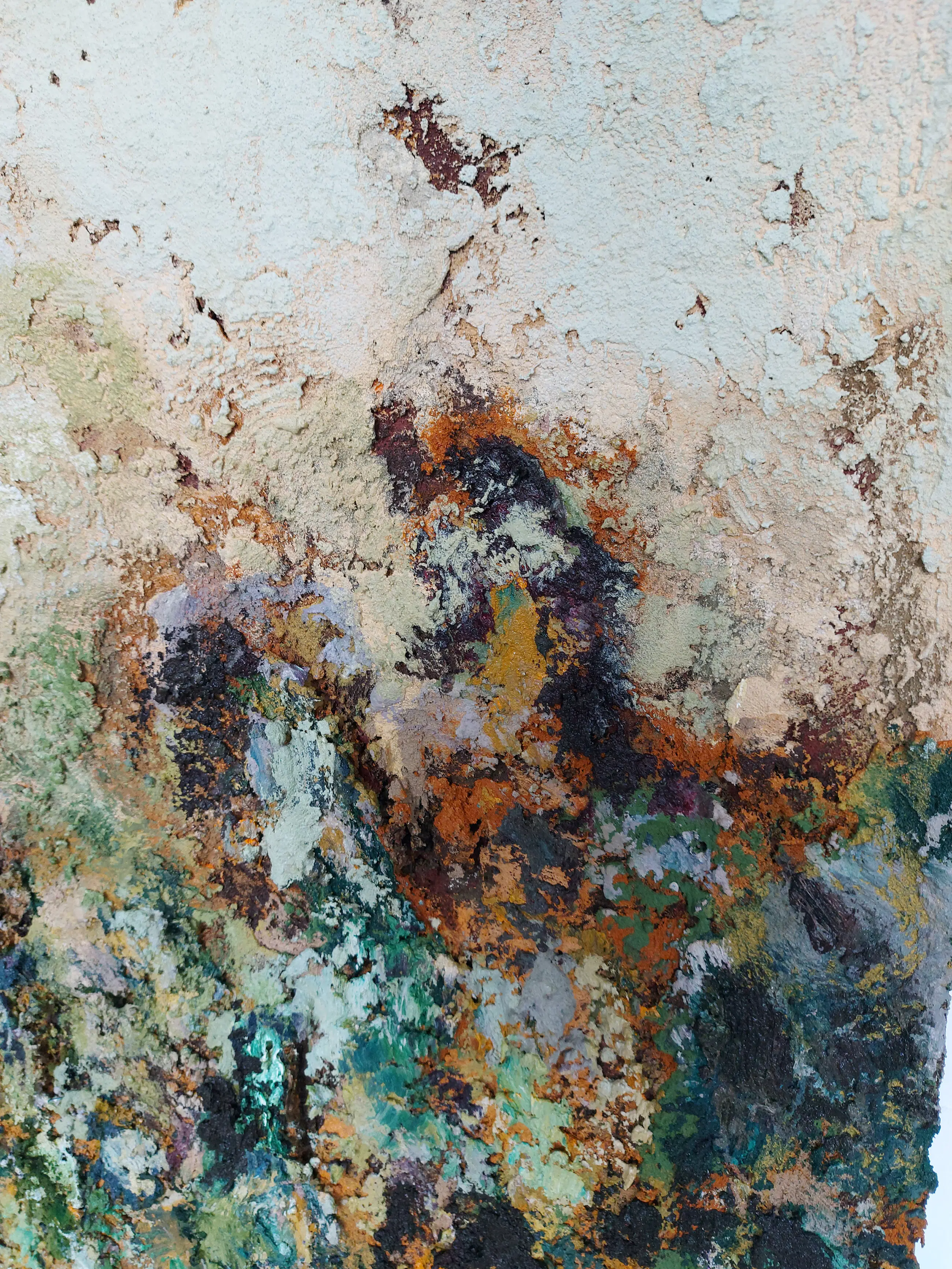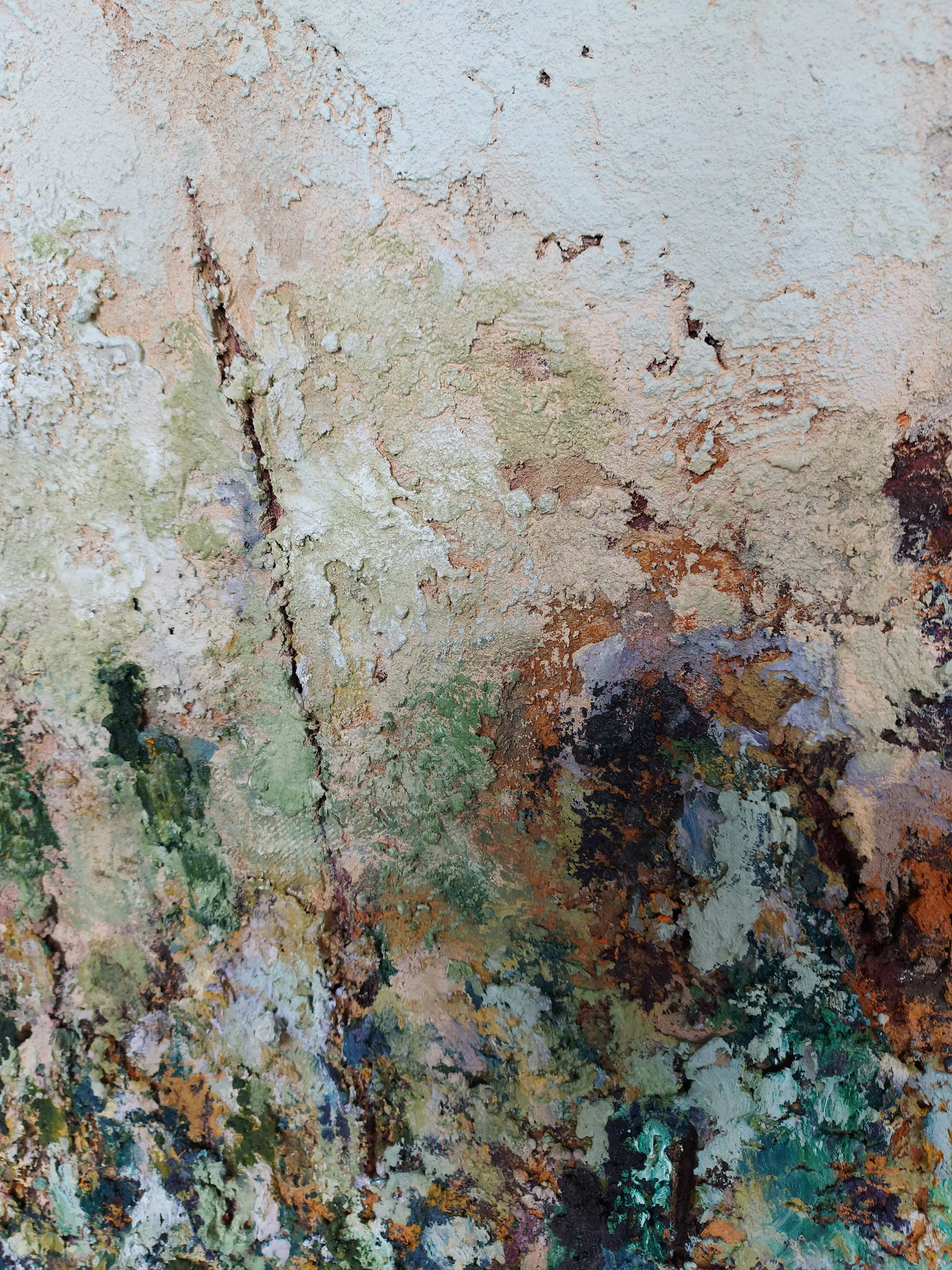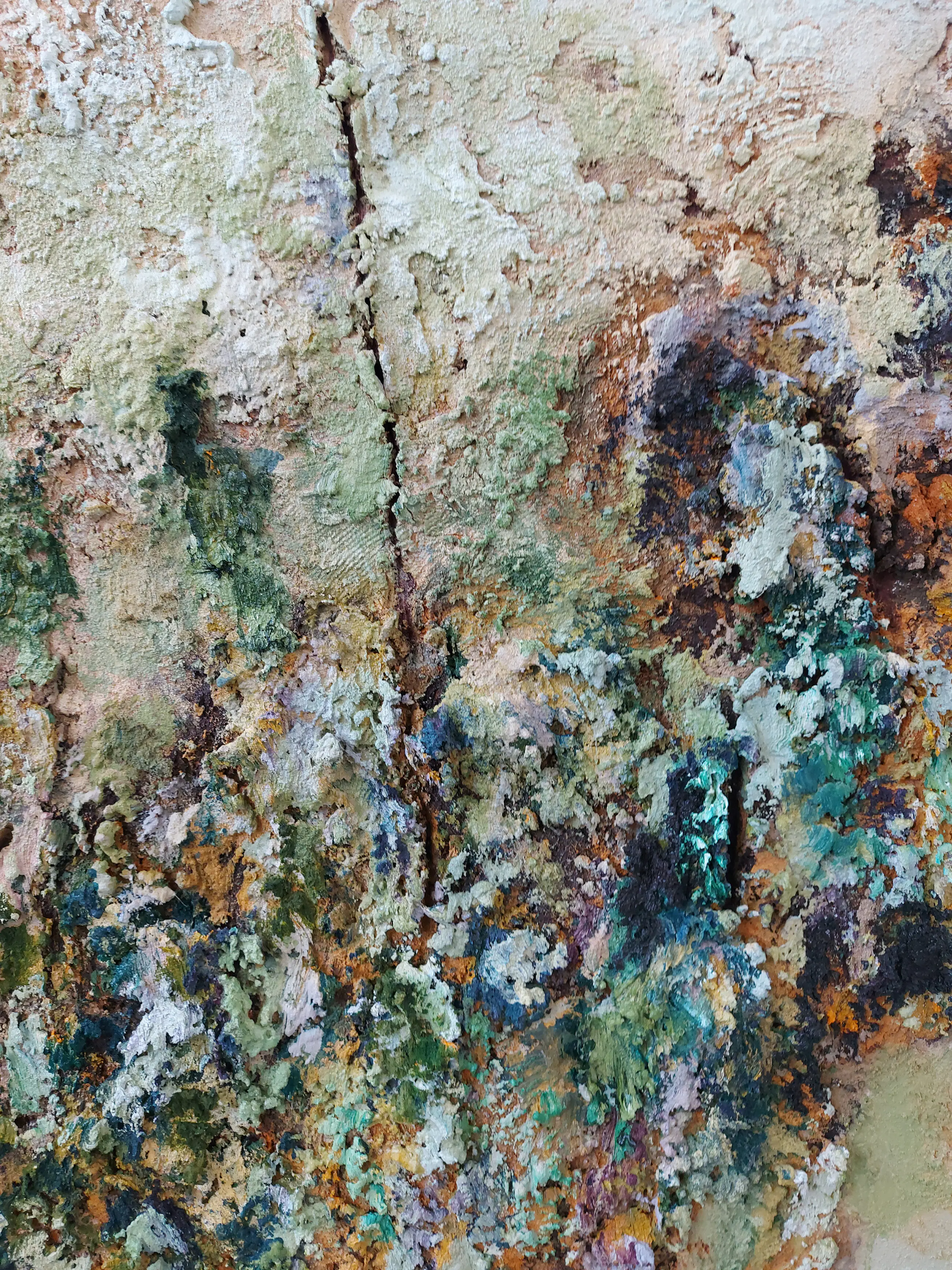 Olieverf met zand op doek. Door zijn verfbehandeling met vele vele lagen verf hebben veel van de schilderijen van Gerard Strik een bijna geboetseerde oppervlaktestructuur. Het zand dat hij aan zijn olieverf toevoegt, is niet alleen voor de structuur; het maakt zijn verf ‘aards’. Het geabstraheerde landschap wordt voelbaar.