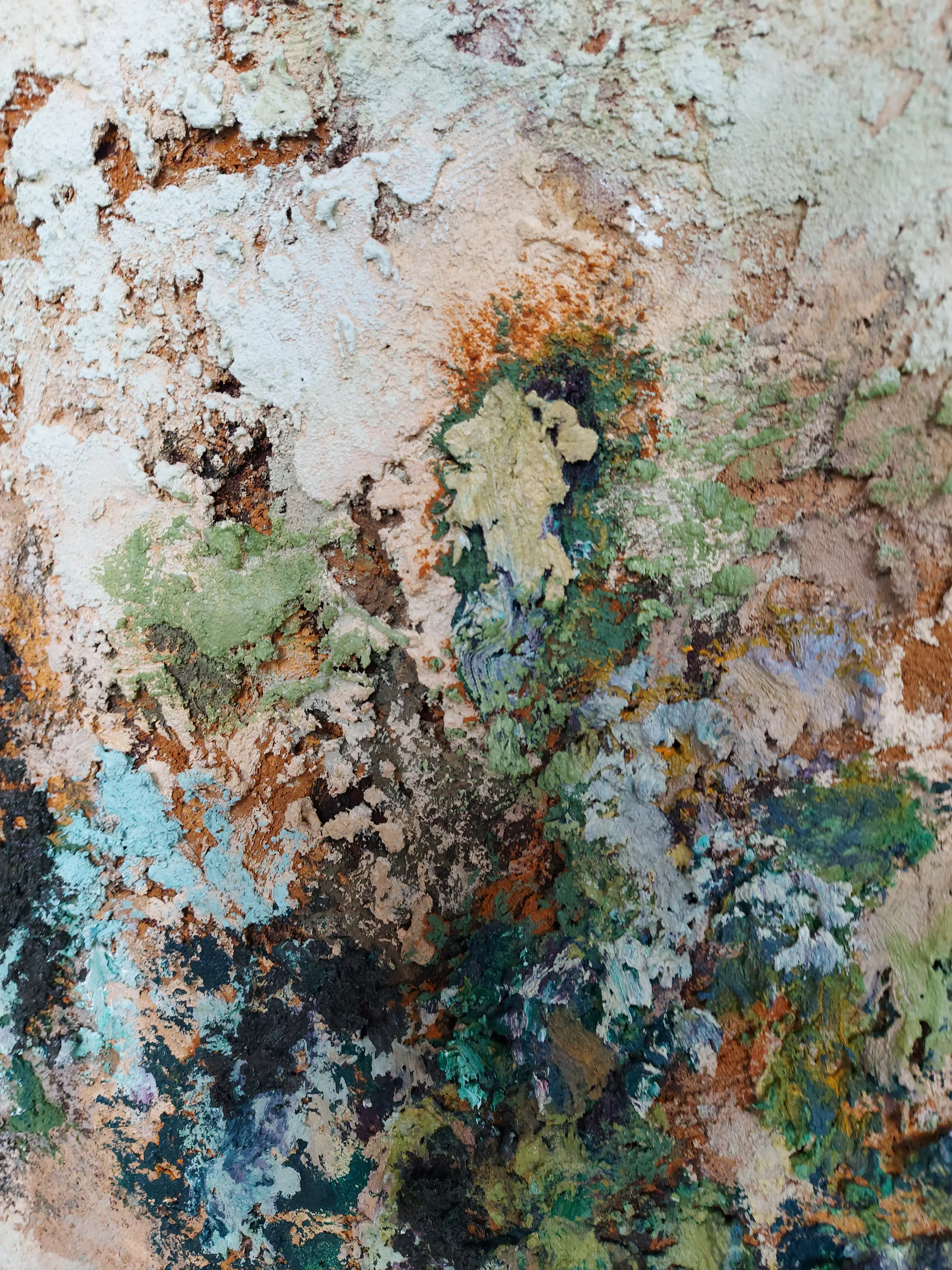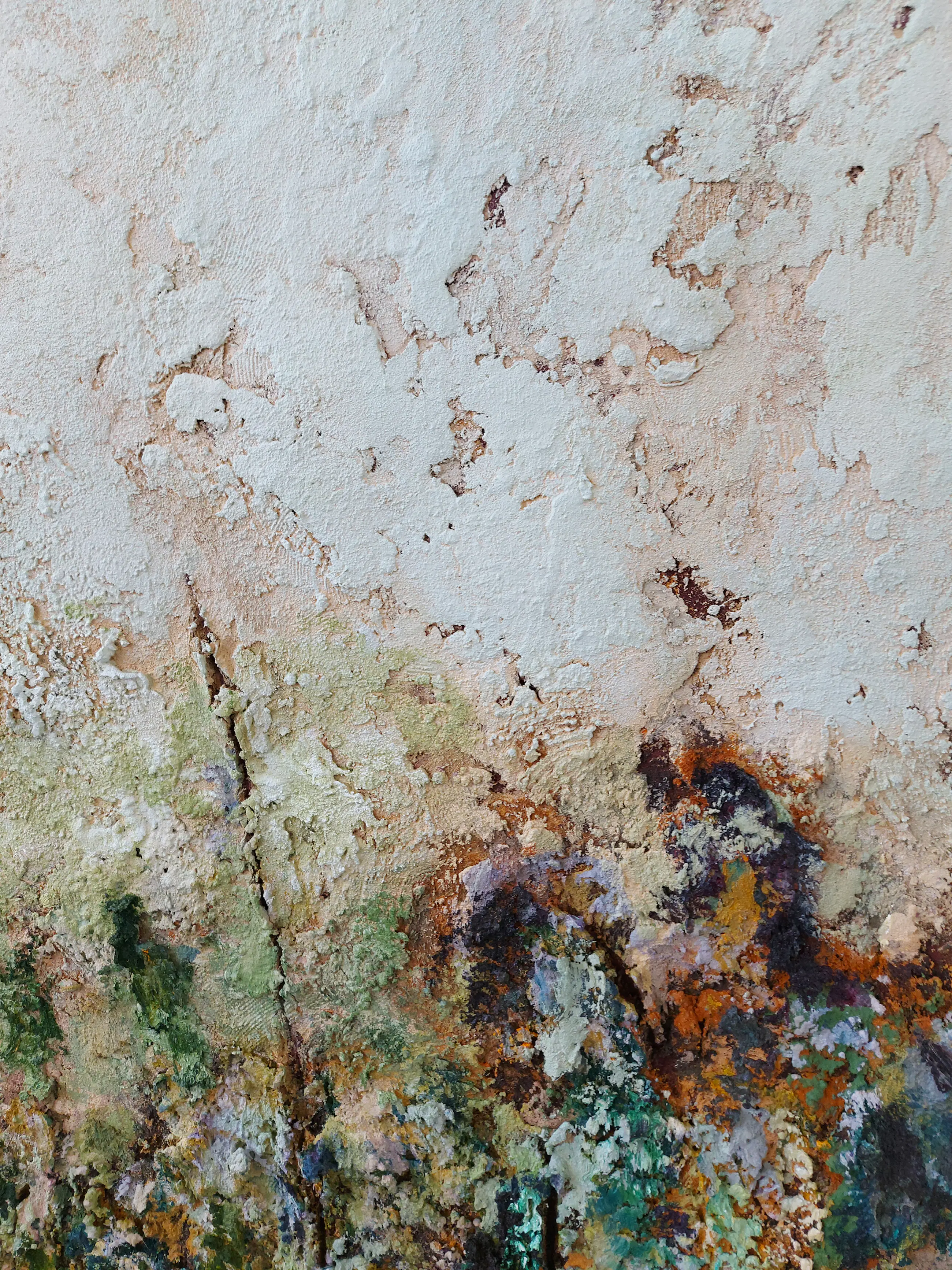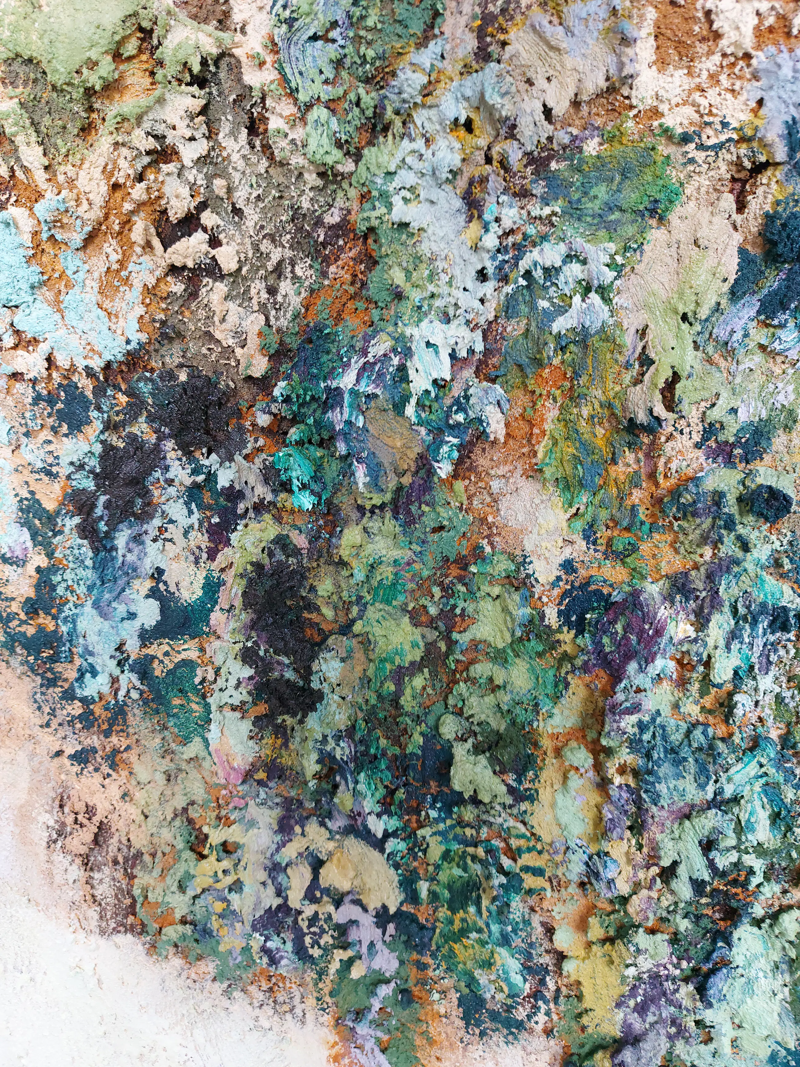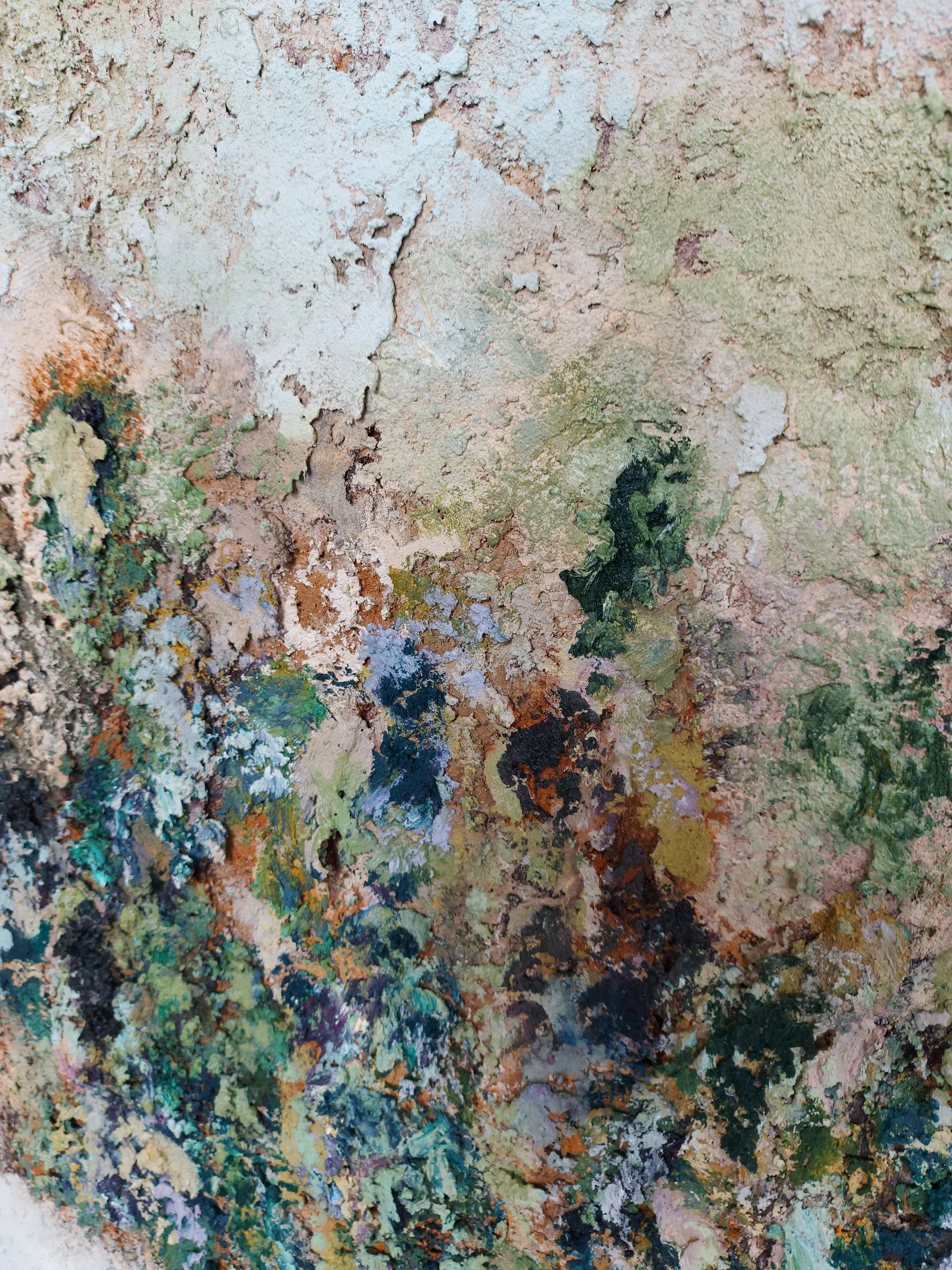 Olieverf met zand op doek. Door zijn verfbehandeling met vele vele lagen verf hebben veel van de schilderijen van Gerard Strik een bijna geboetseerde oppervlaktestructuur. Het zand dat hij aan zijn olieverf toevoegt, is niet alleen voor de structuur; het maakt zijn verf ‘aards’. Het geabstraheerde landschap wordt voelbaar.