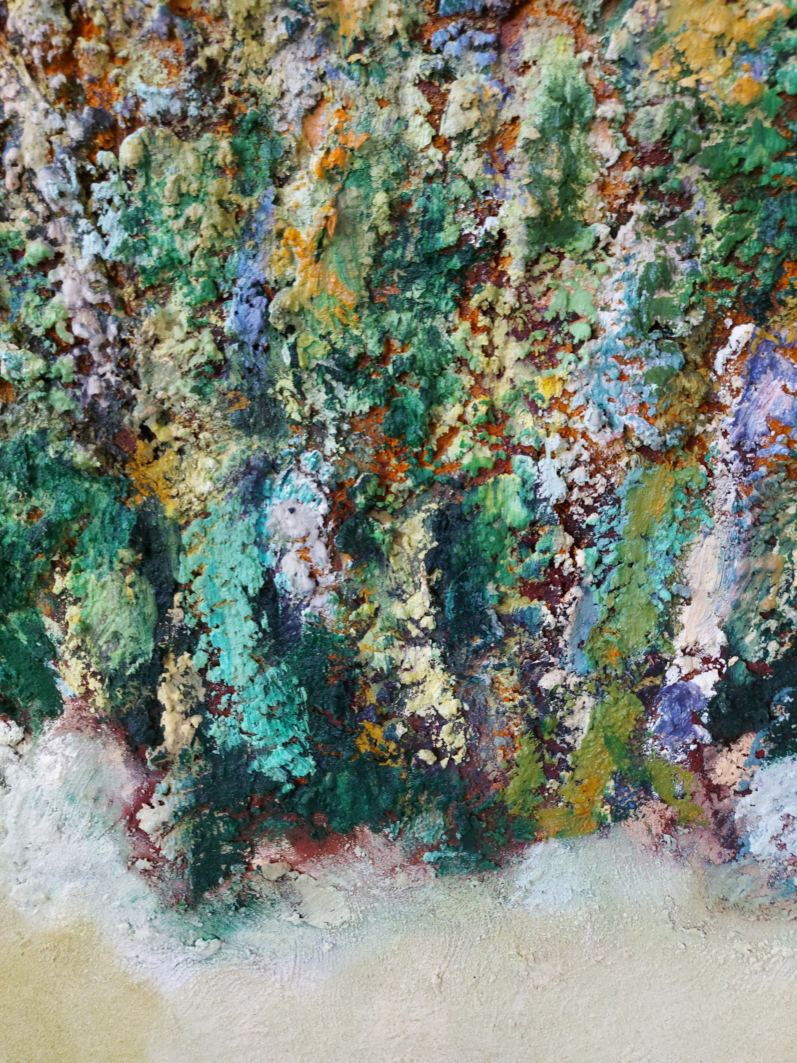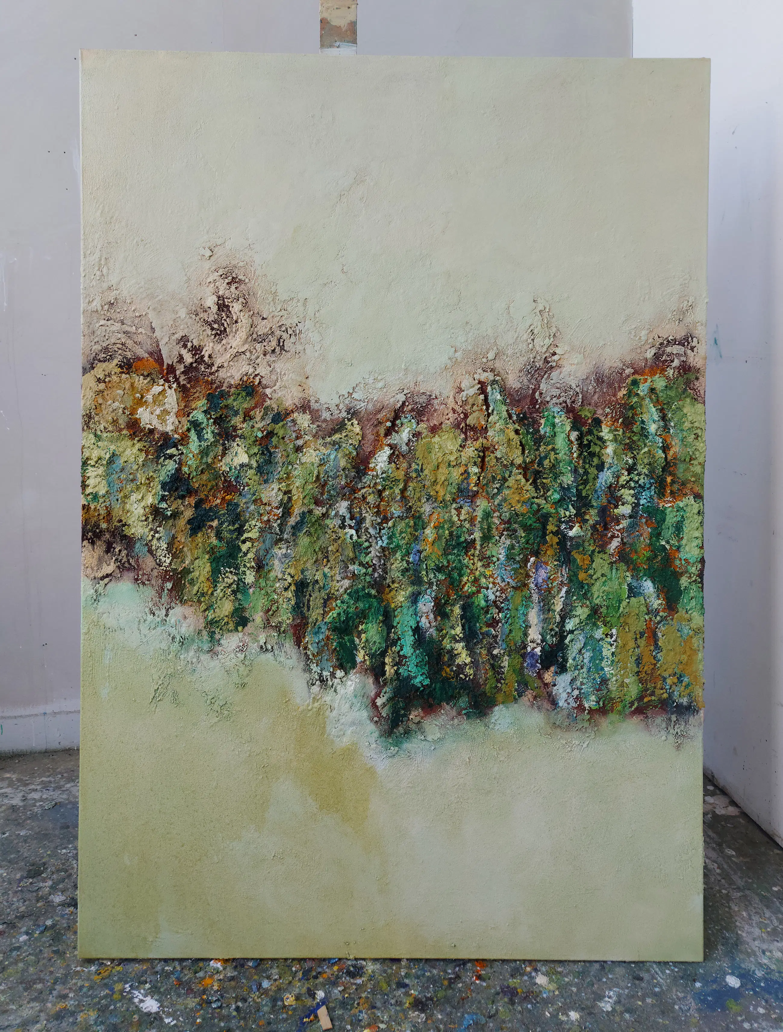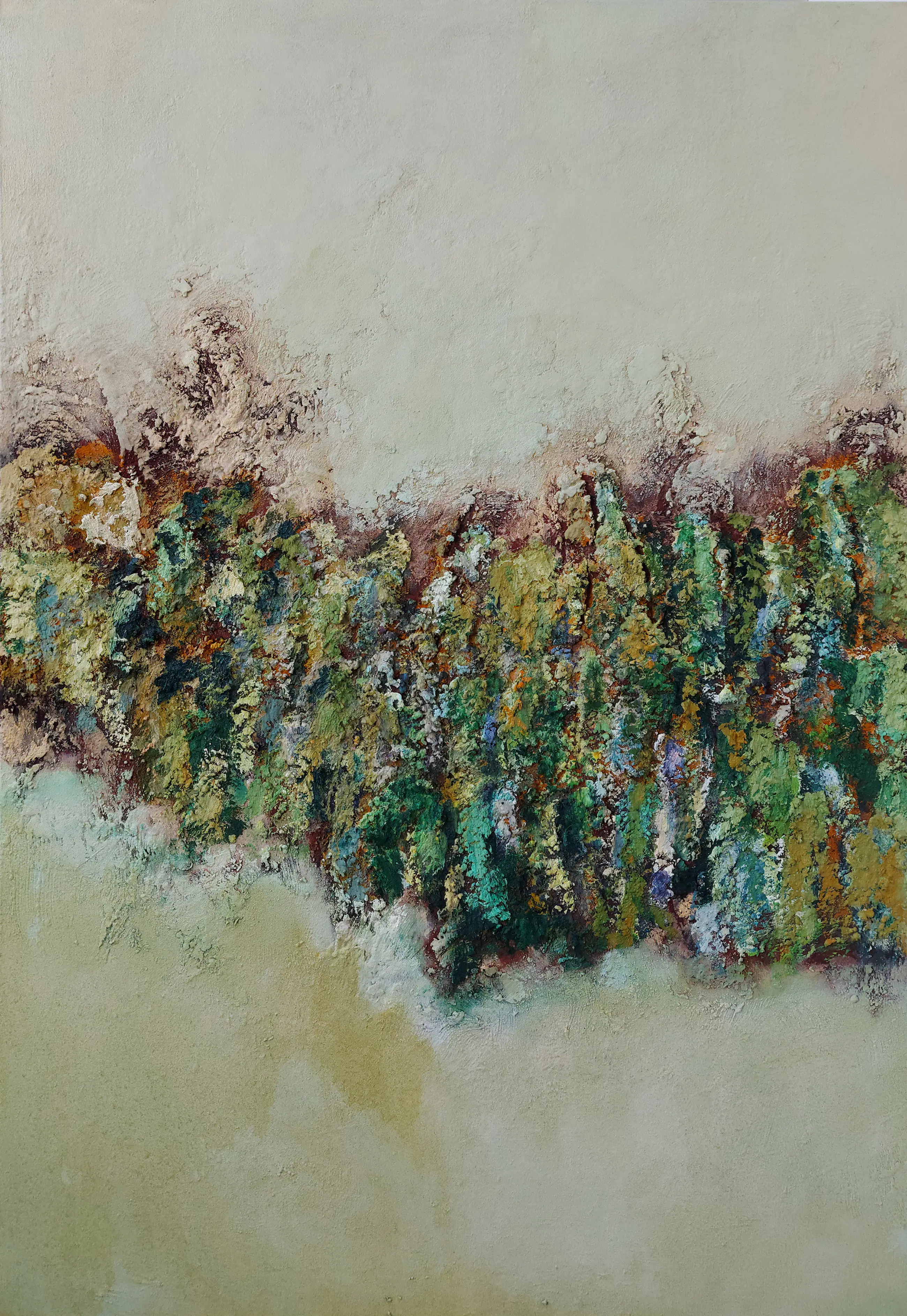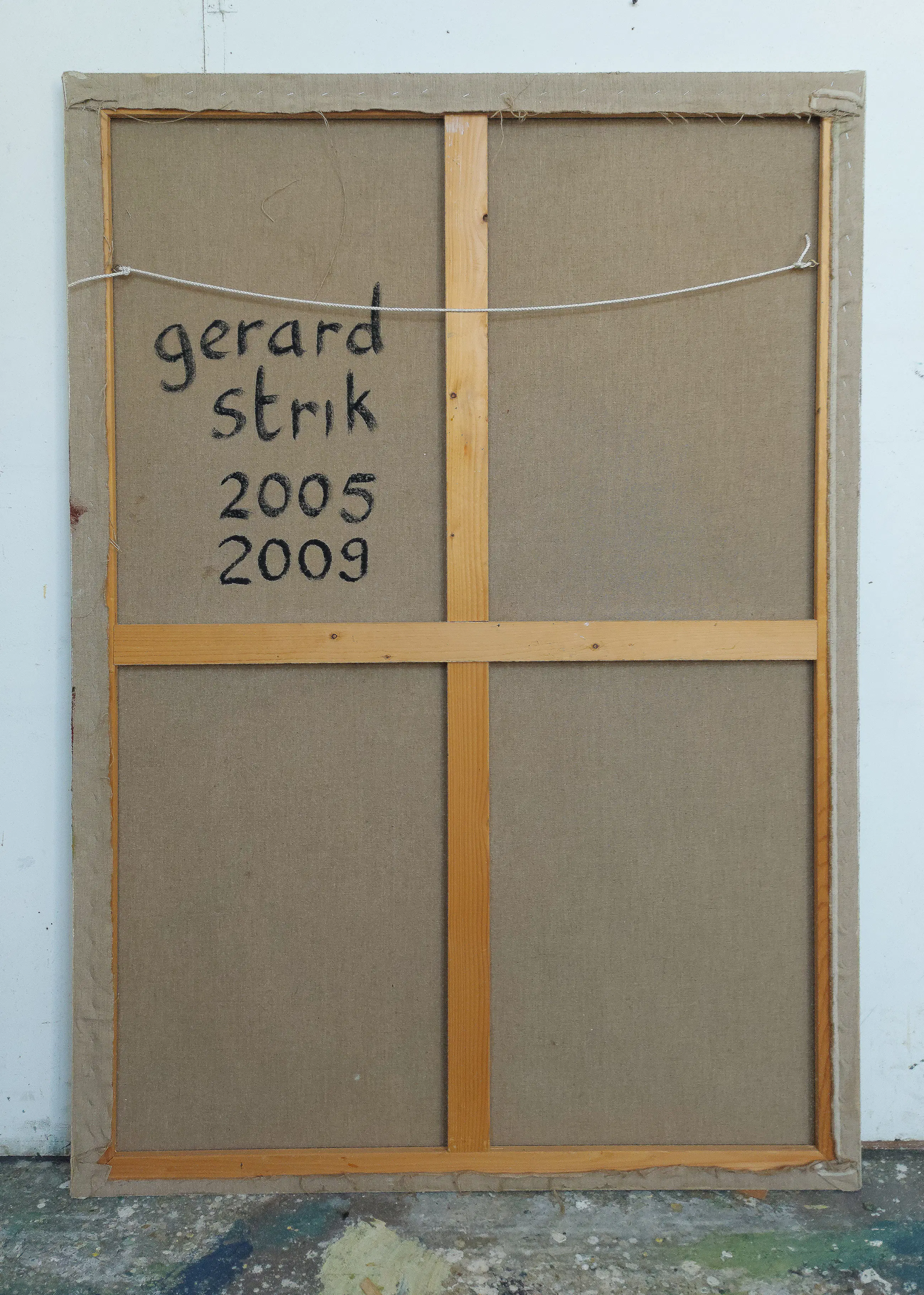 Olieverf met zand op doek. Door zijn verfbehandeling met vele vele lagen verf hebben veel van de schilderijen van Gerard Strik een bijna geboetseerde oppervlaktestructuur. Het zand dat hij aan zijn olieverf toevoegt, is niet alleen voor de structuur; het maakt zijn verf ‘aards’. Het geabstraheerde landschap wordt voelbaar.