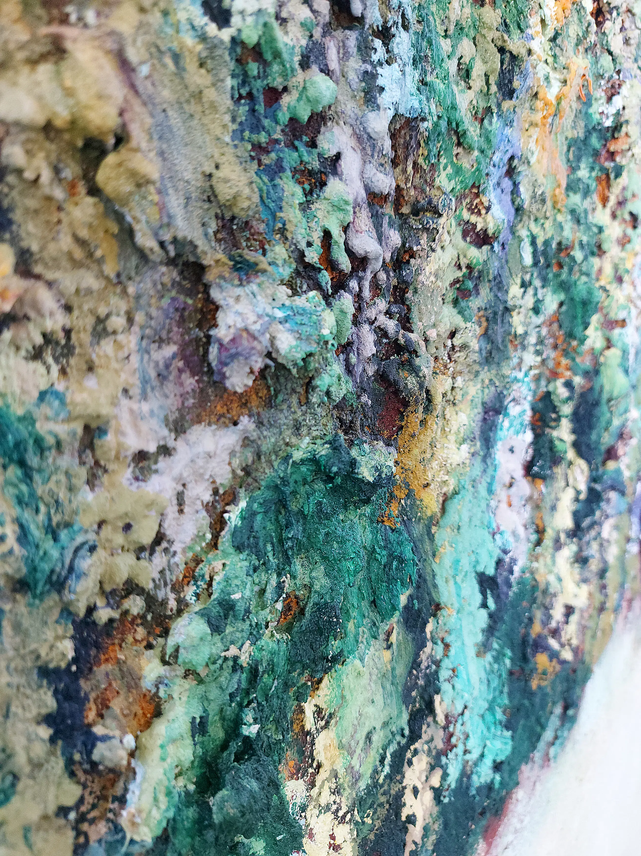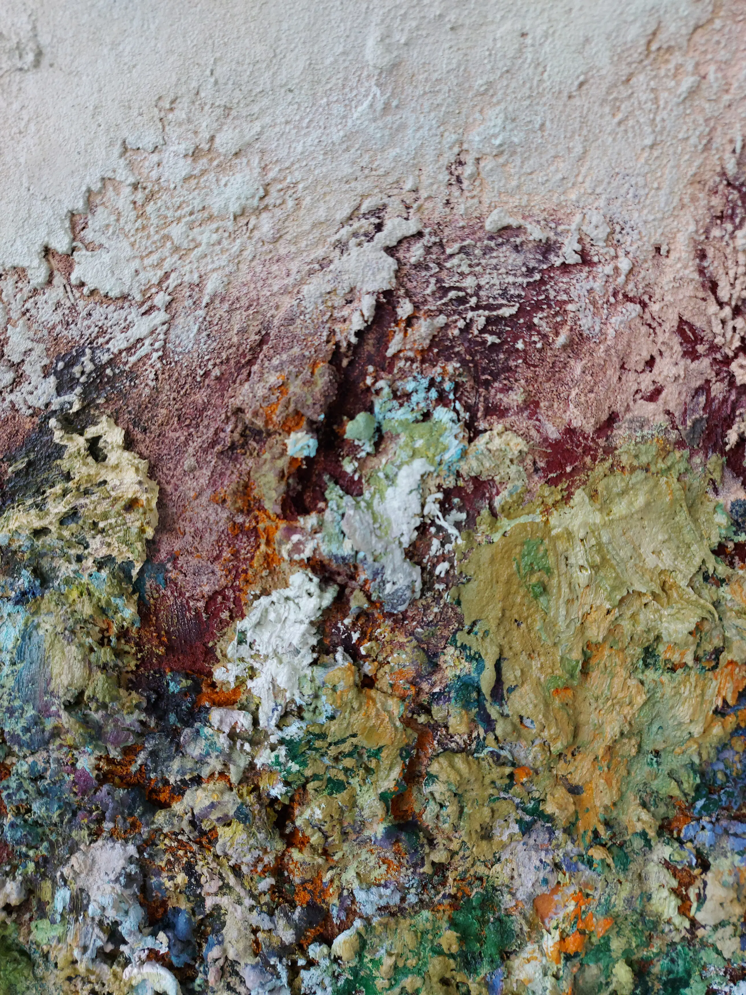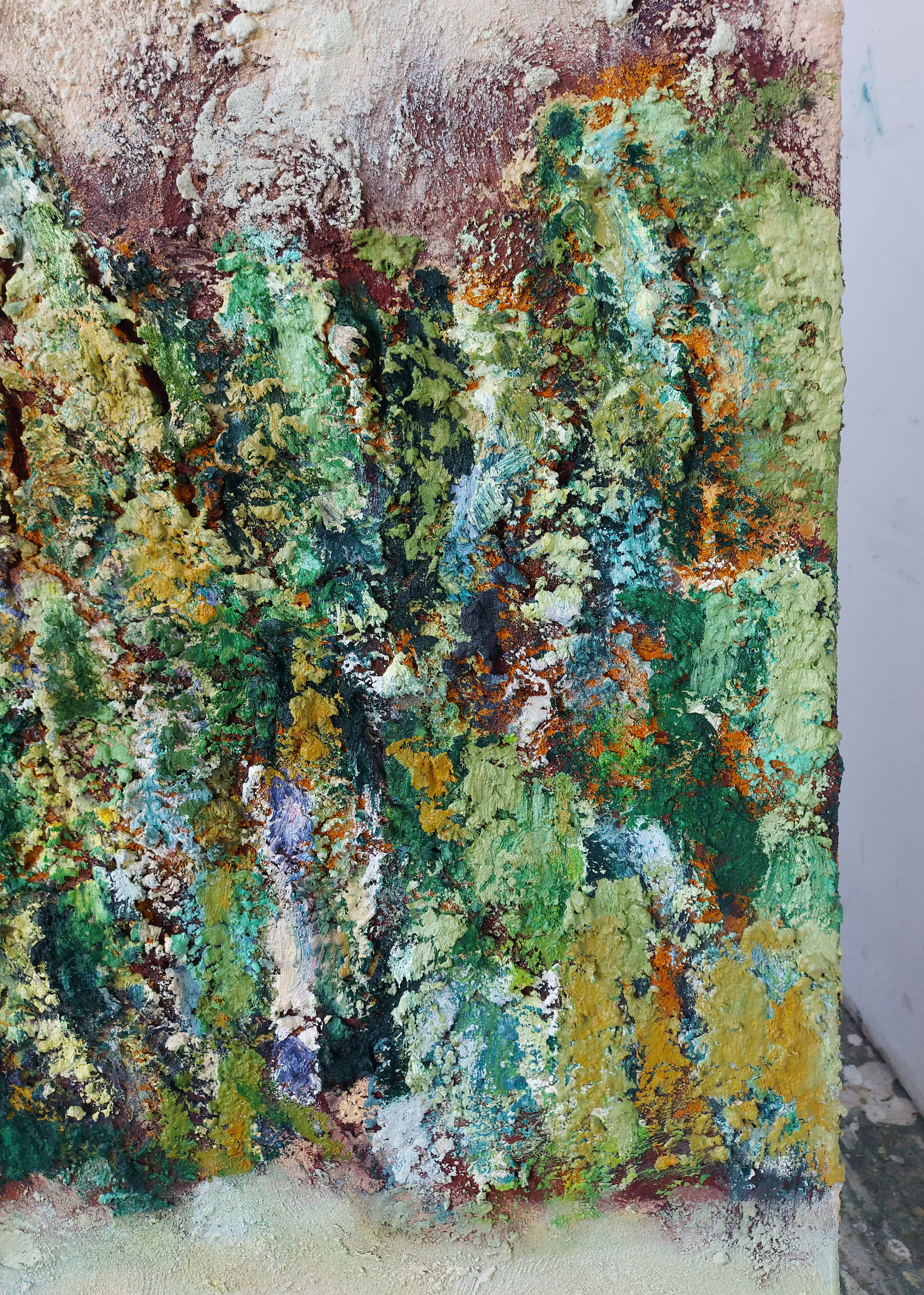 Olieverf met zand op doek. Door zijn verfbehandeling met vele vele lagen verf hebben veel van de schilderijen van Gerard Strik een bijna geboetseerde oppervlaktestructuur. Het zand dat hij aan zijn olieverf toevoegt, is niet alleen voor de structuur; het maakt zijn verf ‘aards’. Het geabstraheerde landschap wordt voelbaar.