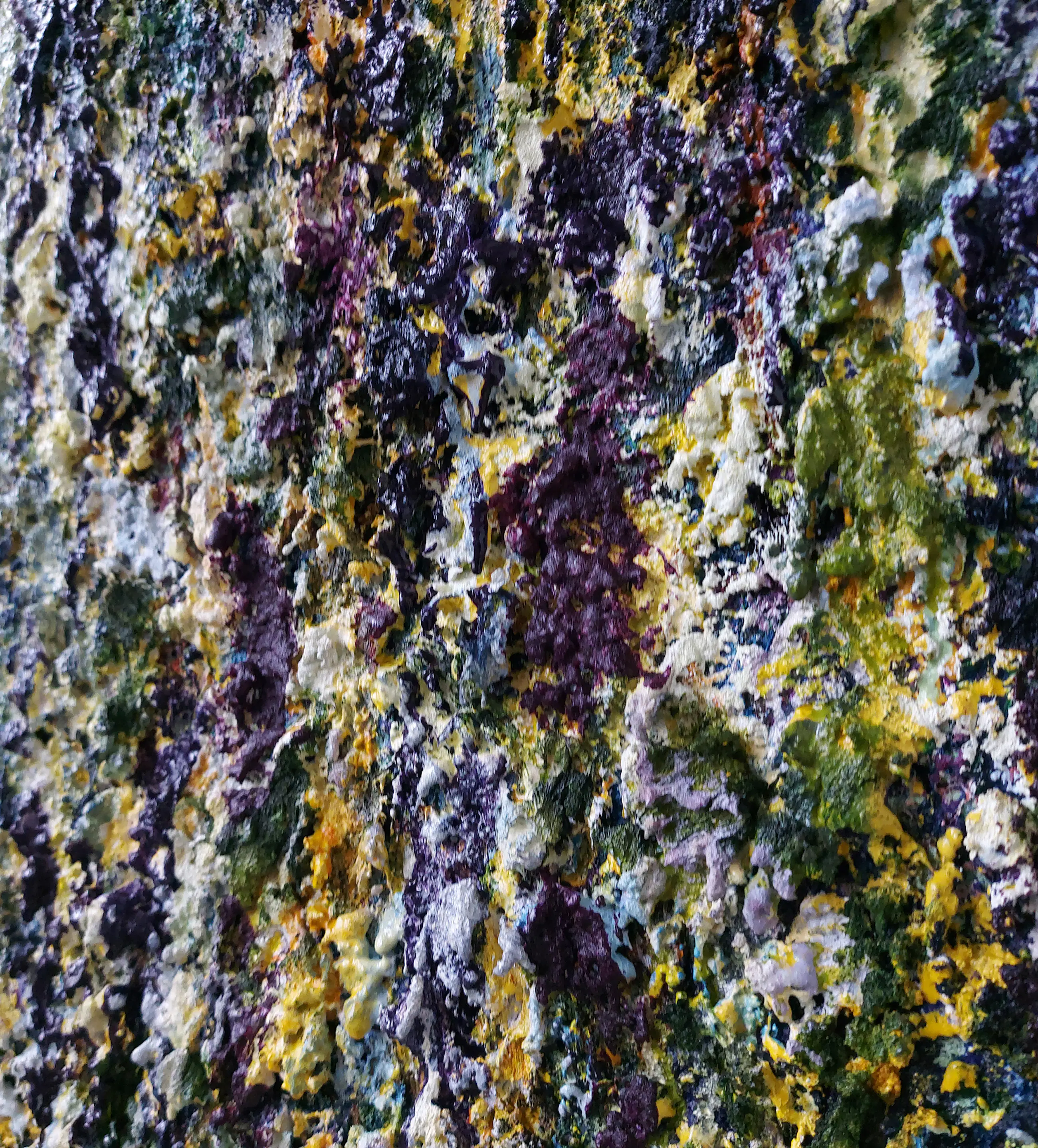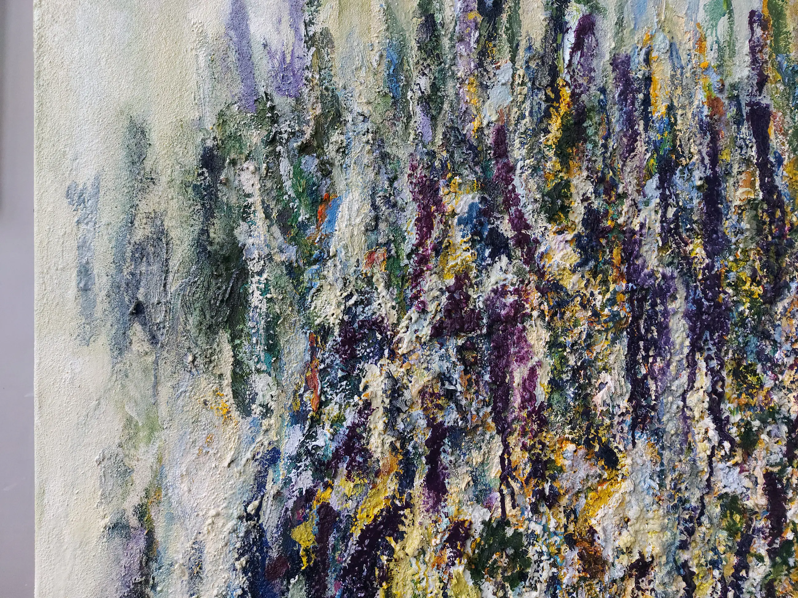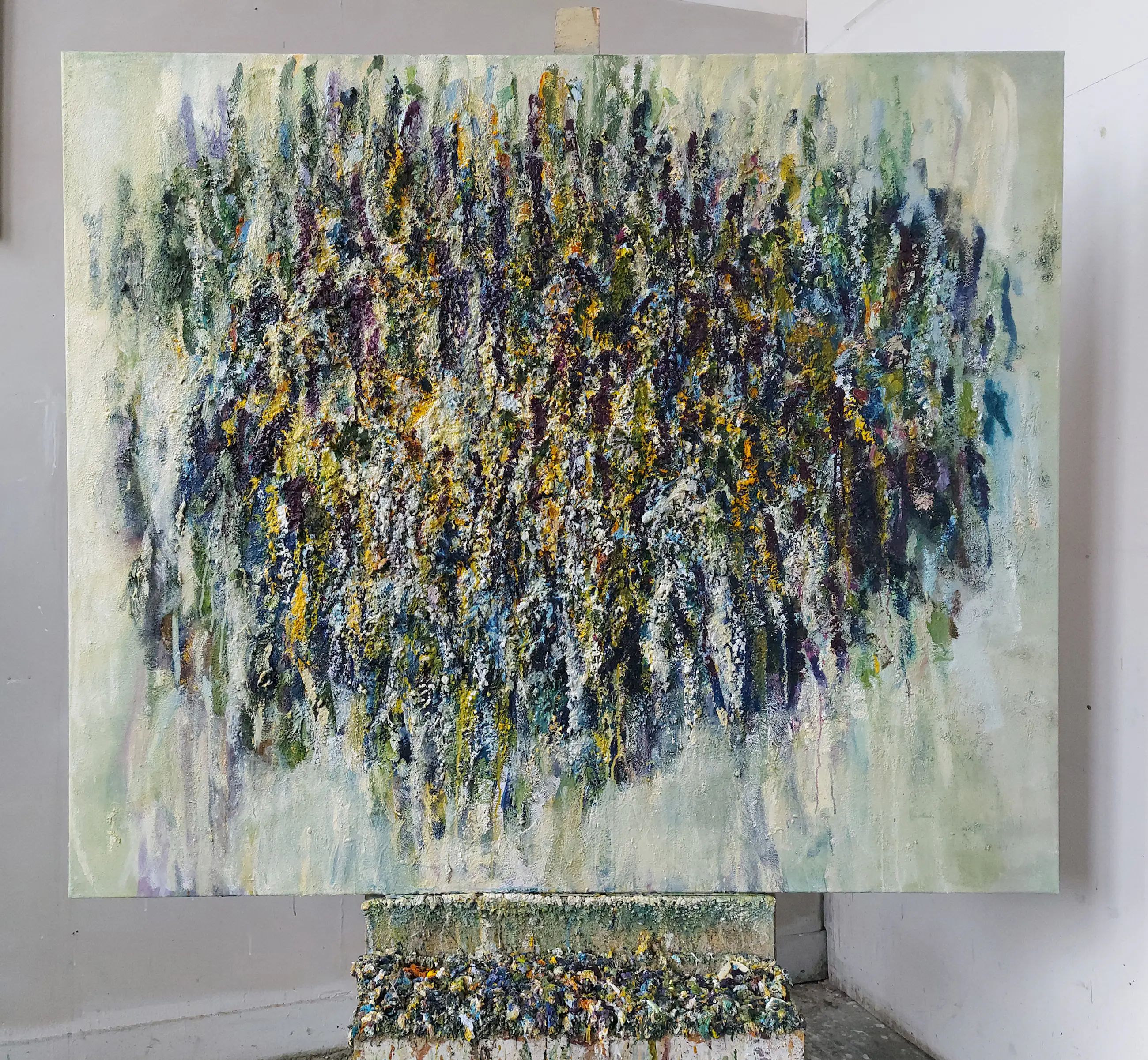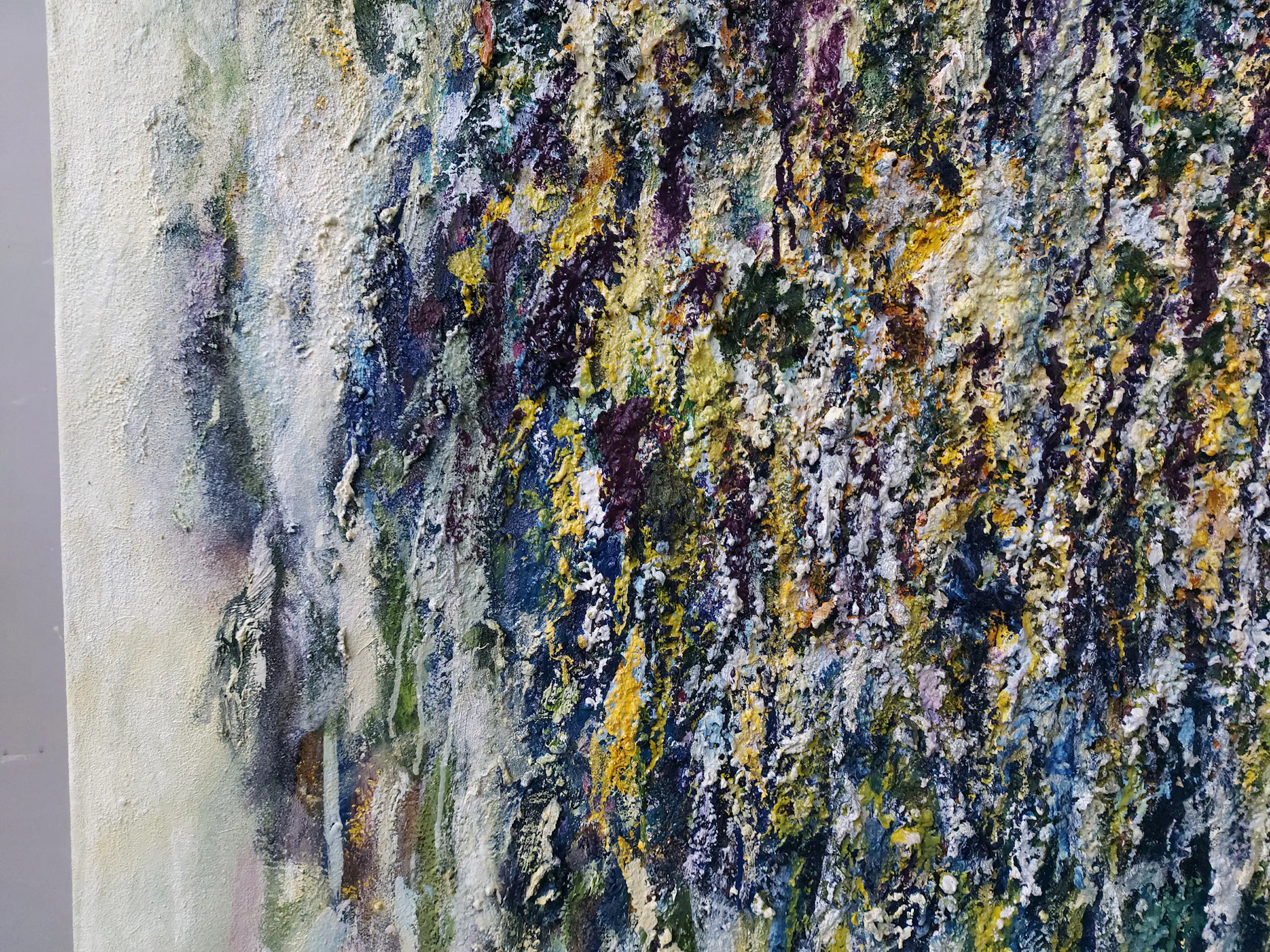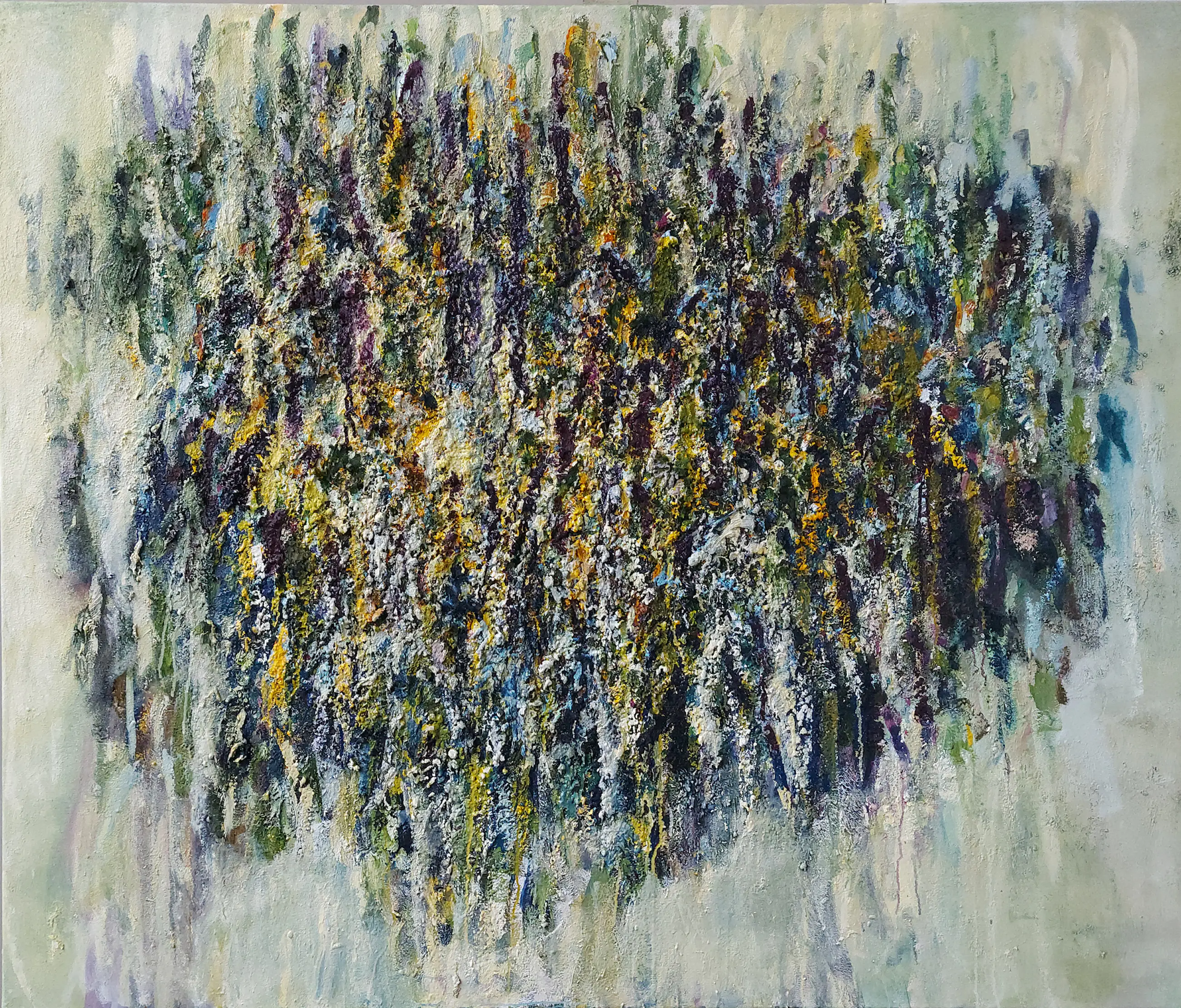 Olieverf met zand op doek. Door zijn verfbehandeling met vele vele lagen verf hebben veel van de schilderijen van Gerard Strik een bijna geboetseerde oppervlaktestructuur. Het zand dat hij aan zijn olieverf toevoegt, is niet alleen voor de structuur; het maakt zijn verf ‘aards’. Het geabstraheerde landschap wordt voelbaar.