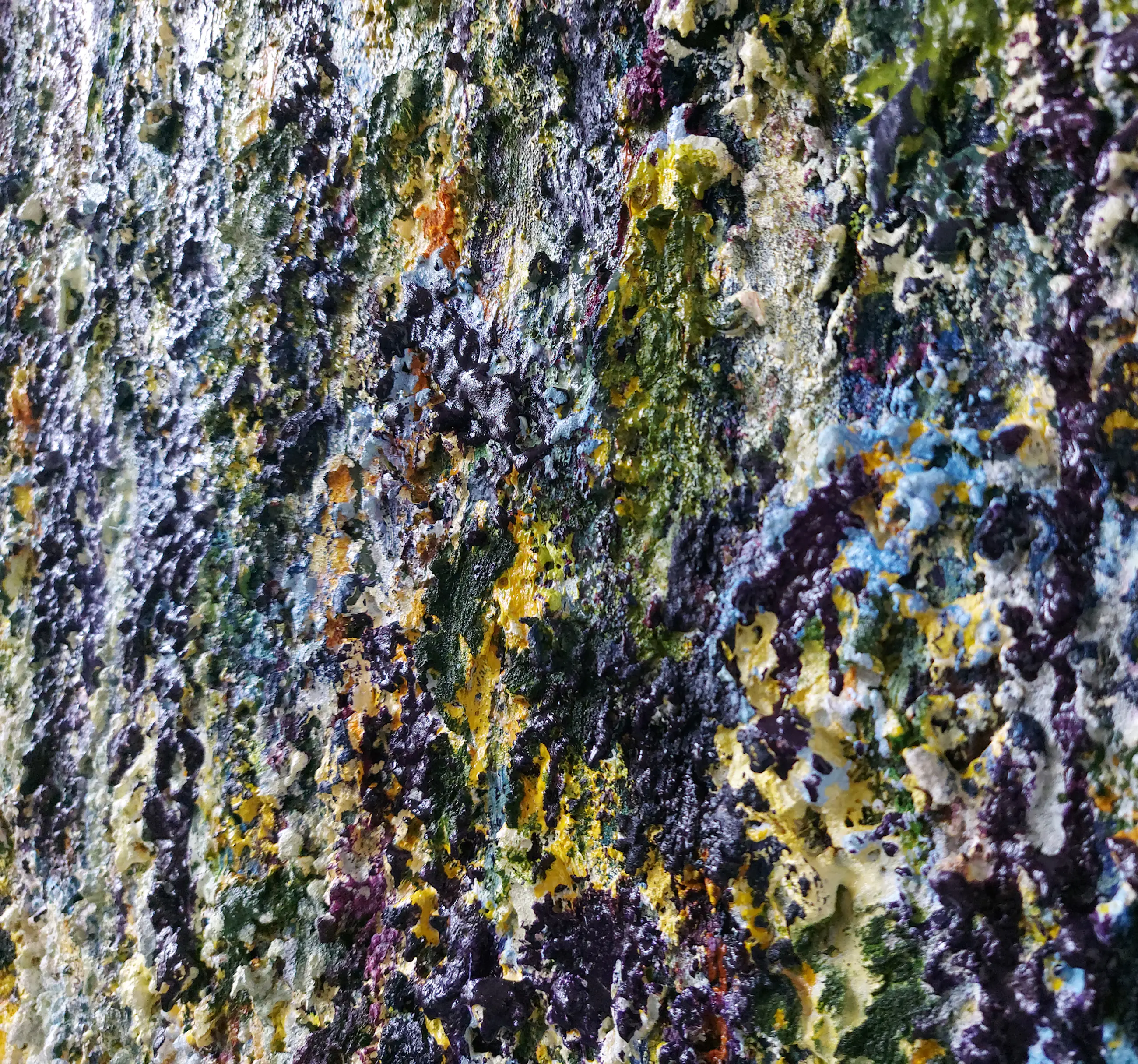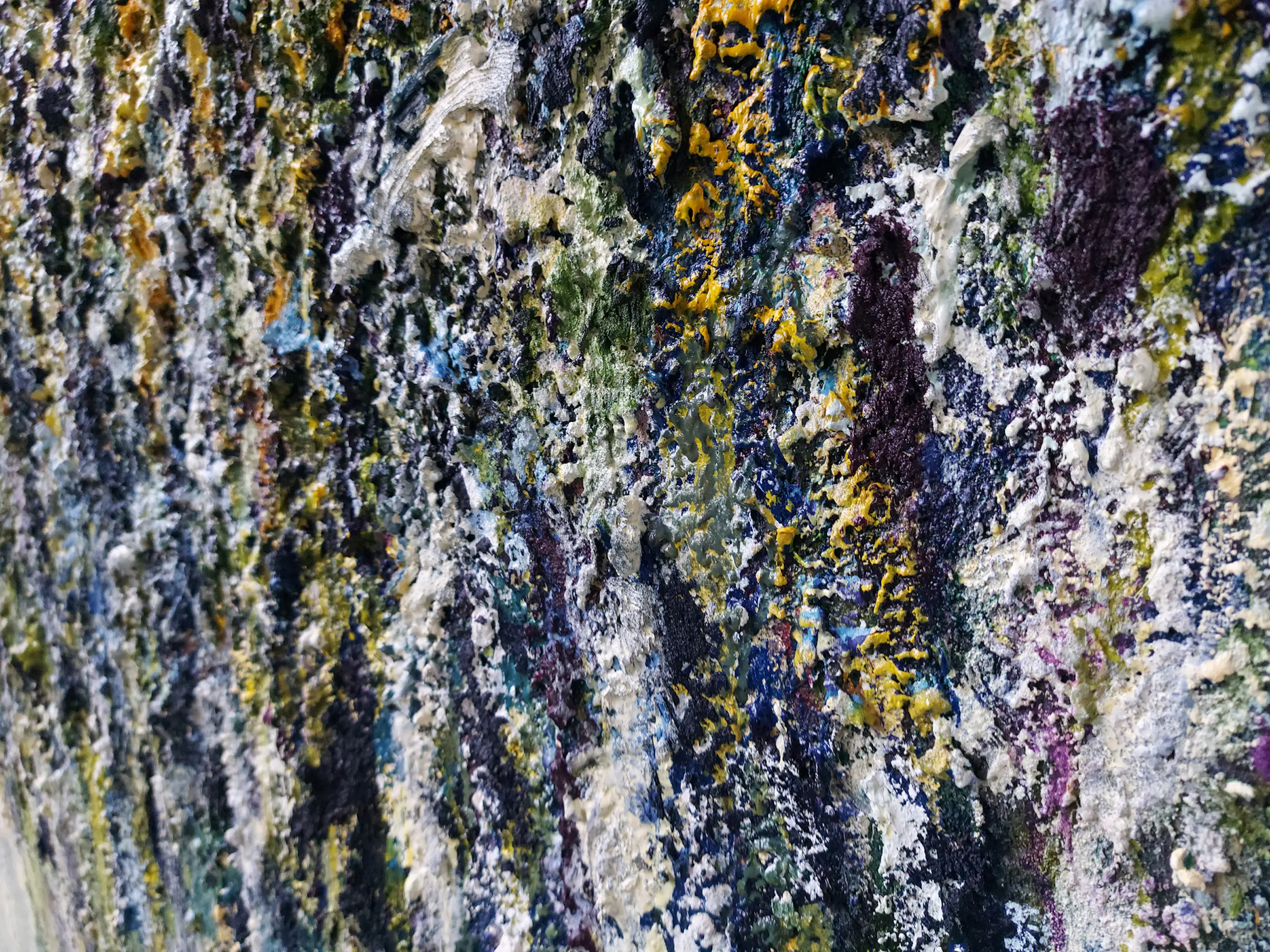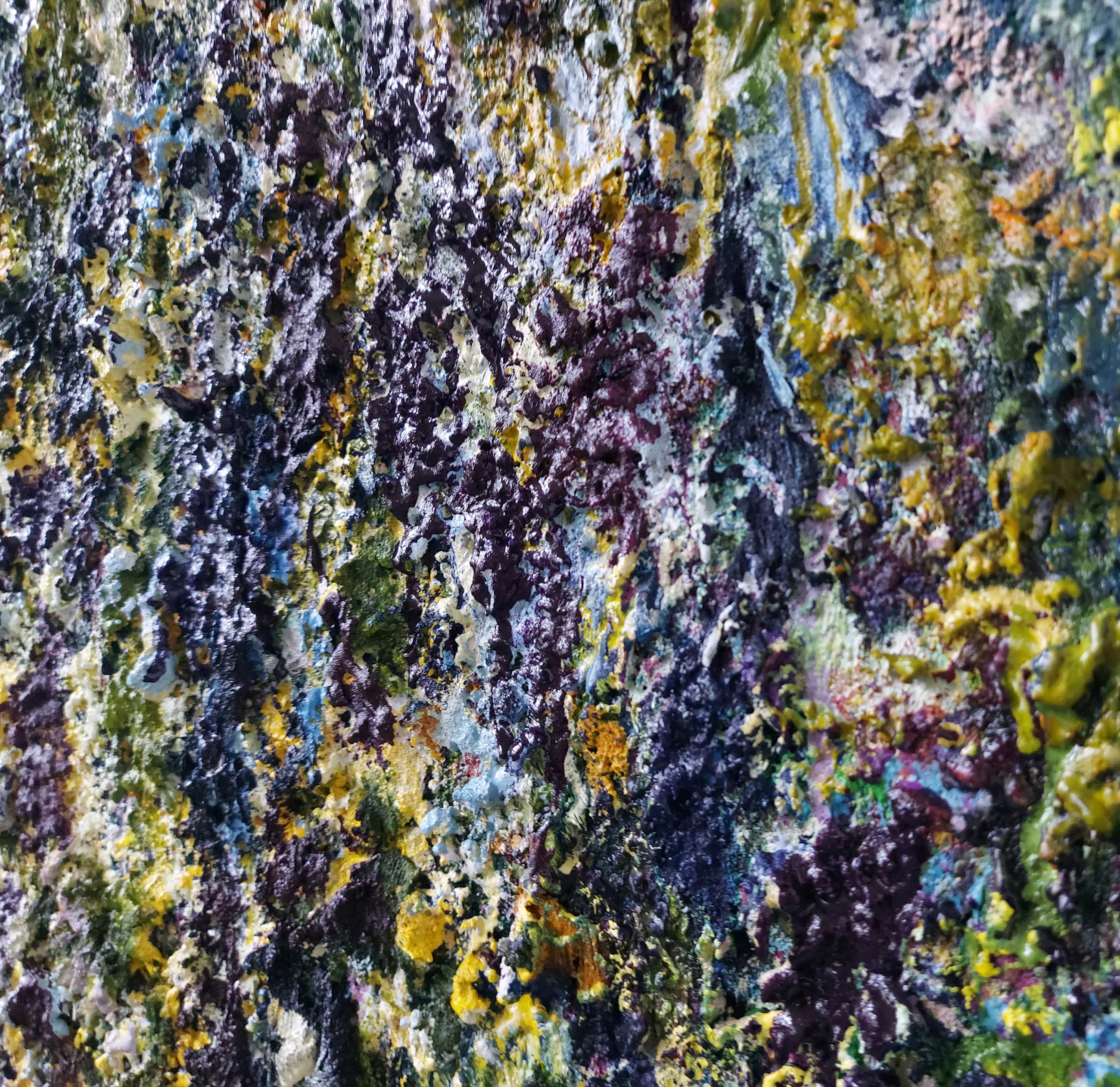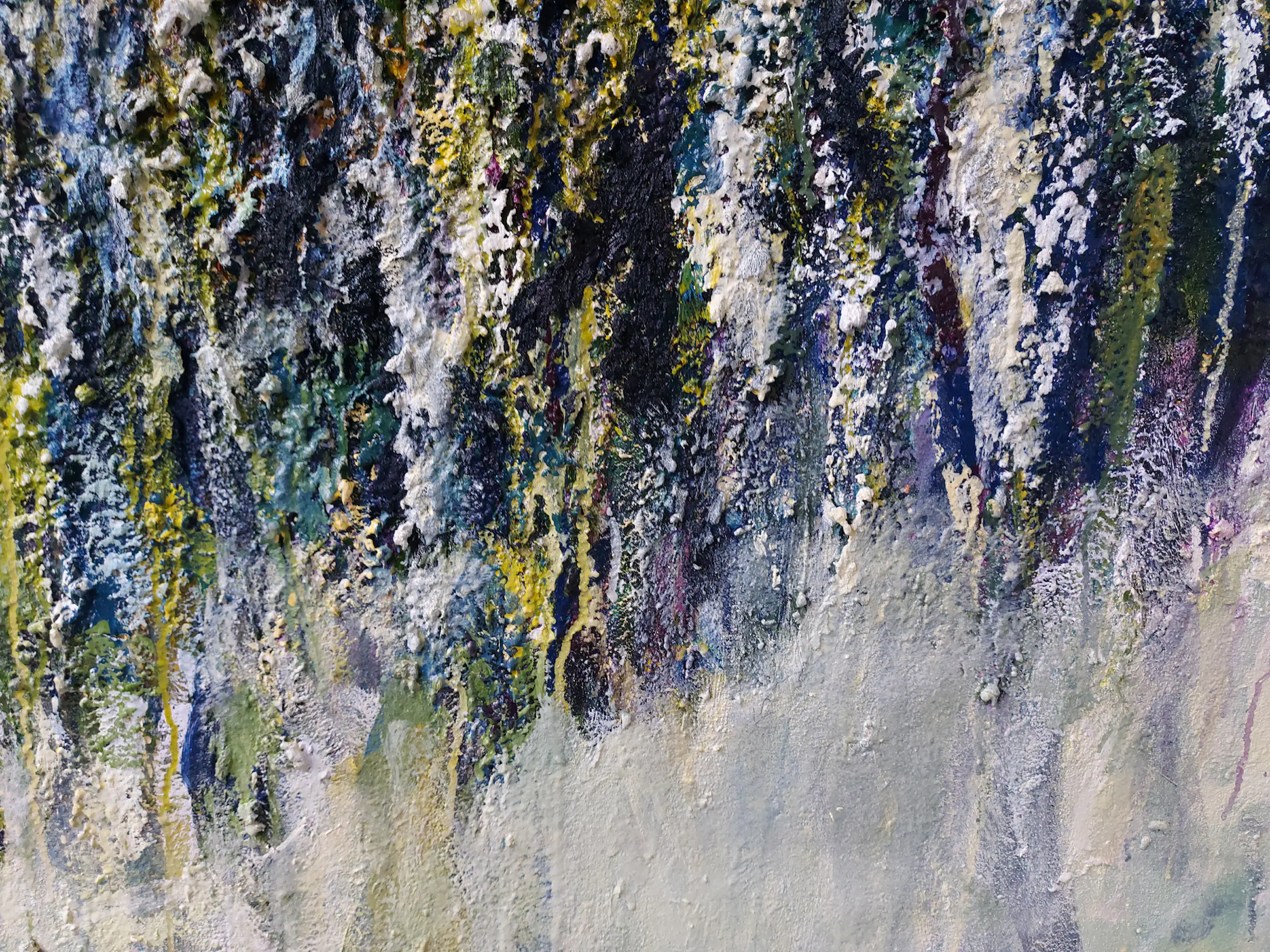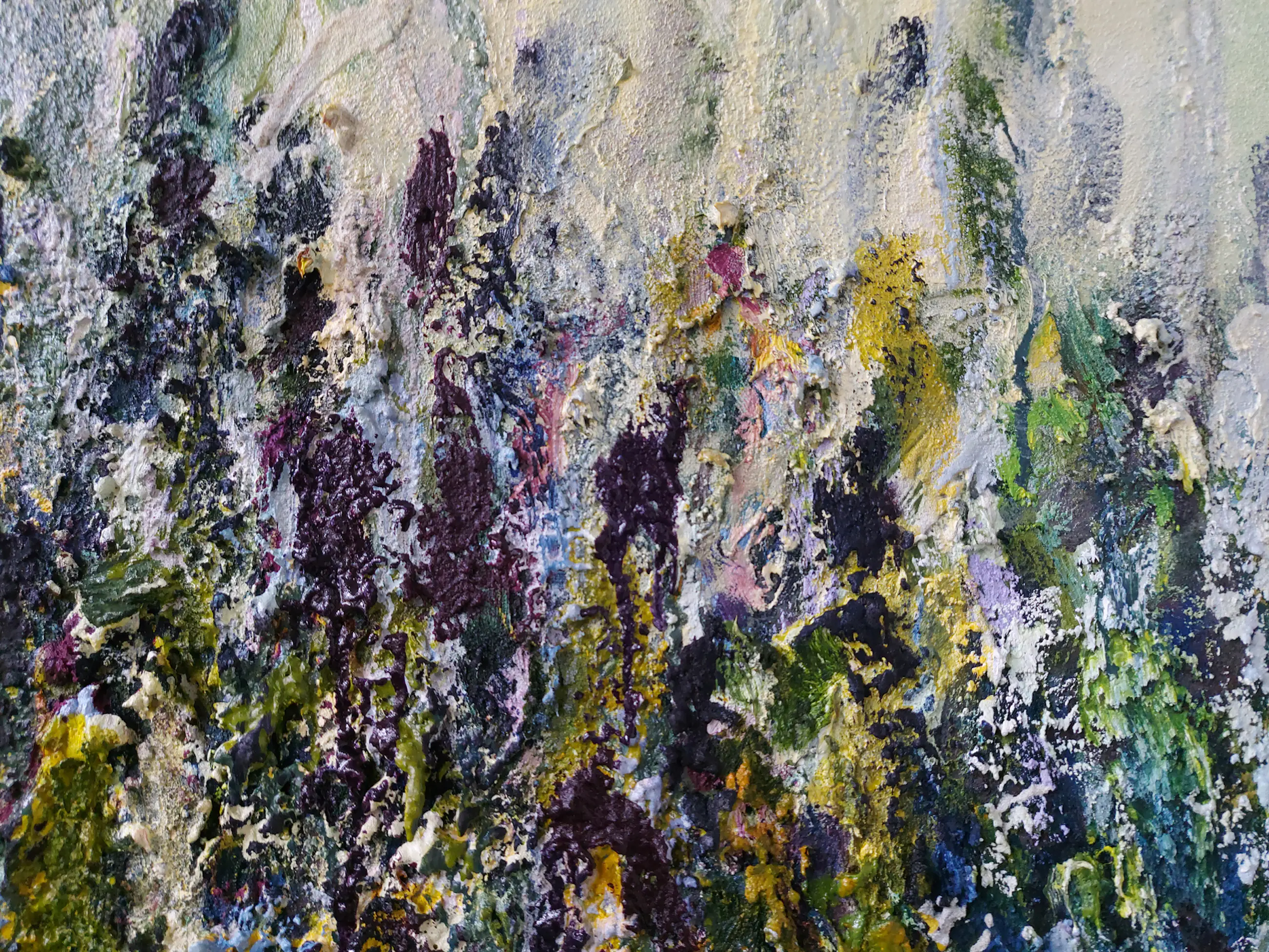 Olieverf met zand op doek. Door zijn verfbehandeling met vele vele lagen verf hebben veel van de schilderijen van Gerard Strik een bijna geboetseerde oppervlaktestructuur. Het zand dat hij aan zijn olieverf toevoegt, is niet alleen voor de structuur; het maakt zijn verf ‘aards’. Het geabstraheerde landschap wordt voelbaar.