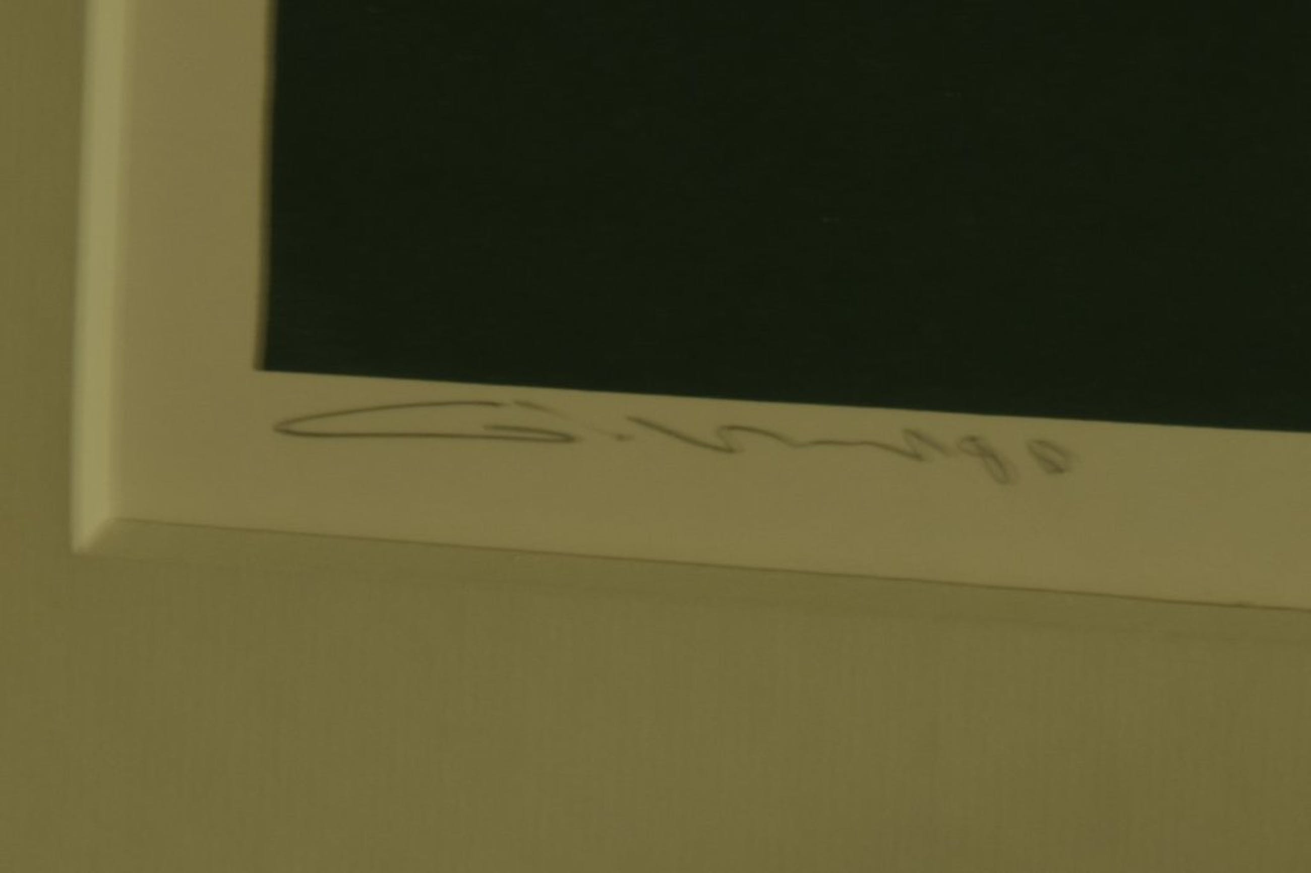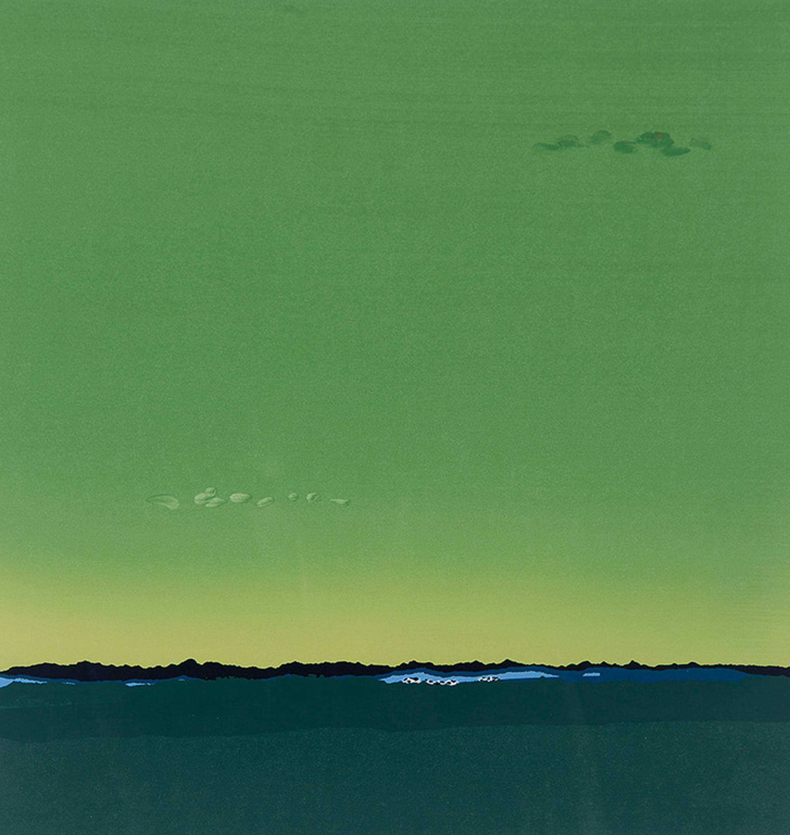 Proefdruk van Gerard 't Hart getiteld Landschap groen uit 1988. Op deze proefdruk heeft de kunstenaar met acrylverf op verschillende plekken correcties aangebracht, welke in latere drukken zijn doorgevoerd. Een interessant en uniek exemplaar.