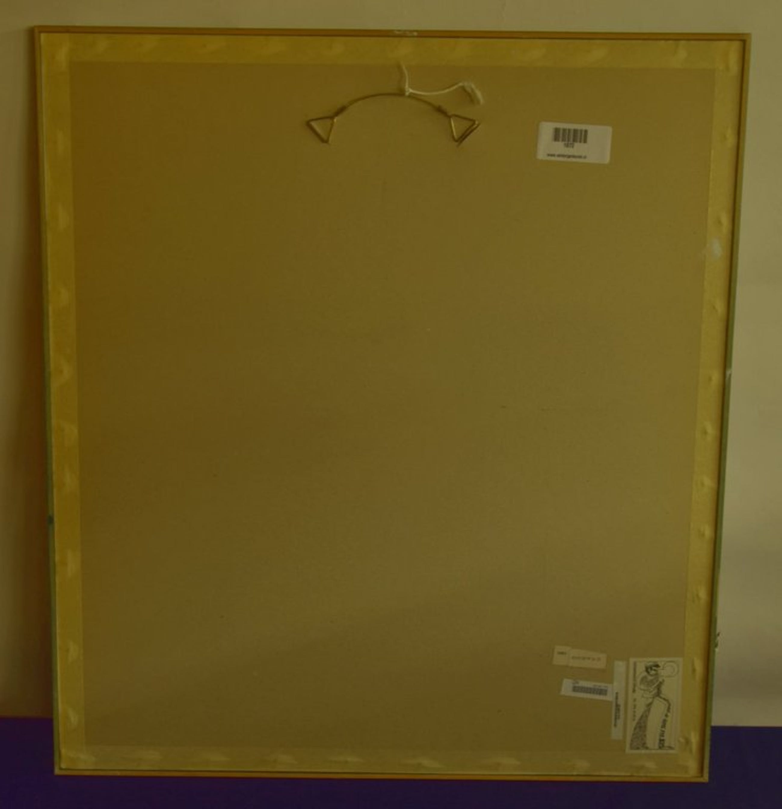 Het werk is ingelijst in een in bijpassend gekleurde houten lijst met passe-partout en voorzien van glasplaat.