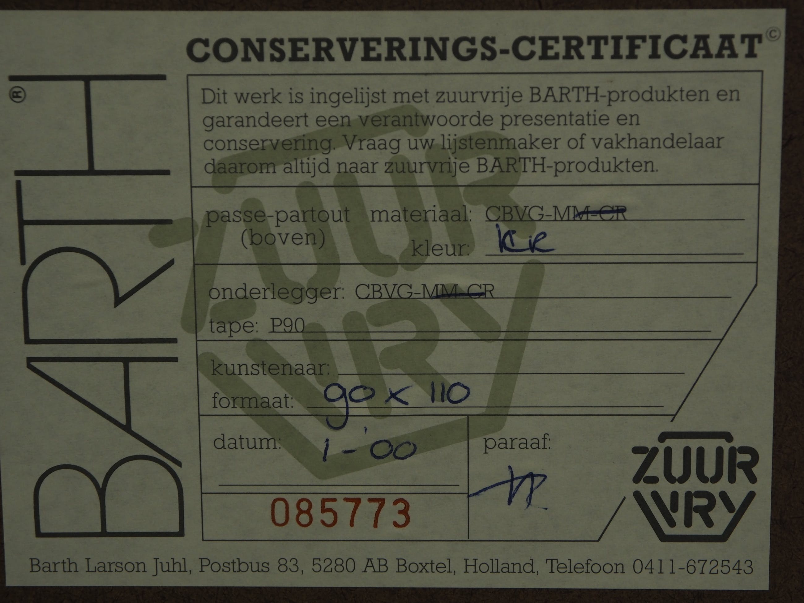 Handgeschept papier. In houten lijst. Met Barth certificaat.