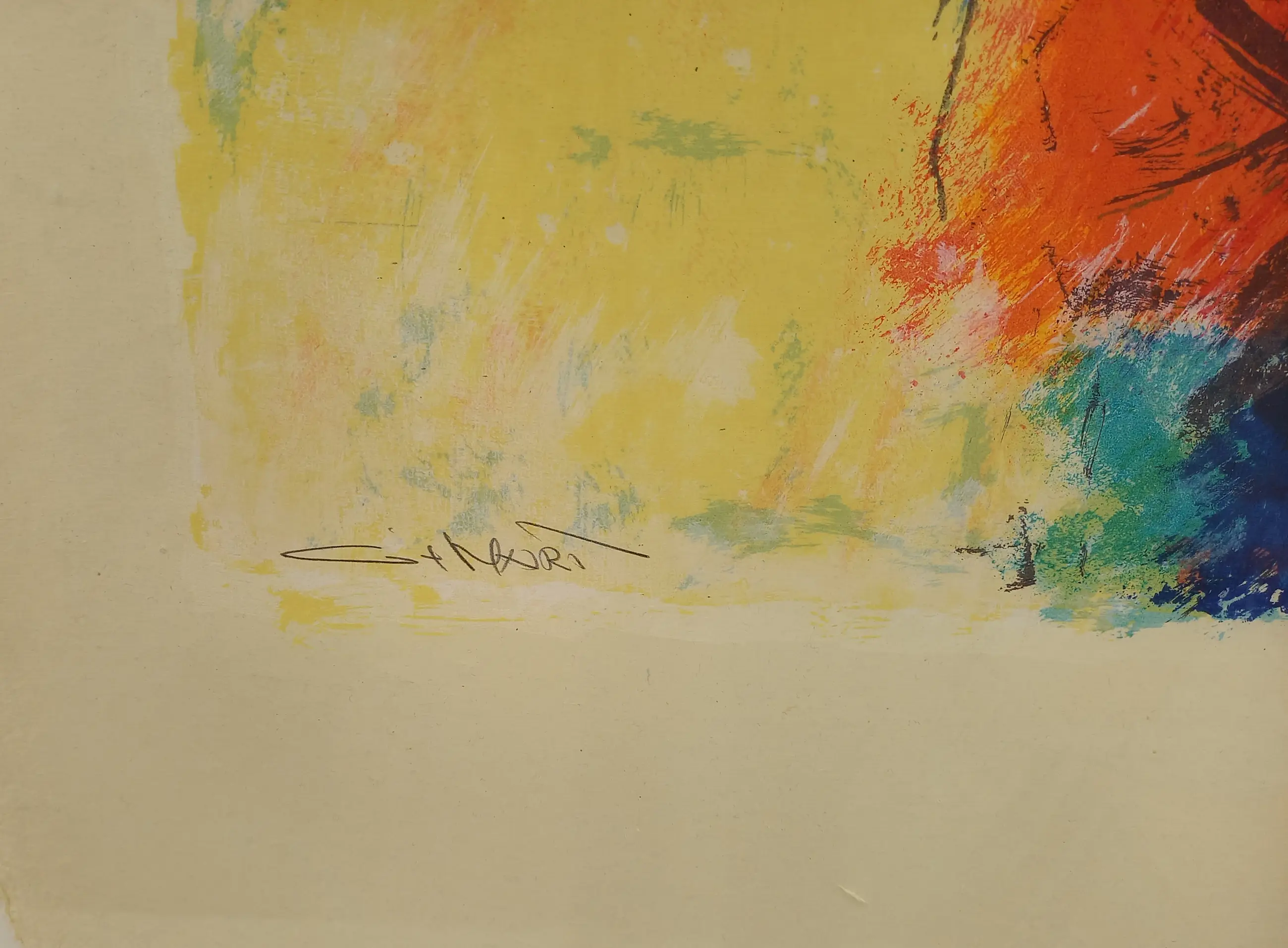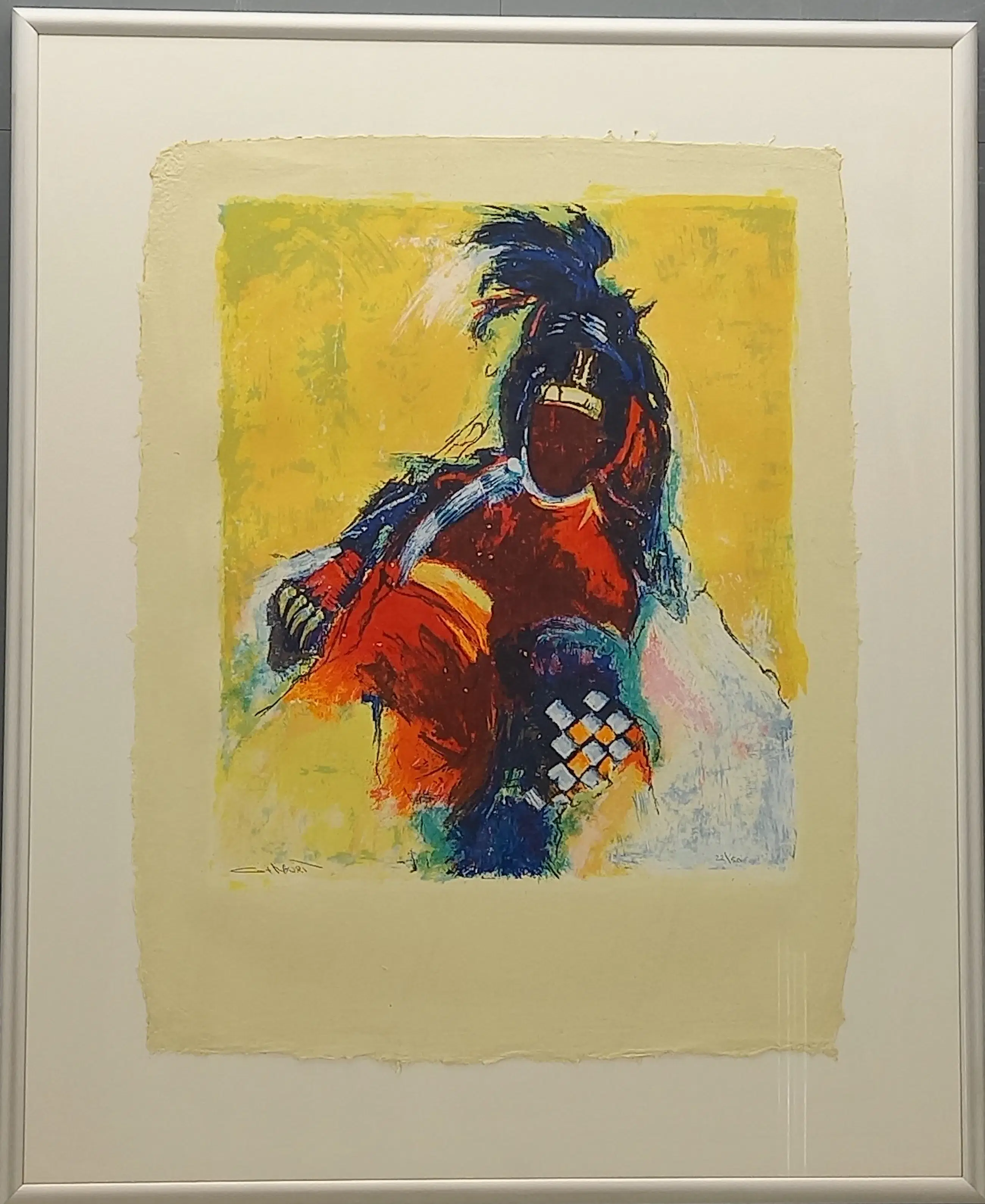 Zeefdruk op handgeschept papier. In aluminium lijst.