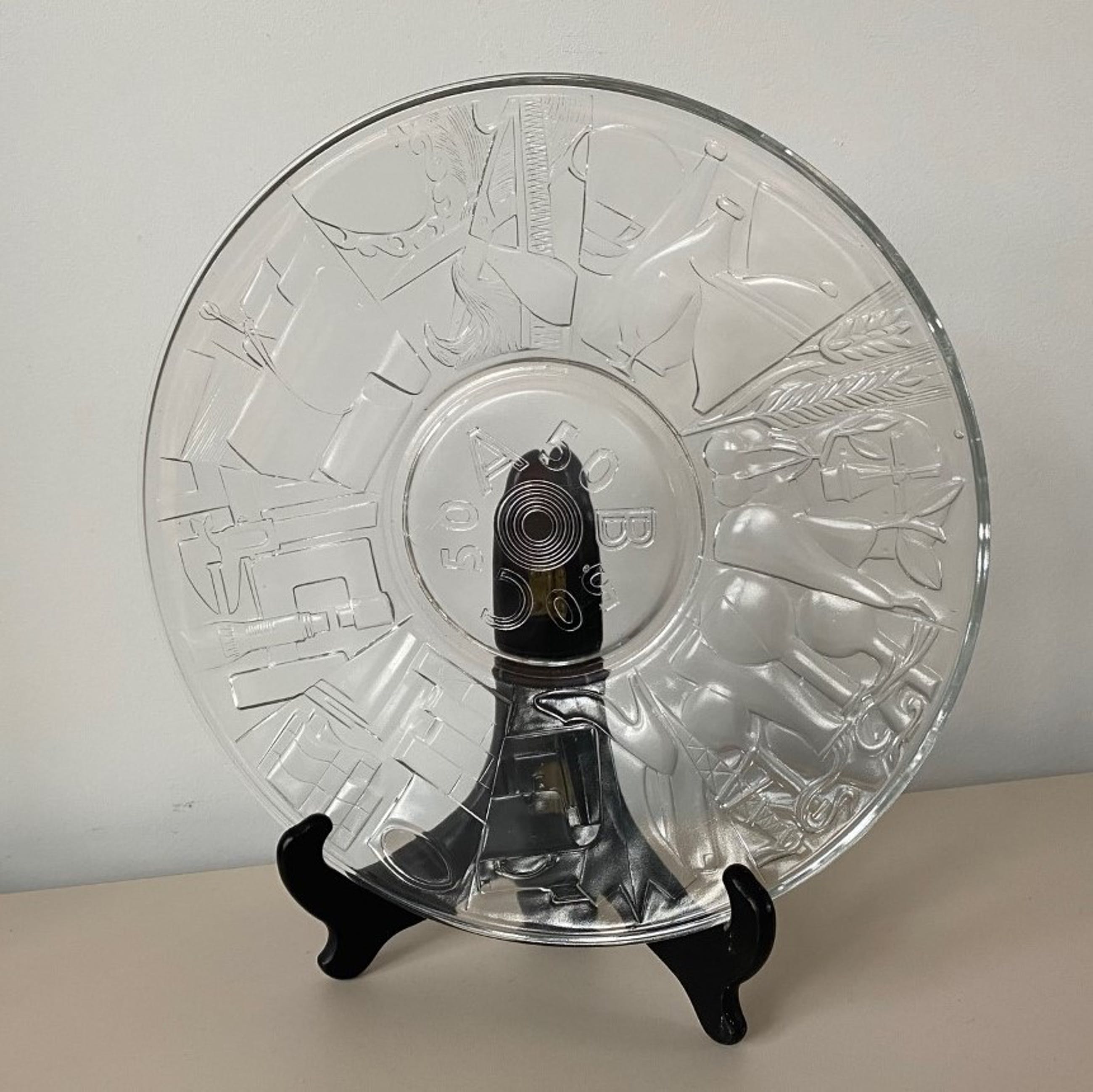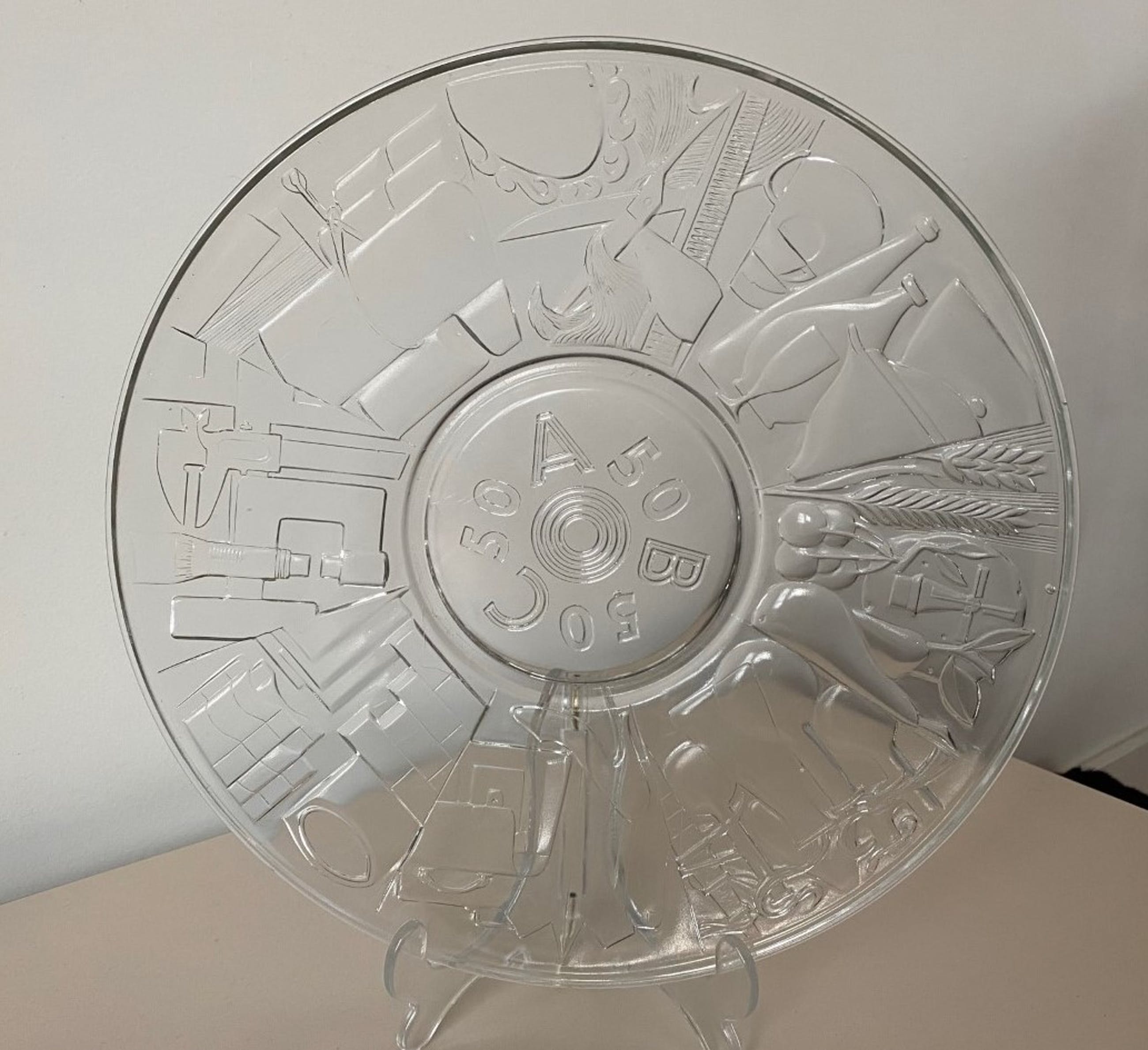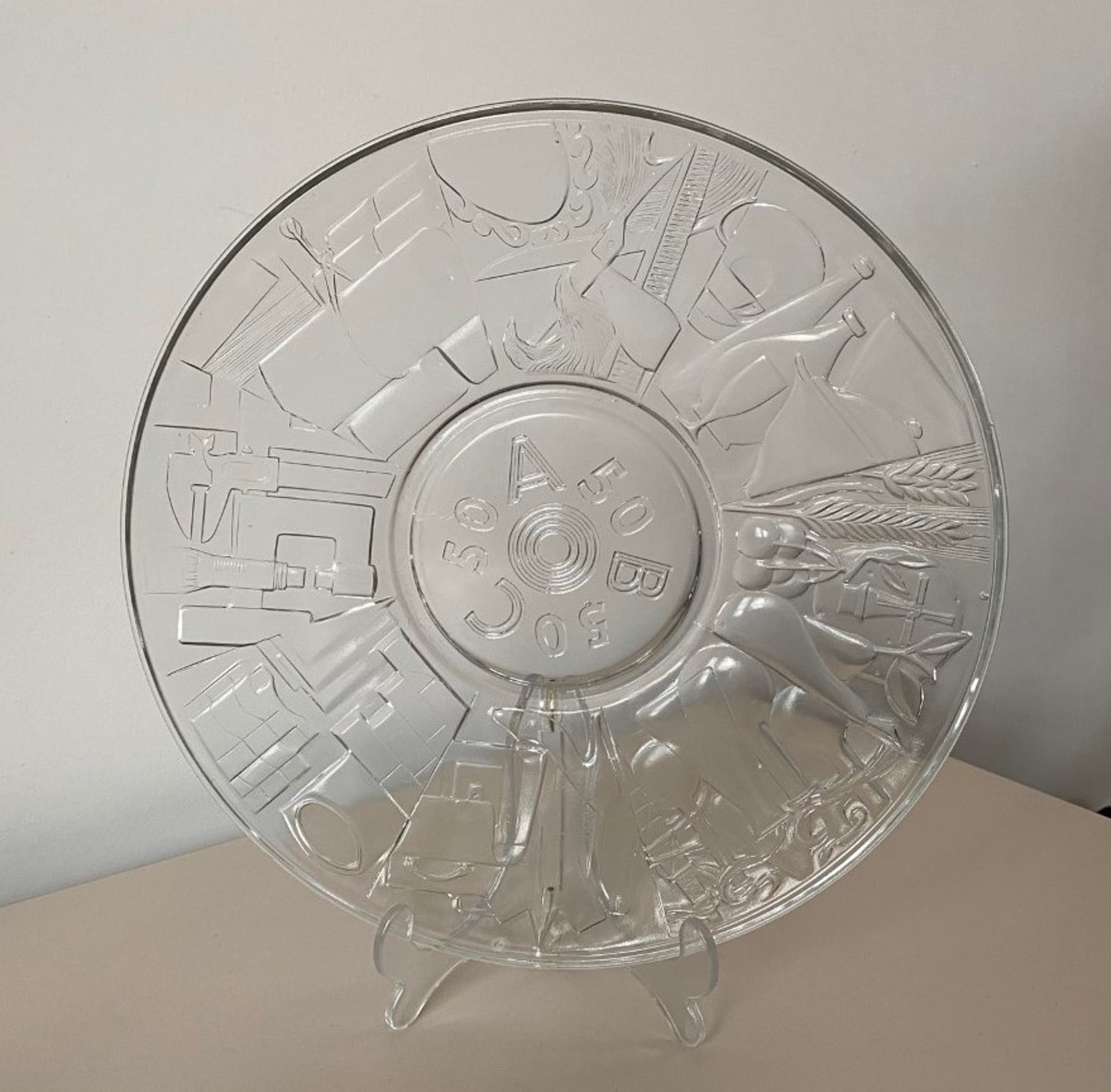De geperst glazen schaal is in 1957 vervaardigd op de afdeling Gelegenheidsglas ten behoeve van het 50 jarig bestaan van de Algemene Bedrijfsgroepen Centrale.