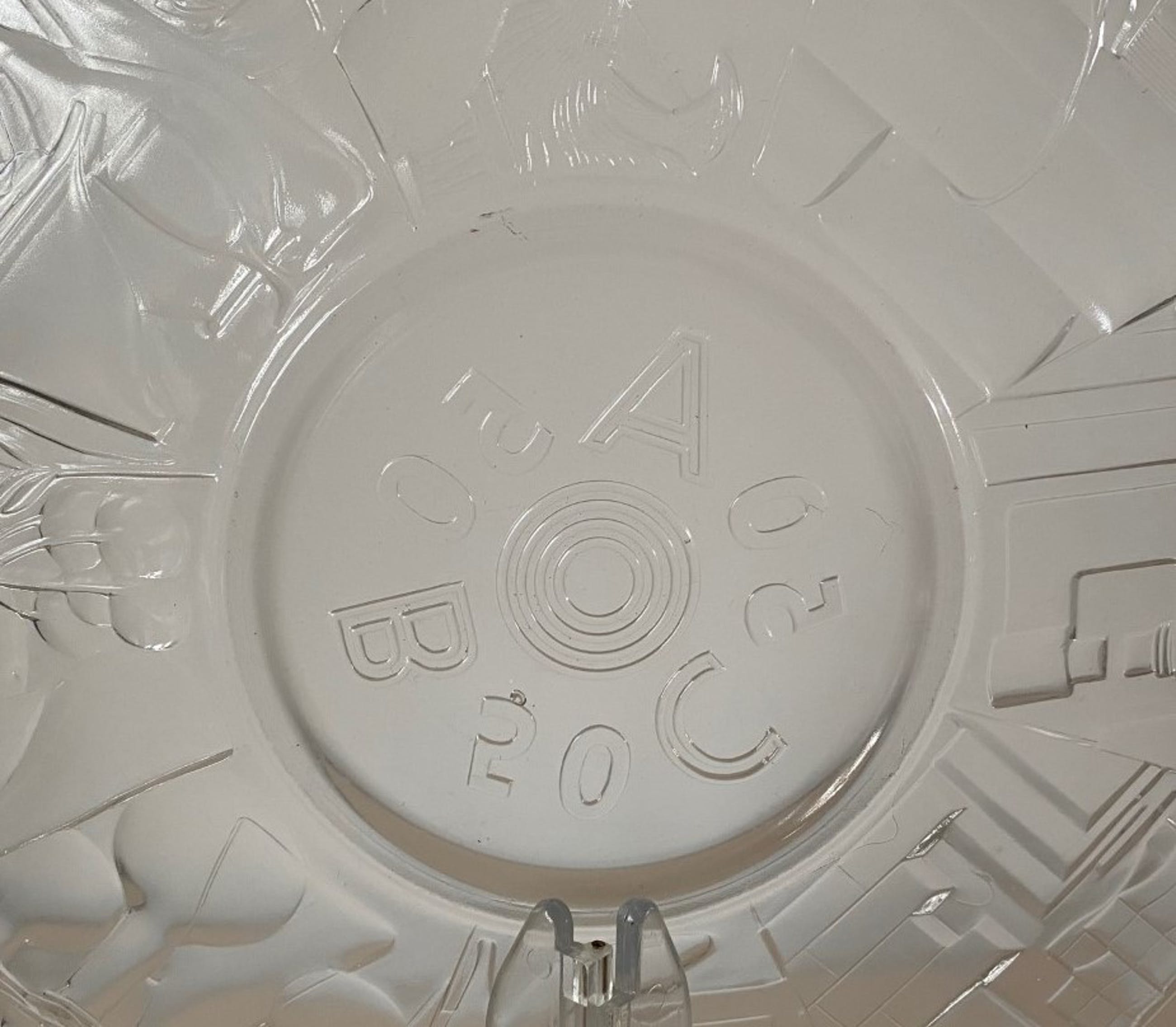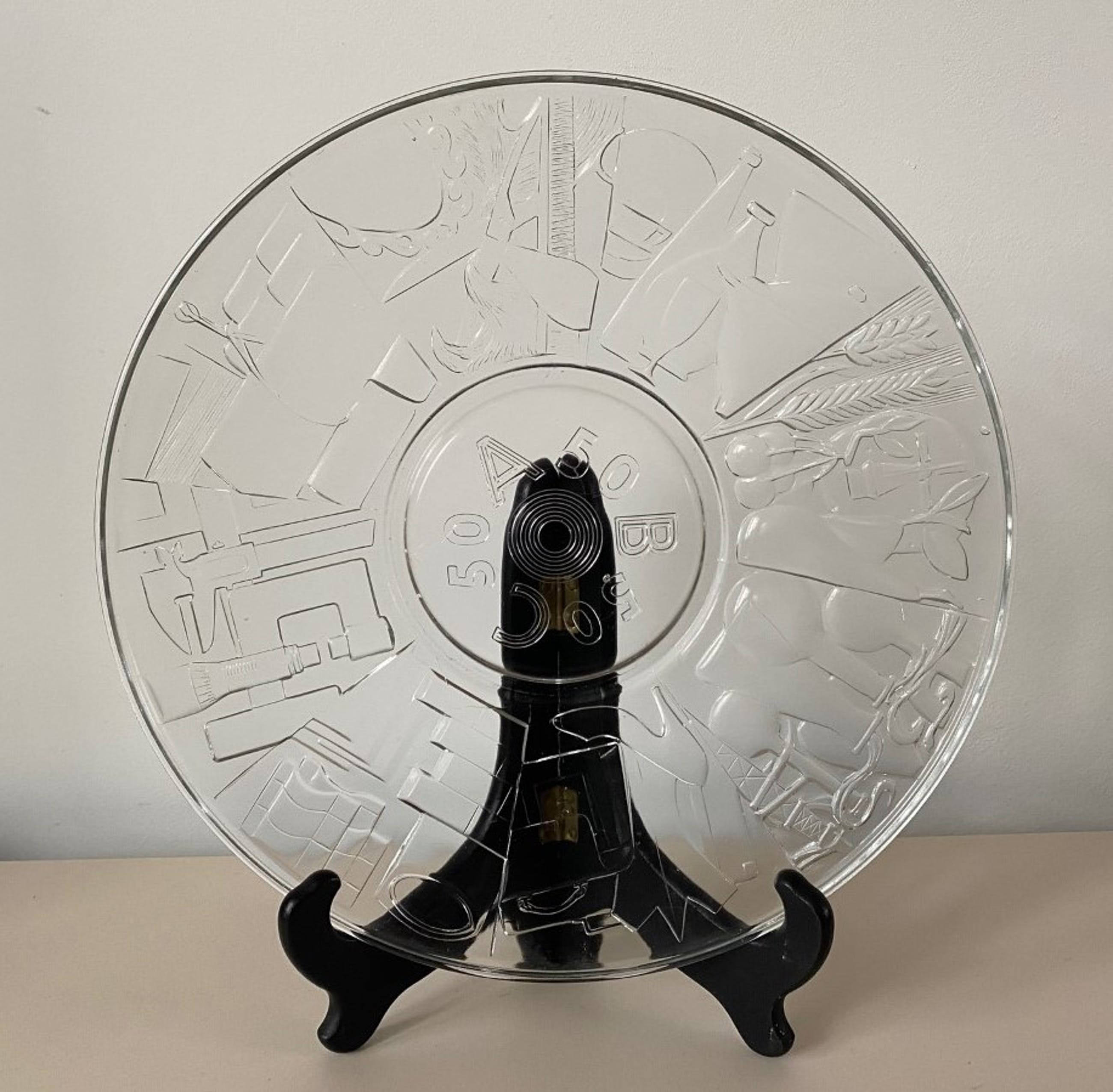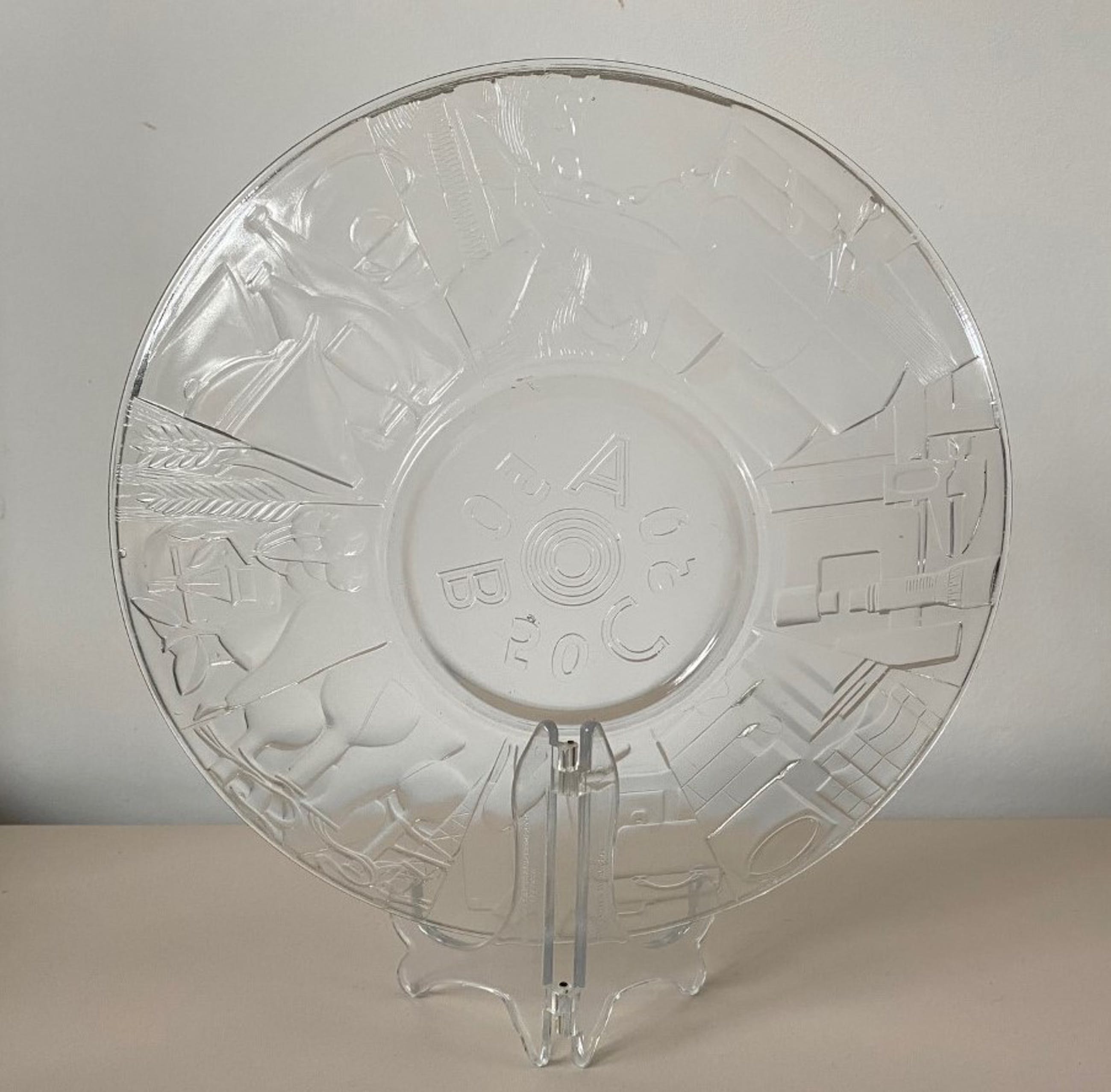 De geperst glazen schaal is in 1957 vervaardigd op de afdeling Gelegenheidsglas ten behoeve van het 50 jarig bestaan van de Algemene Bedrijfsgroepen Centrale.