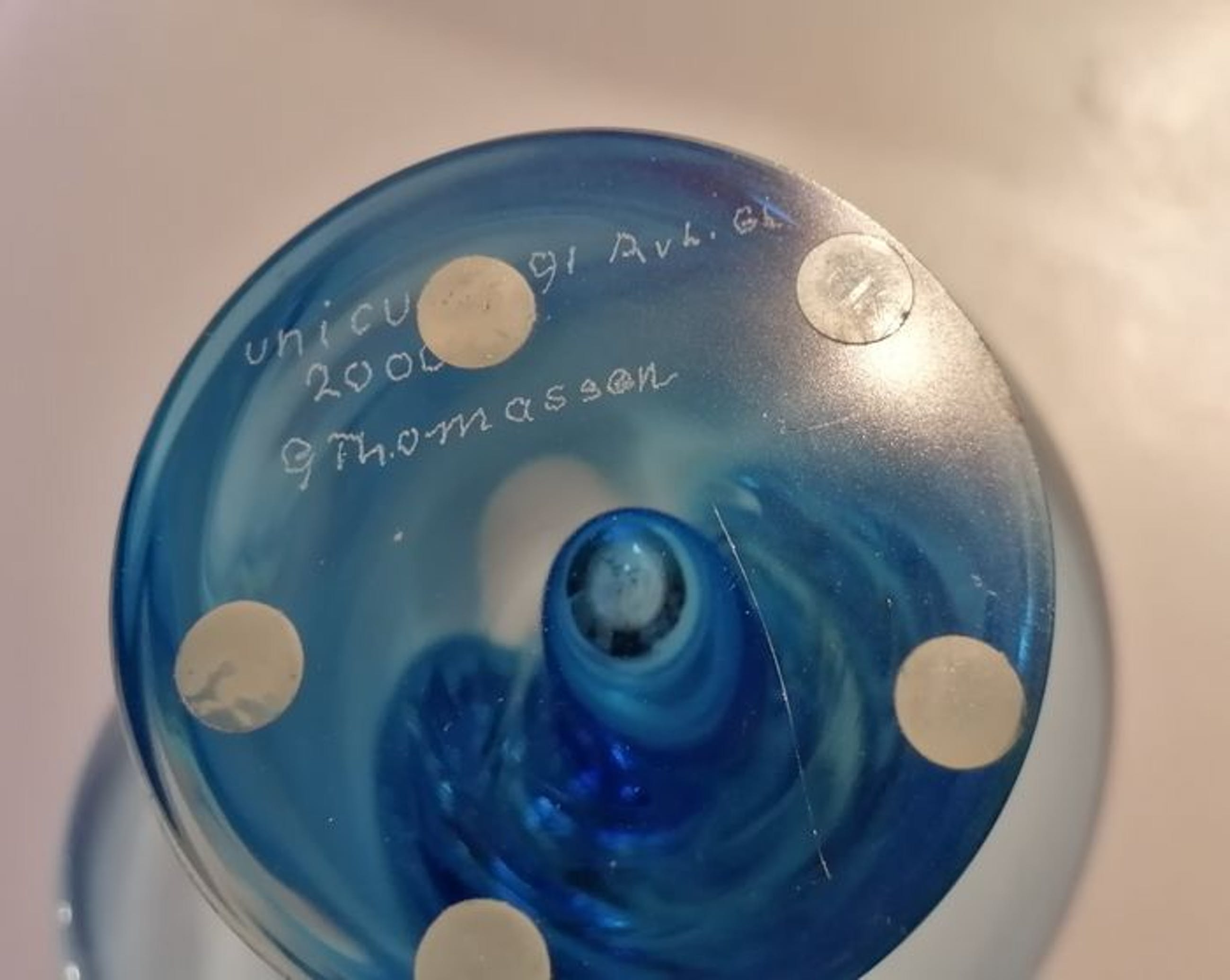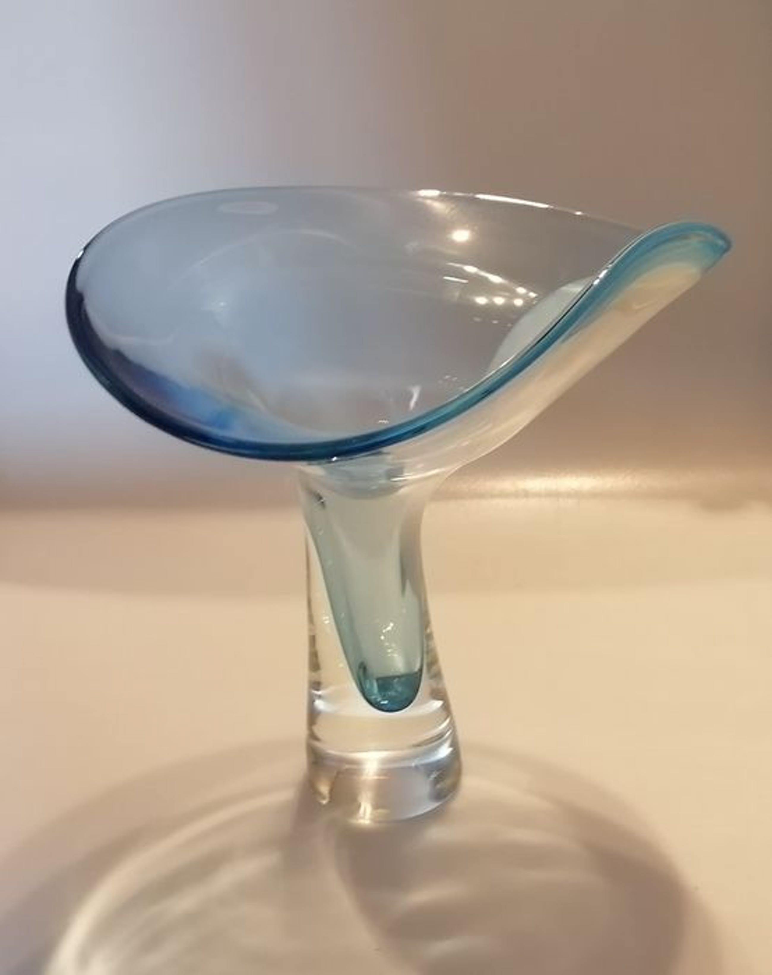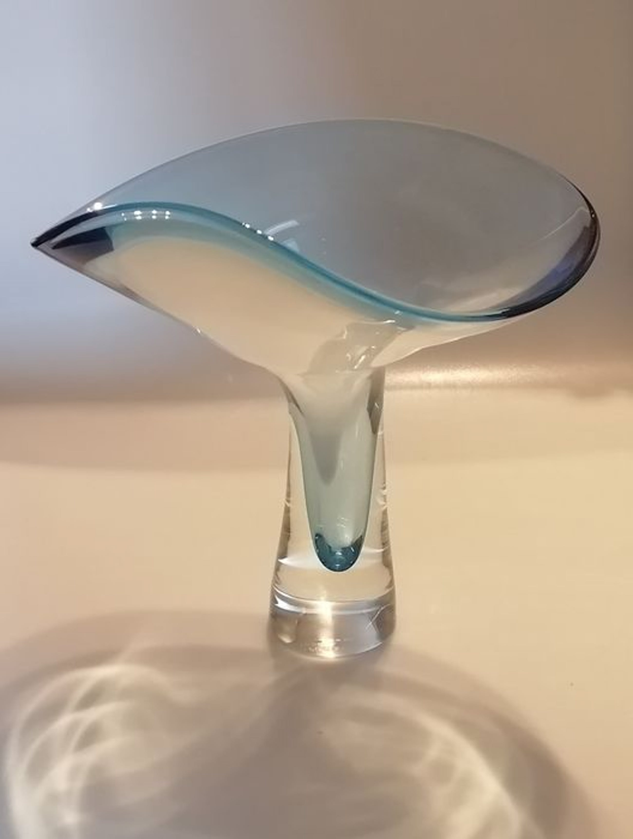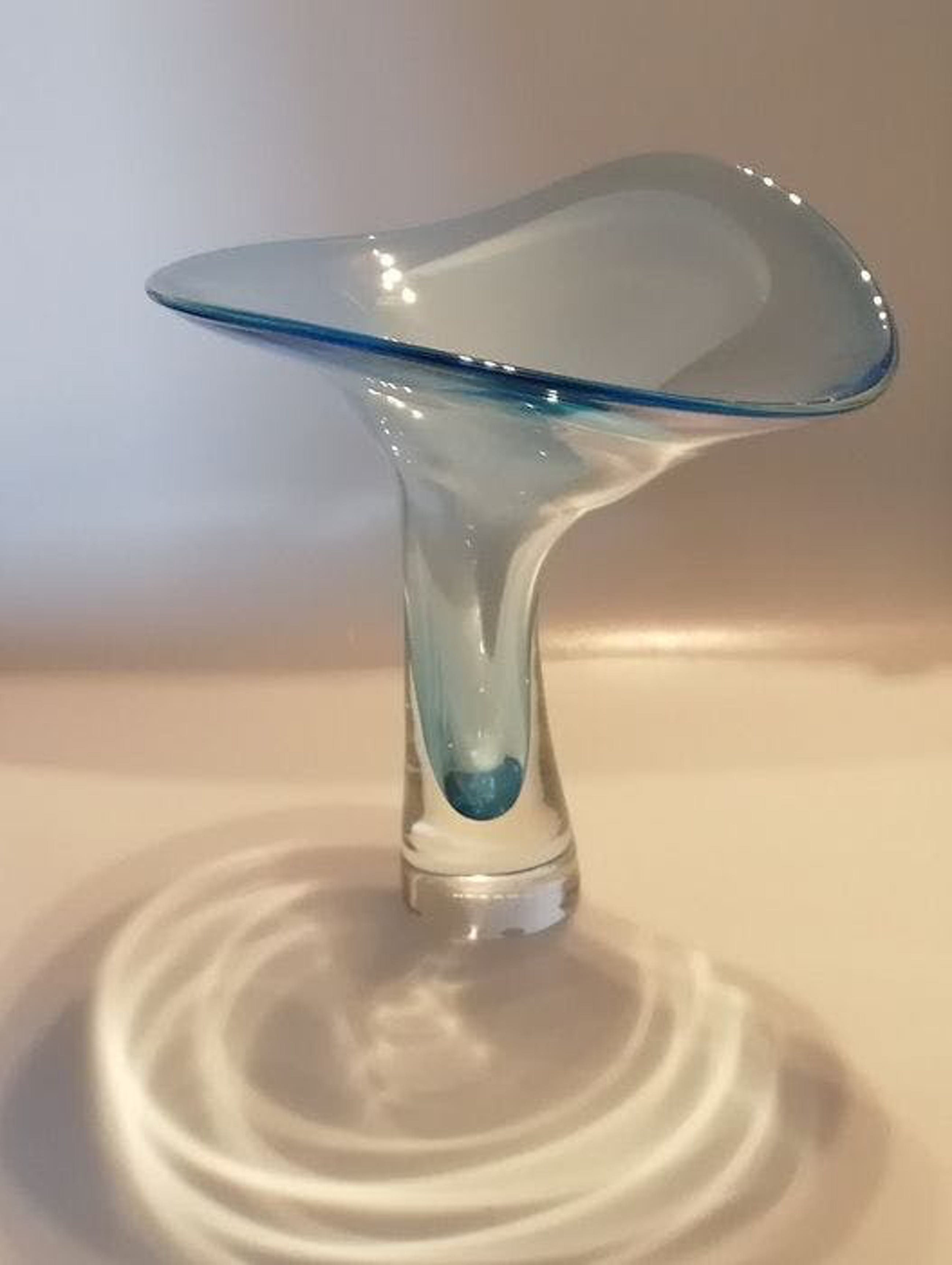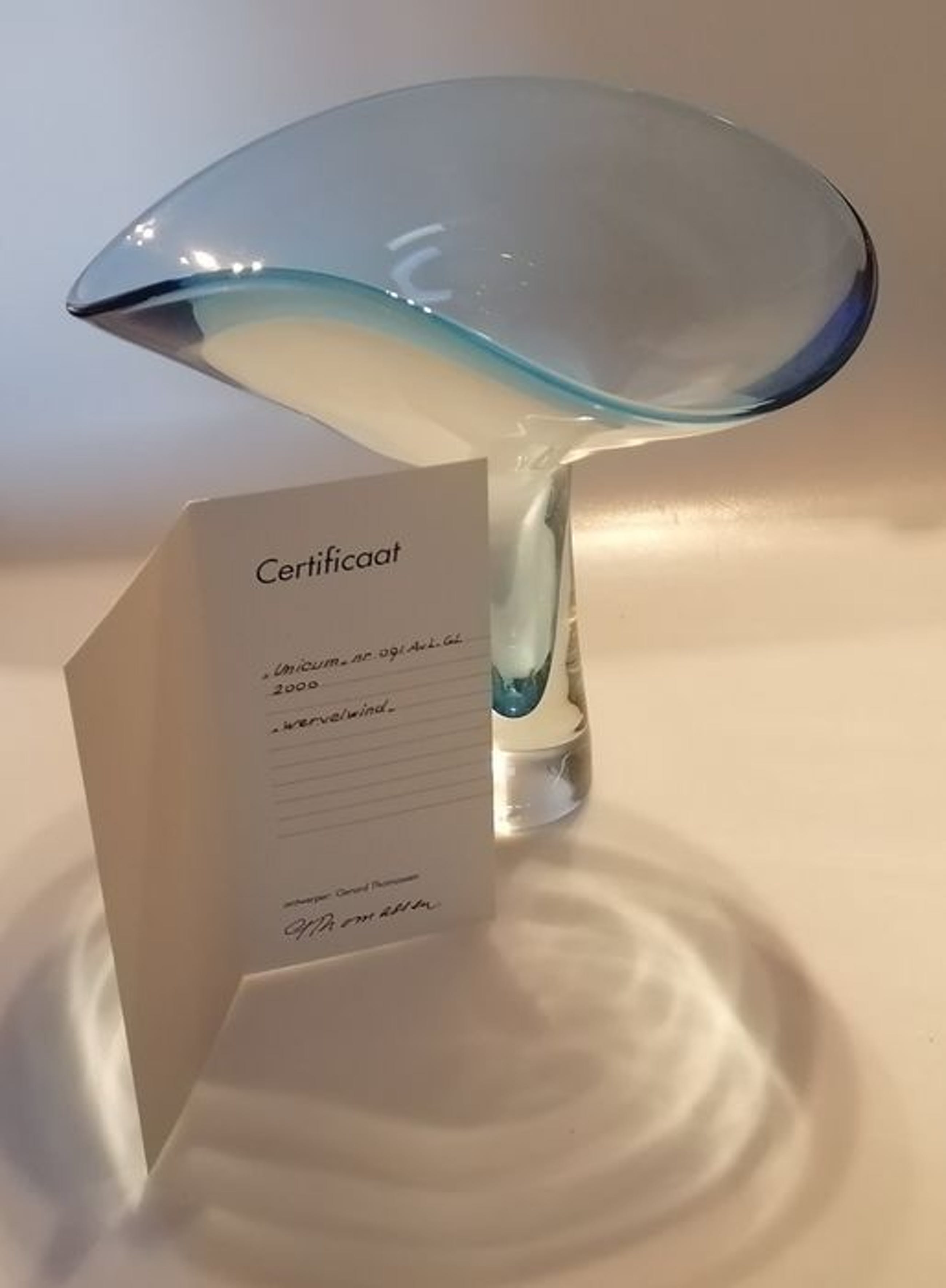 Leerdam Unicaat naar ontwerp van Gerard Thomassen, geblazen door meesterglasblazer Arie van Loopik in het jaar 2000. Werd vervaardigd in de glasblazerij van het Nationaal Glasmuseum Leerdam (Glascentrum).