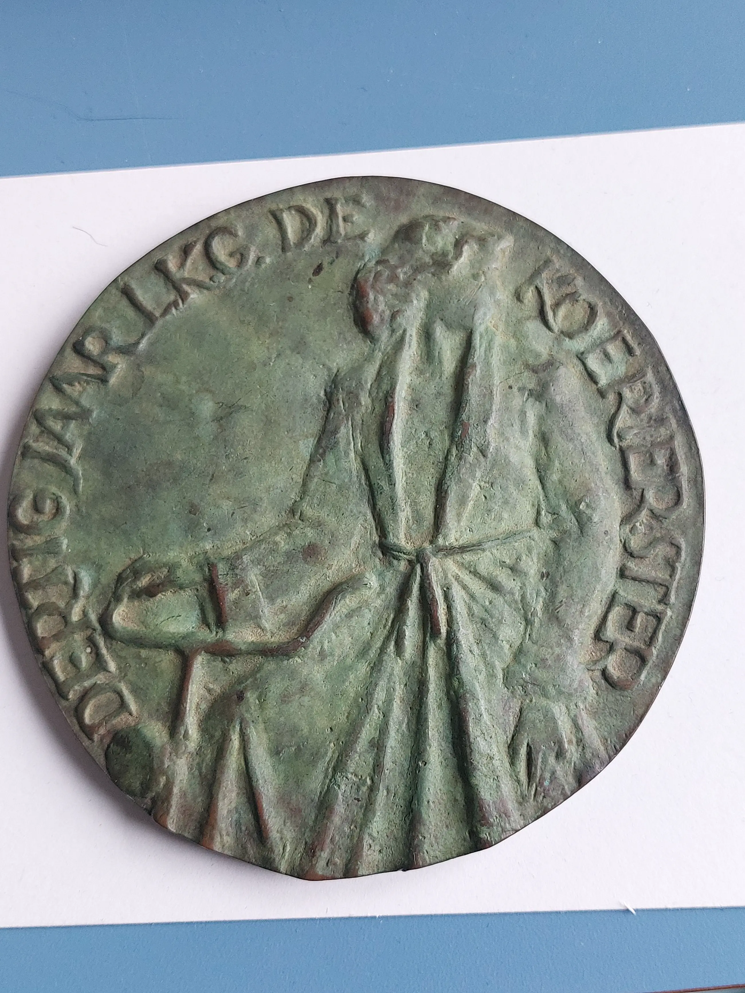 Penning ter gelegenheid van het 30-jarig bestaan van de Landelijke Kontaktgroep Verzetsgepensioneerden. Vz. Een koerierster met een fiets (Hannie Schaft). Kz. Jaartallen 1965-1995; omschrift: 'Landelijke Kontakt-groep Verzetsgepensioneerden 1940-1945'. Brons gegoten 118 mm. Deze is mooi gepatineerd.