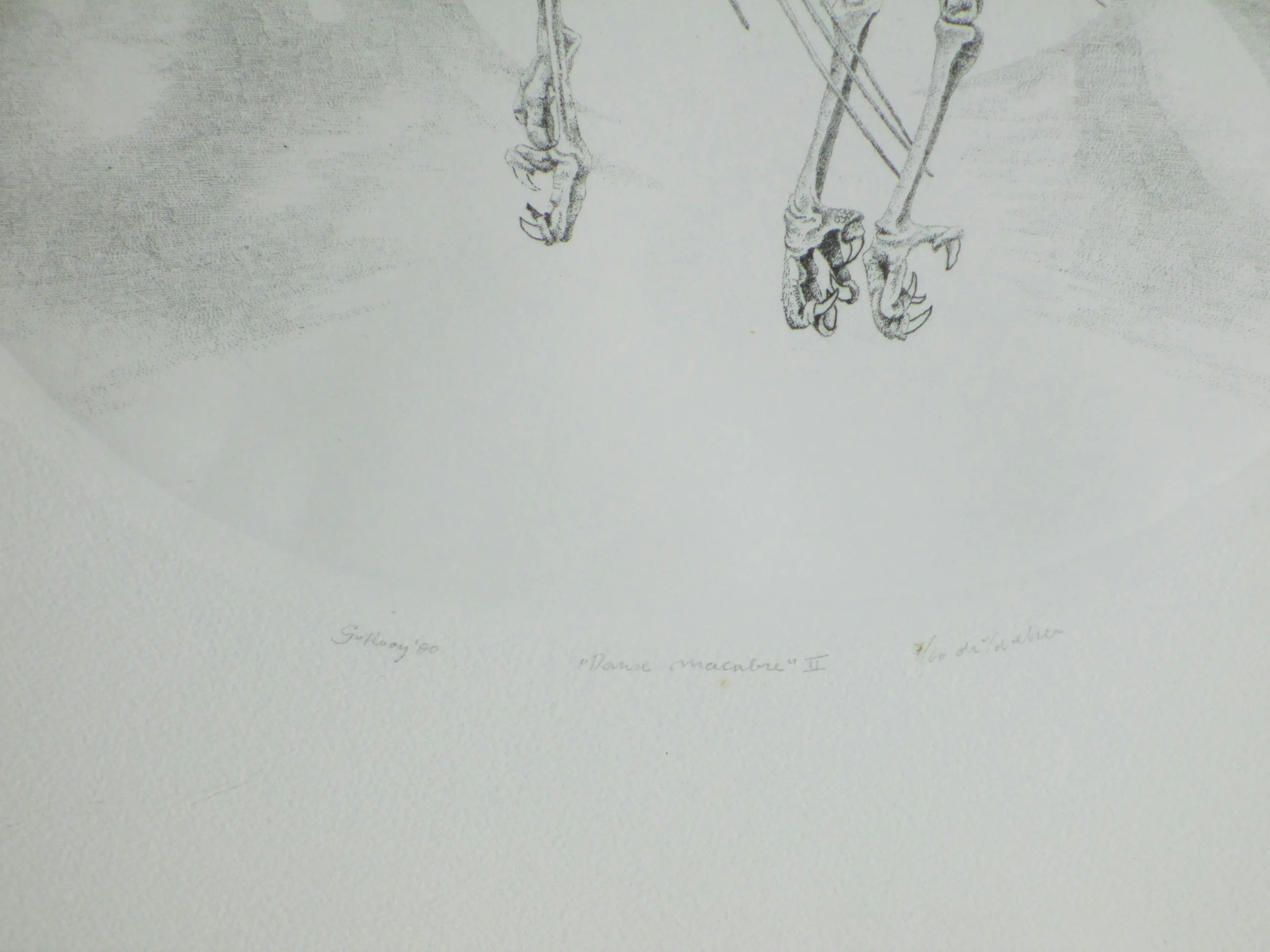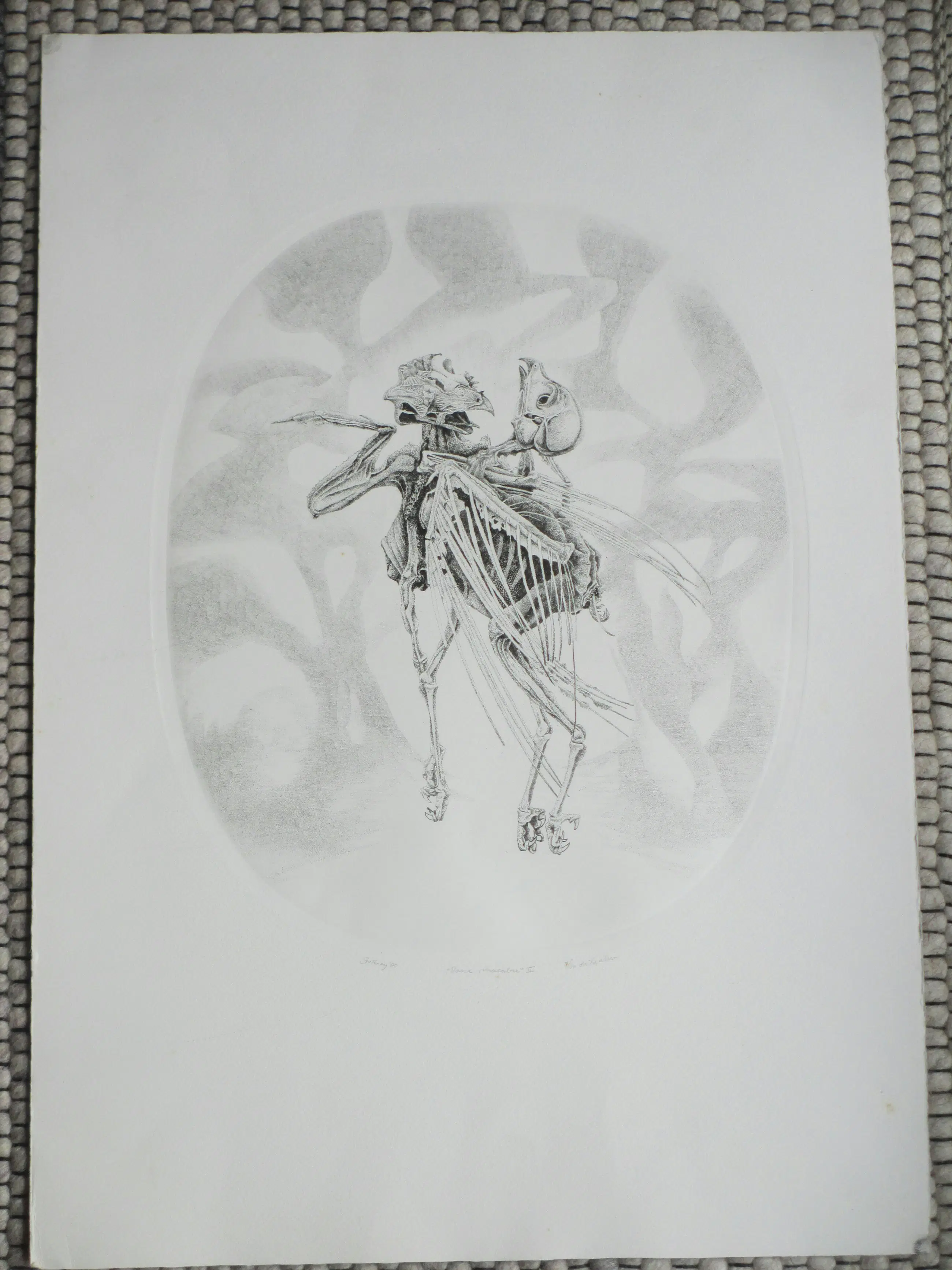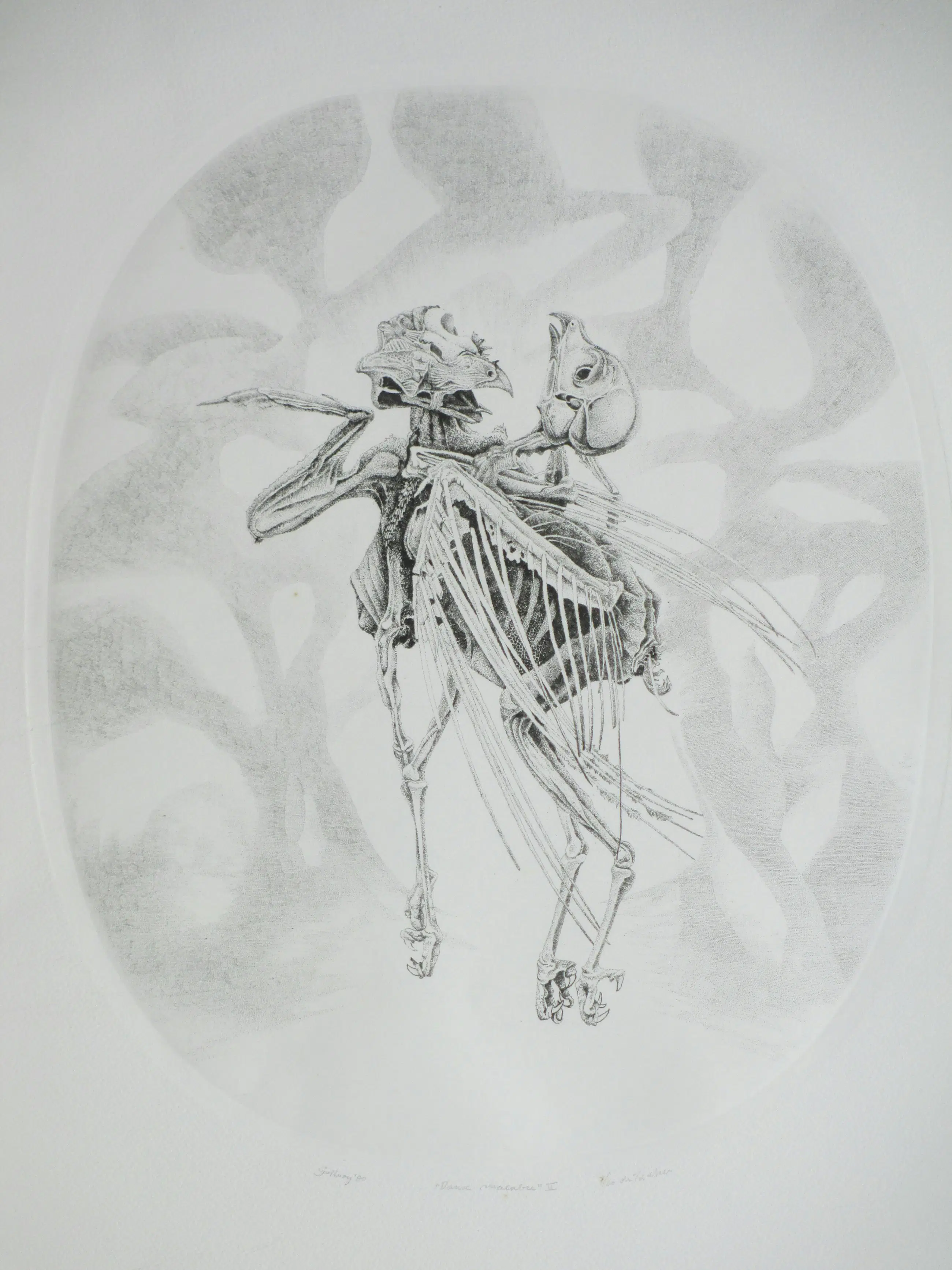 Ets in ovaal door Gerard van Rooy Voorstelling van twee vogelskeletten in een macabere dans Losbladig, beeldmaat 36x30, bladmaat 56x39 Gesigneerd en gedateerd in potlood l.o.: 'G v Rooy '80' Getiteld in potlood m.o.: "Danse macabre" II Genummerd en annotatie in potlood r.o.: '7/60 dr v/d etser' Authenticiteit volledig gegarandeerd