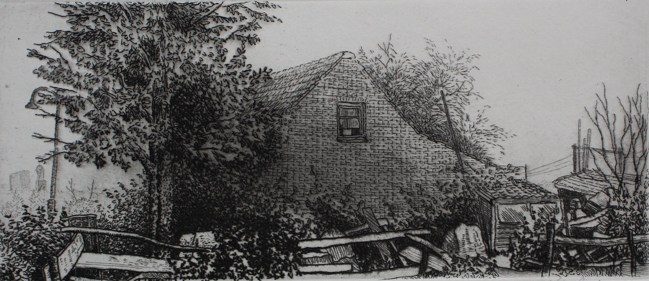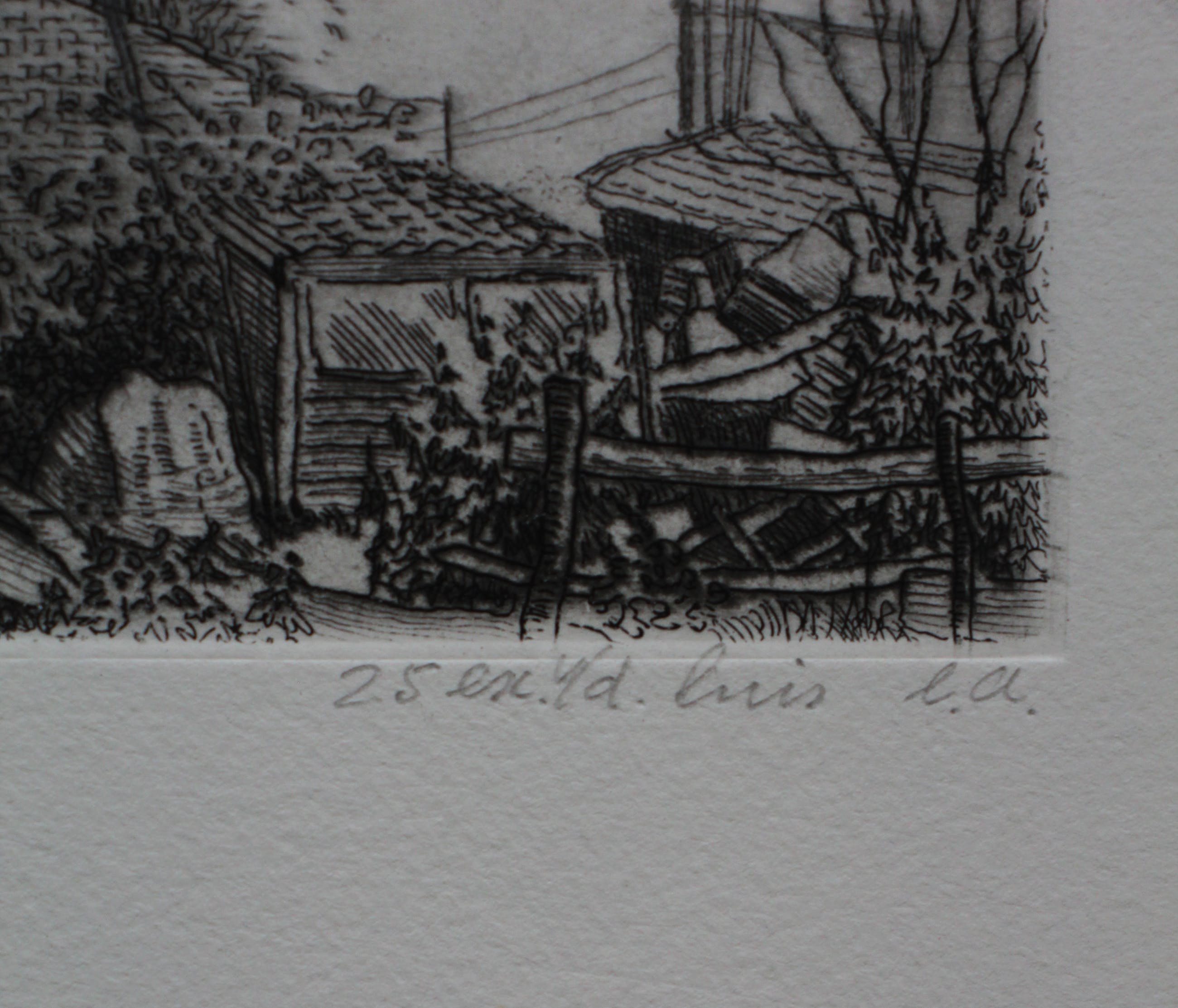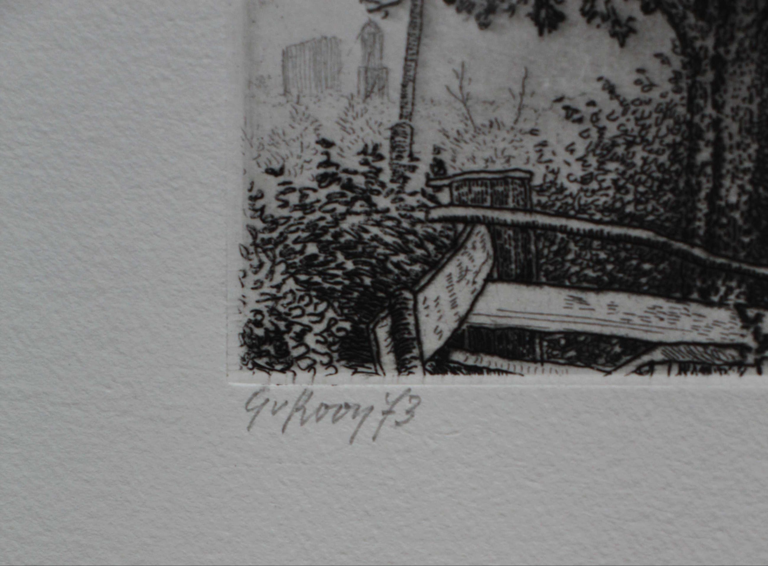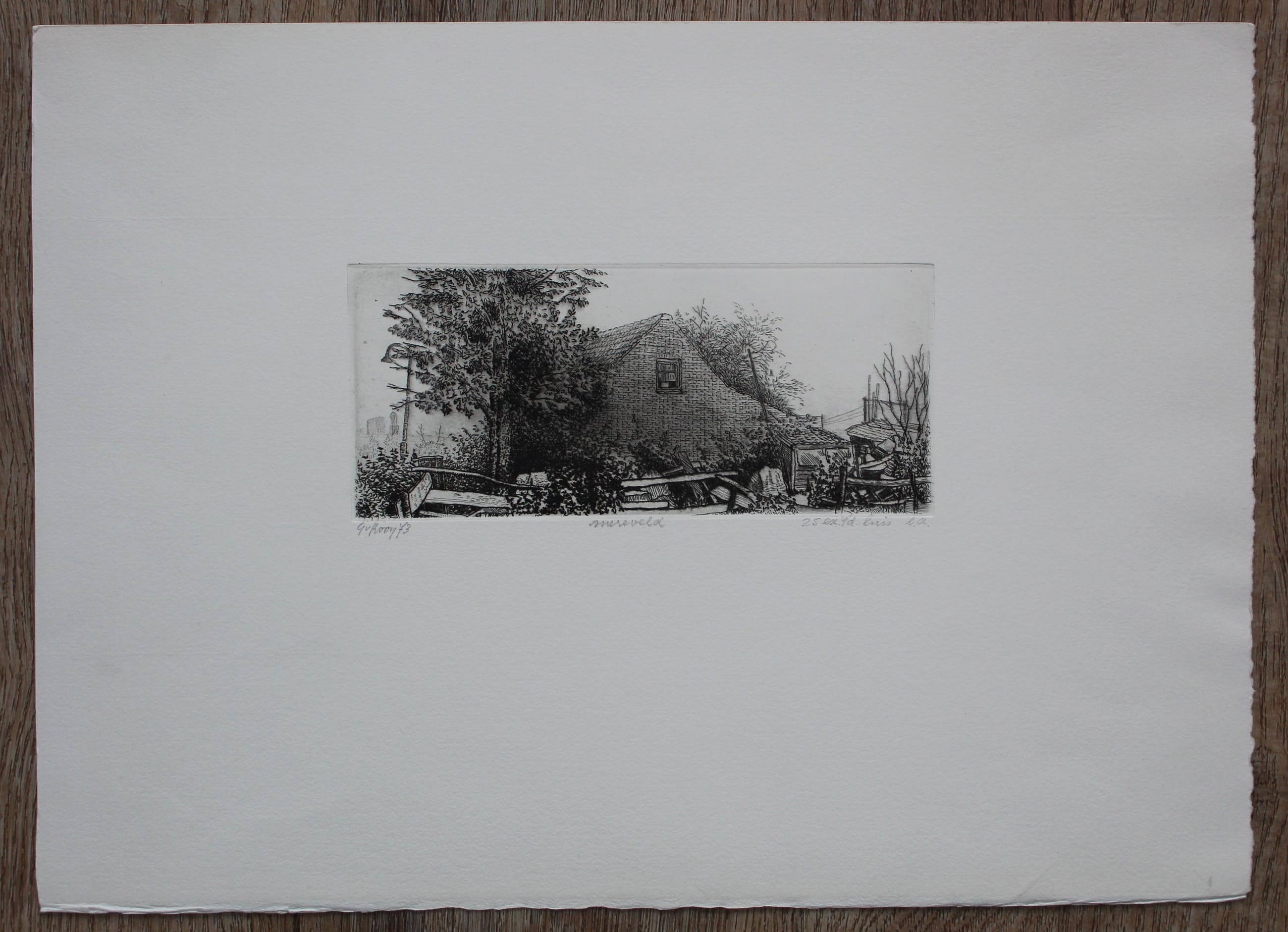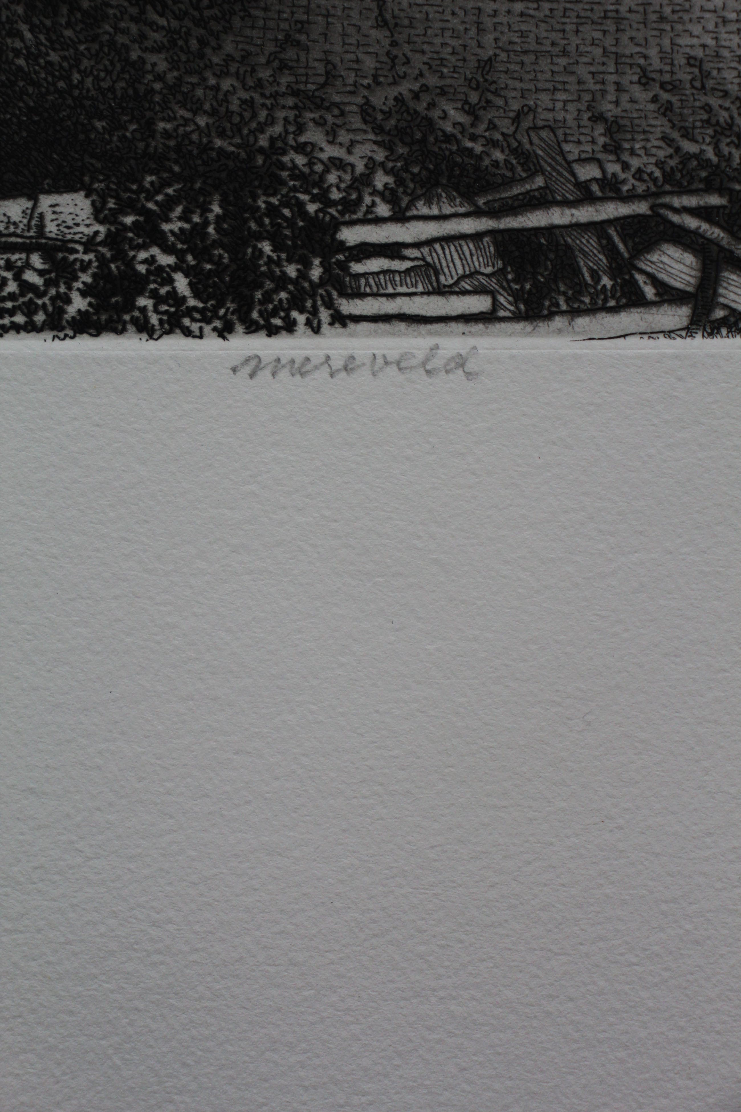 Ets van Gerard van Rooy. Titel: Mereveld. Jaar: 1973. Nummer: 25, vd Luis e.a. Afmetingen werk: H28 x b39 cm. Afmetingen voorstelling: H7.5 x b18cm. Het werk is links onderaan, met potlood, gesigneerd door de kunstenaar. De authenticiteit van het aangeboden werk wordt volledig gegarandeerd. Een certificaat van echtheid kan, op aanvraag, worden gemaild.