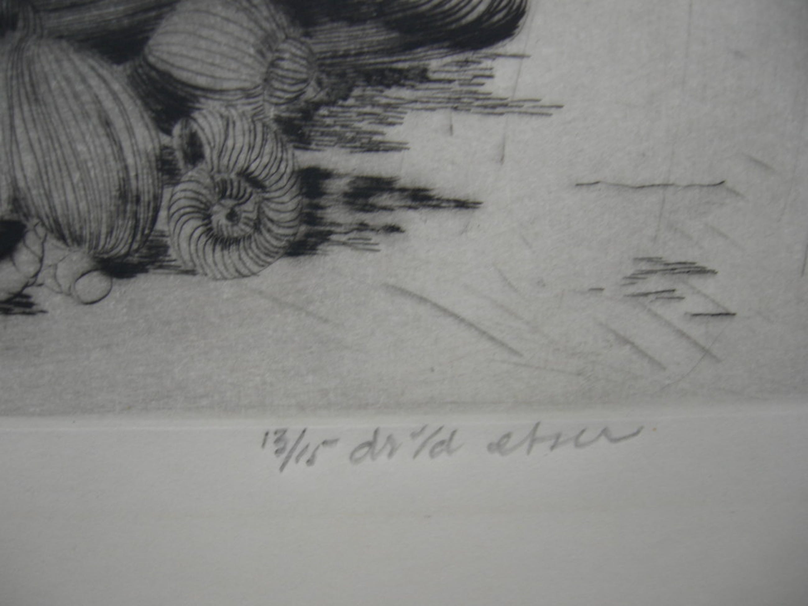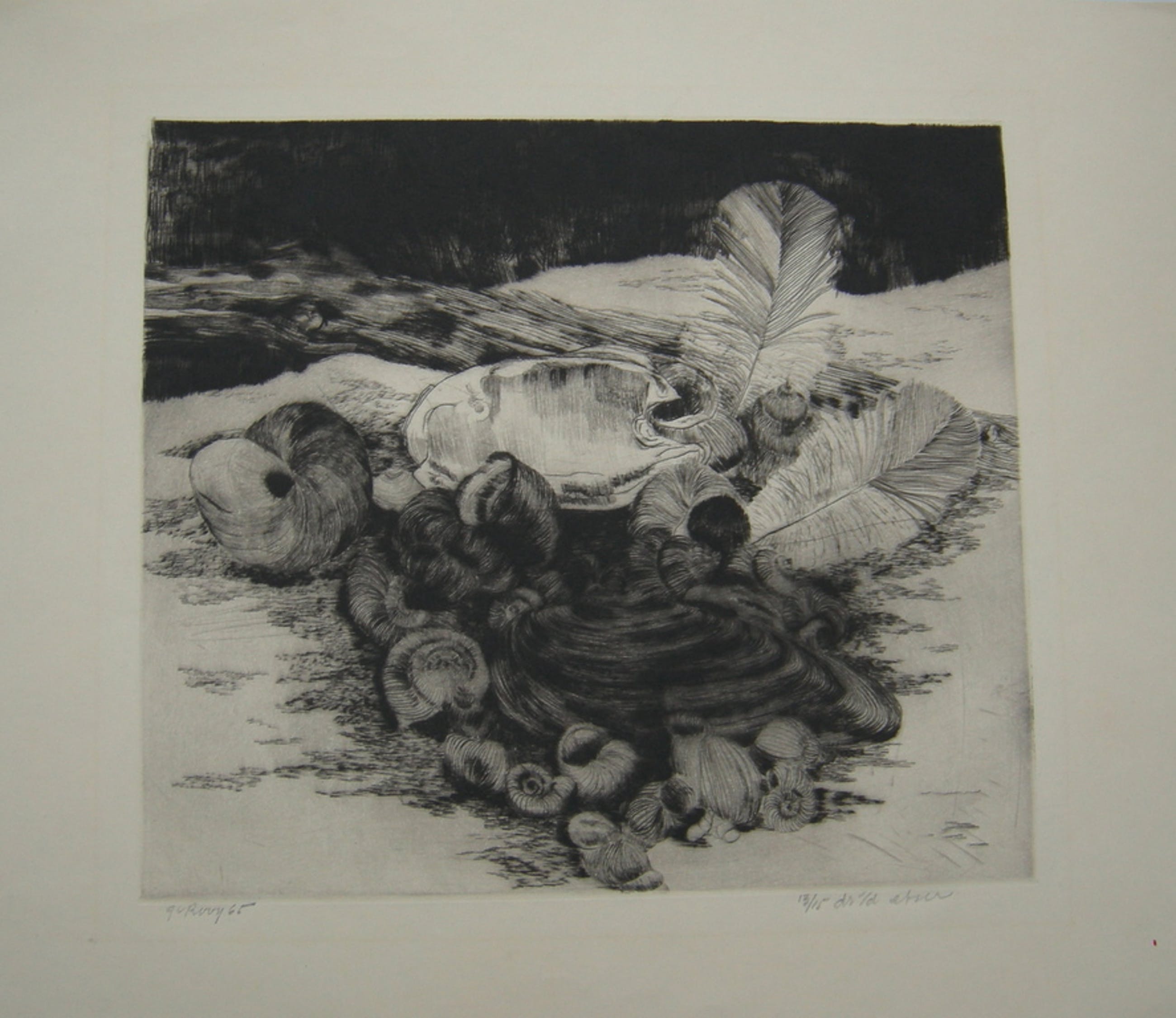 Deze droge naald 'Strandstilleven met schelpen, slakken en veren' is gemaakt in 1965.