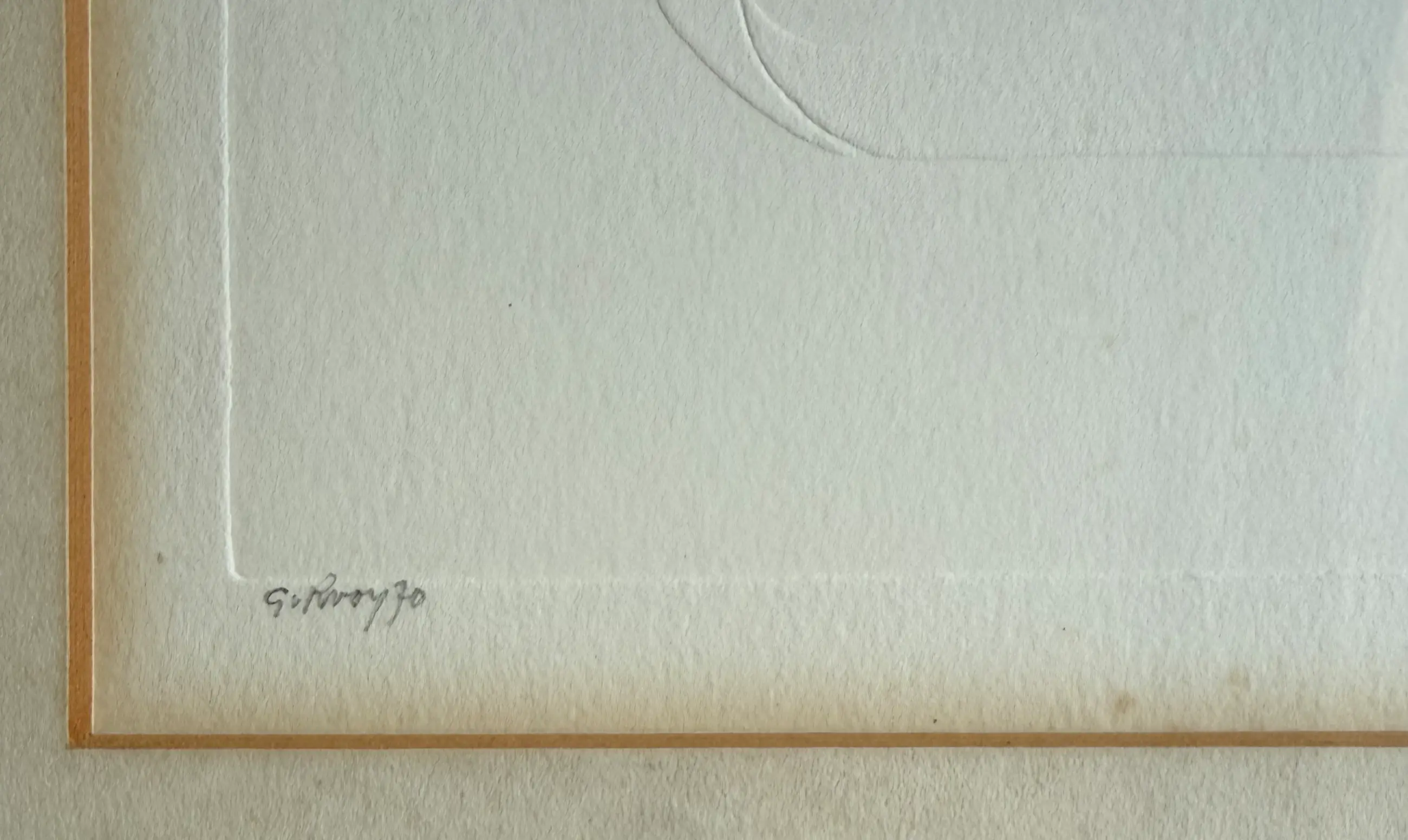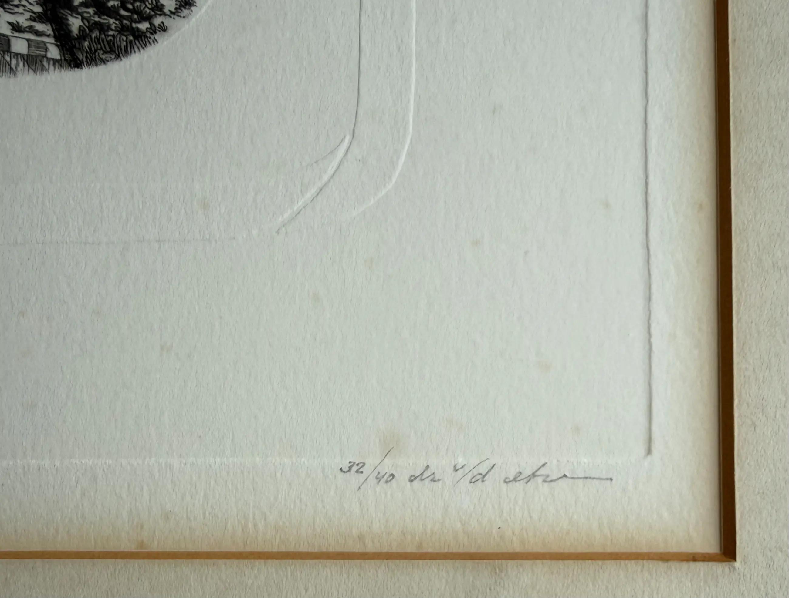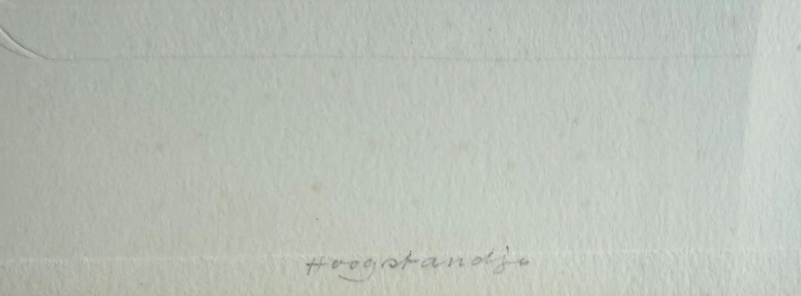 | Wat lichte foxing aan de onderzijde van het blad en verkleuring langs de rand van de passe-partout. Algeheel toch in nette conditie, kan zo aan de muur. | |||||||||||