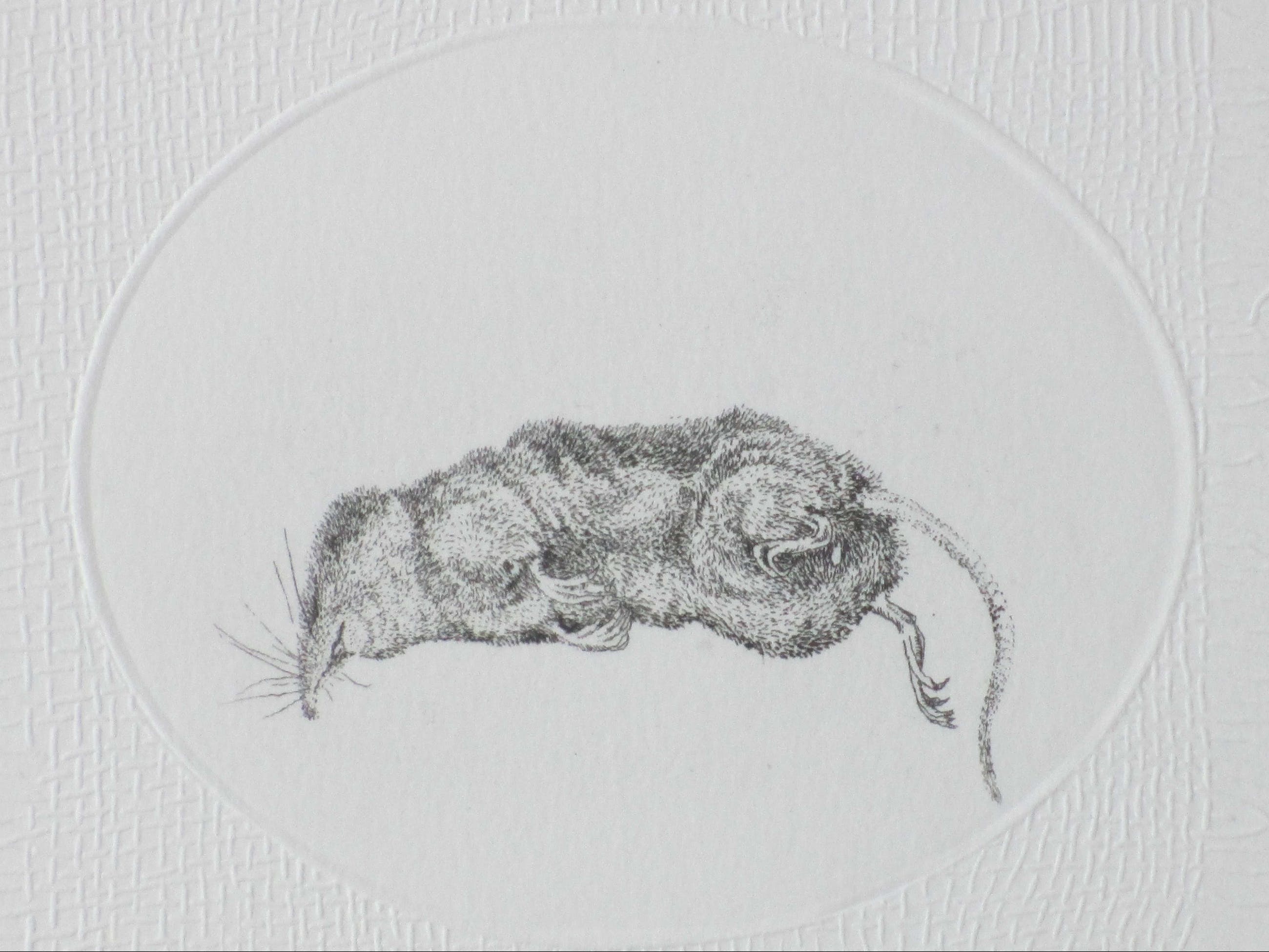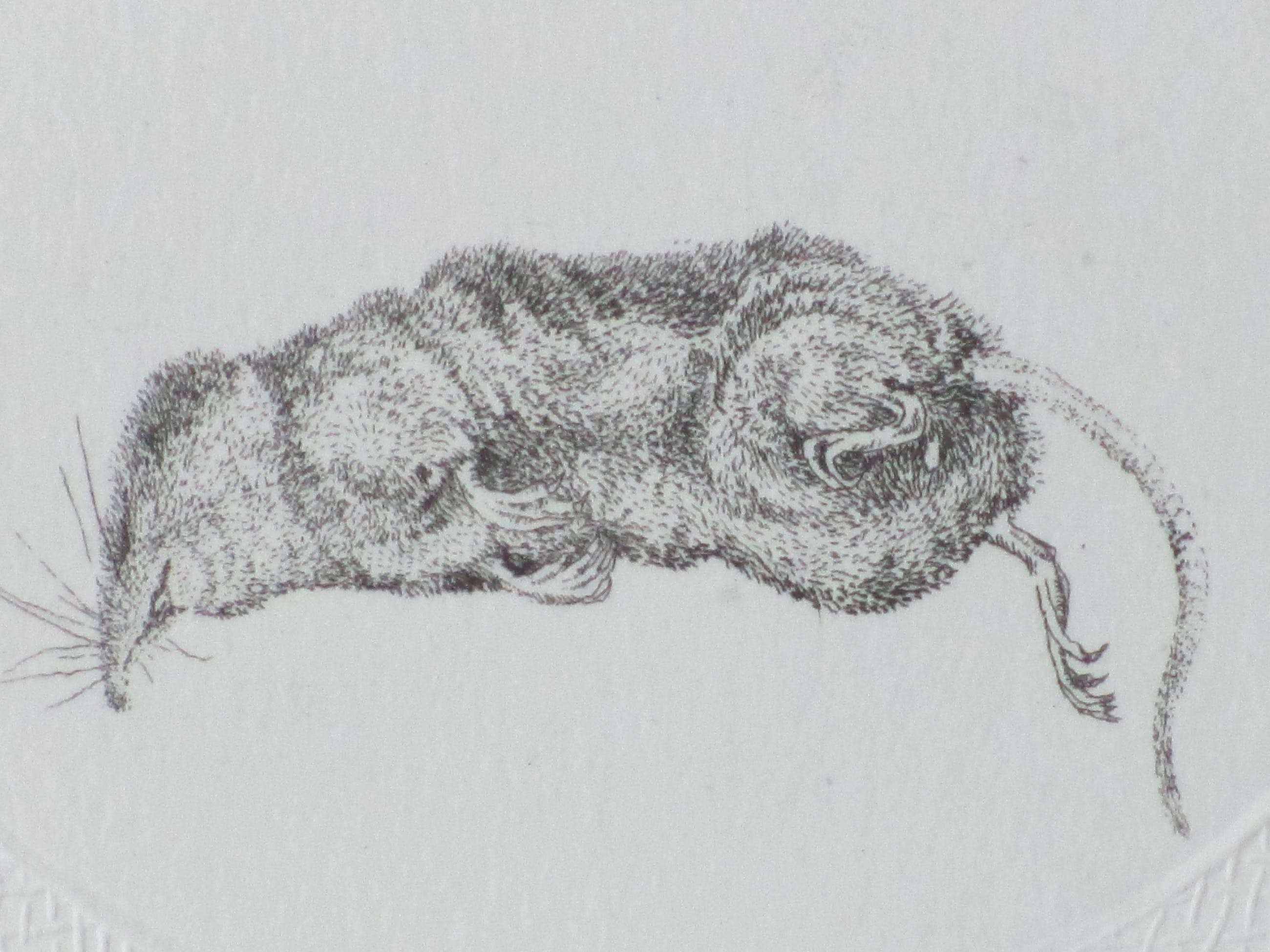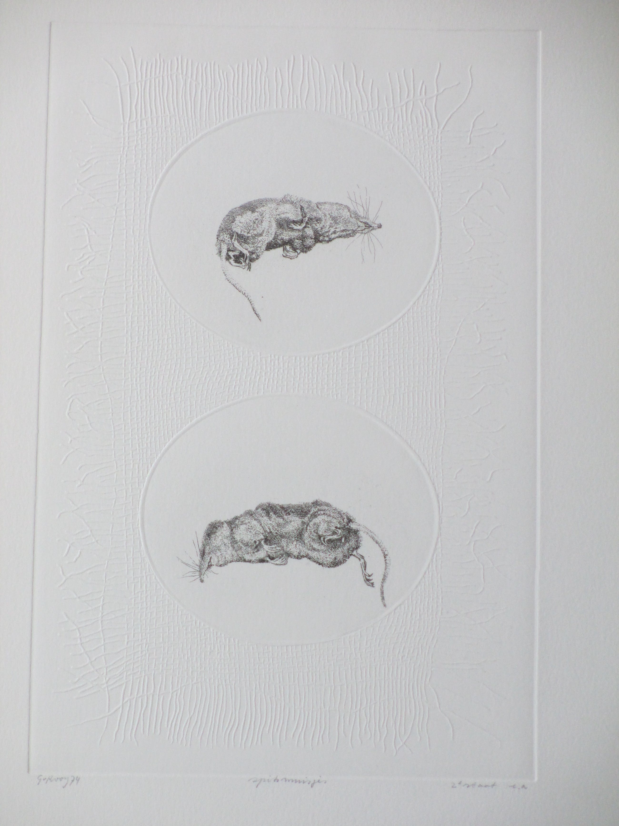 Ets in reliëfdruk door Gerard van Rooy Voorstelling van twee dode spitsmuisjes Losbladig, beeldmaat 30x19.5, bladmaat 50x32.5 Gesigneerd en gedateerd l.o. in potlood: 'GvRooy' '74' Getiteld m.o.: 'Spitsmuisjes' en annotatie r.o.: '2e staat e.a.' Authenticiteit volledig gegarandeerd