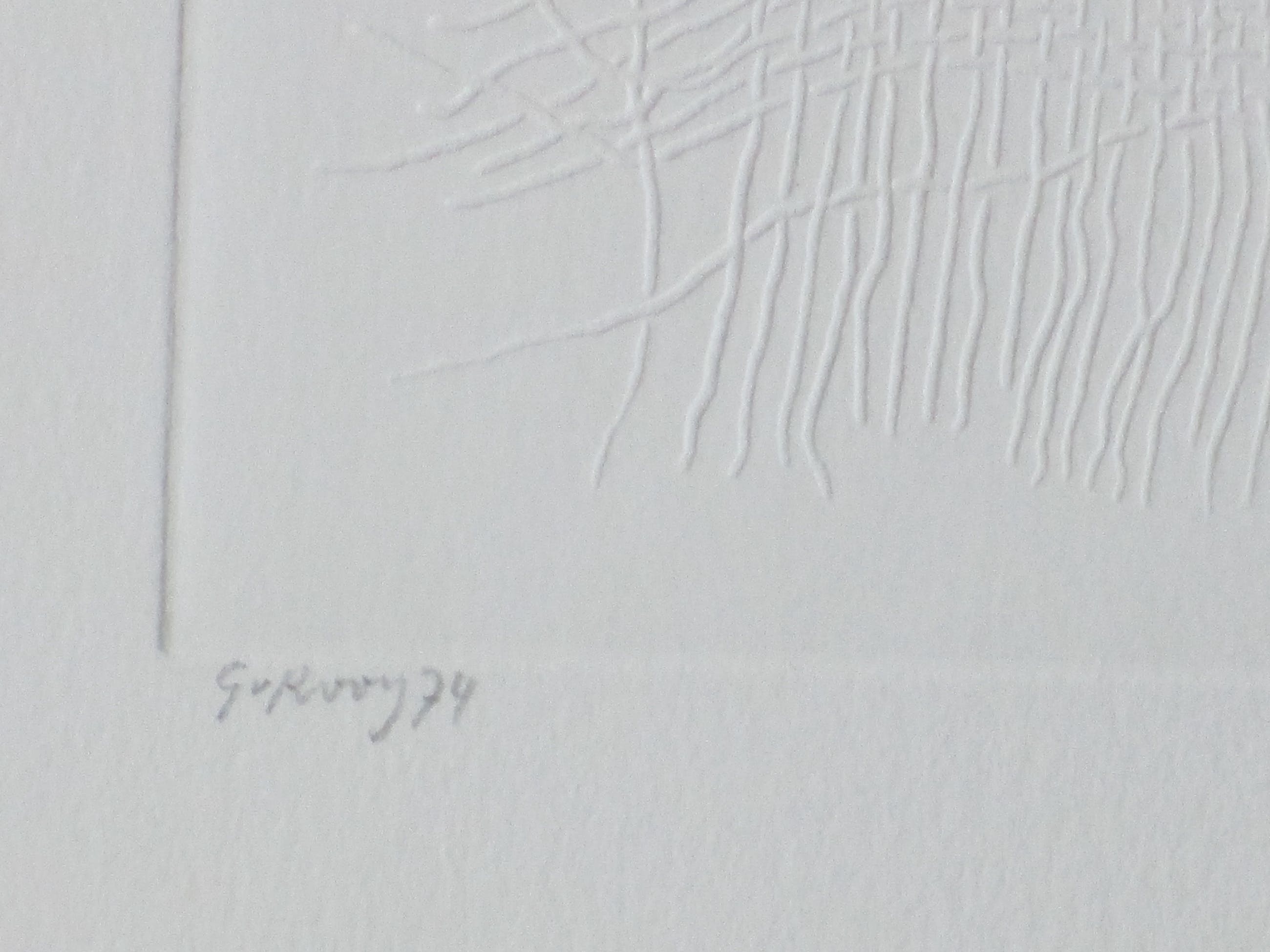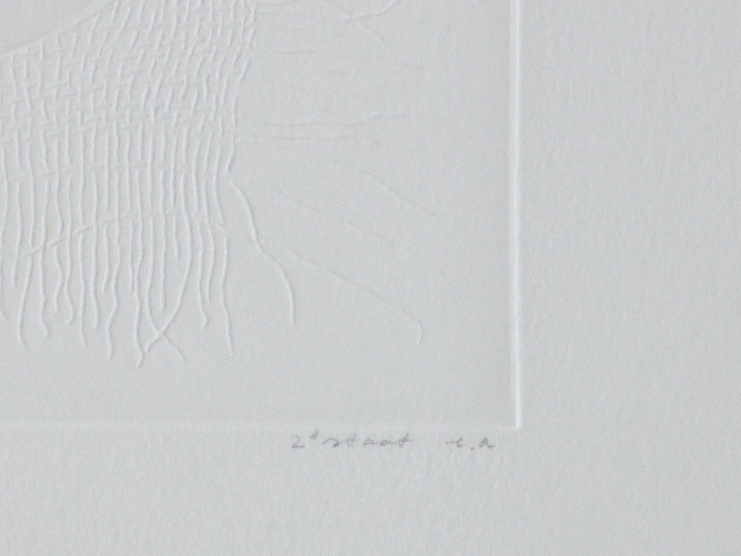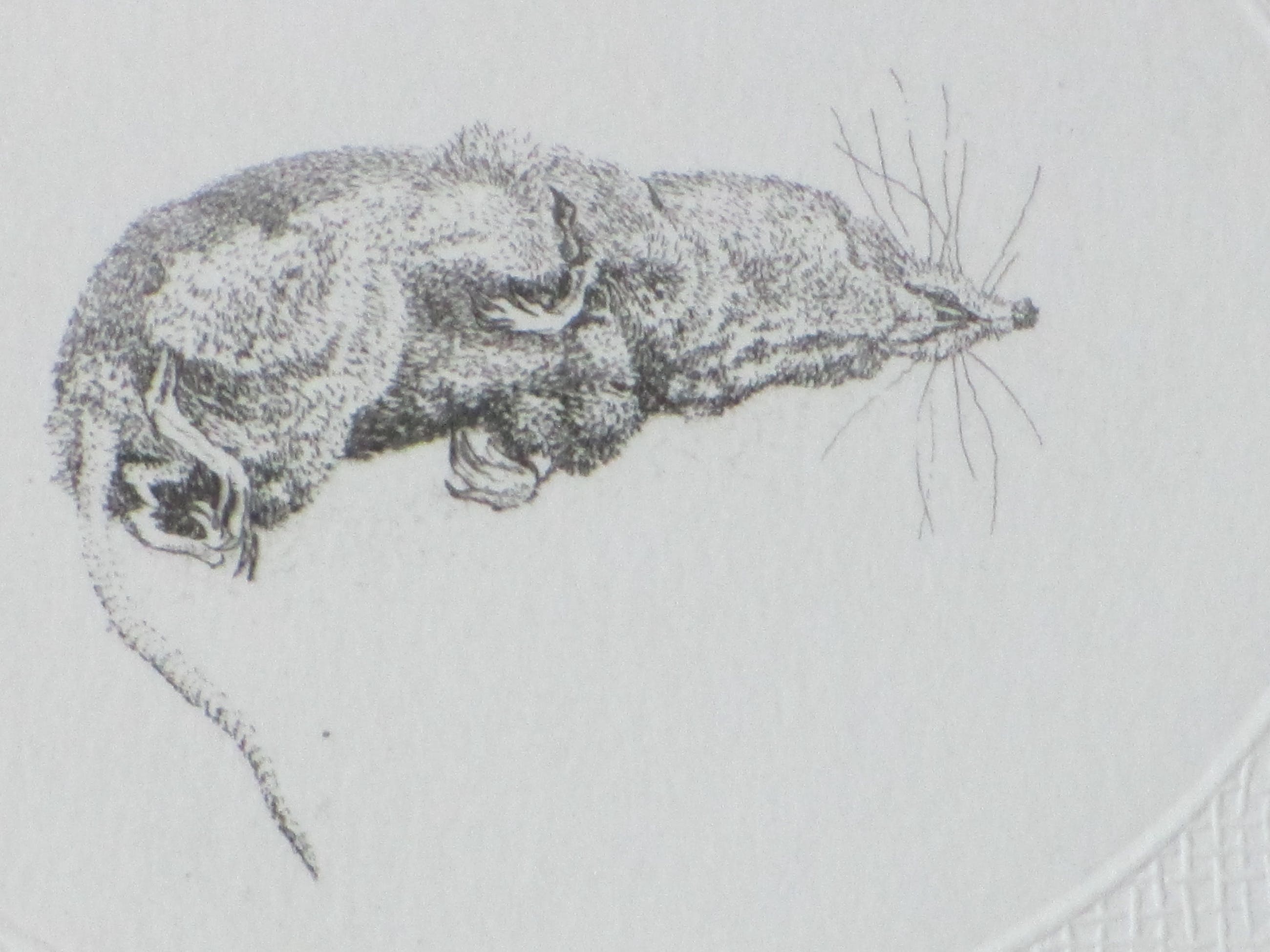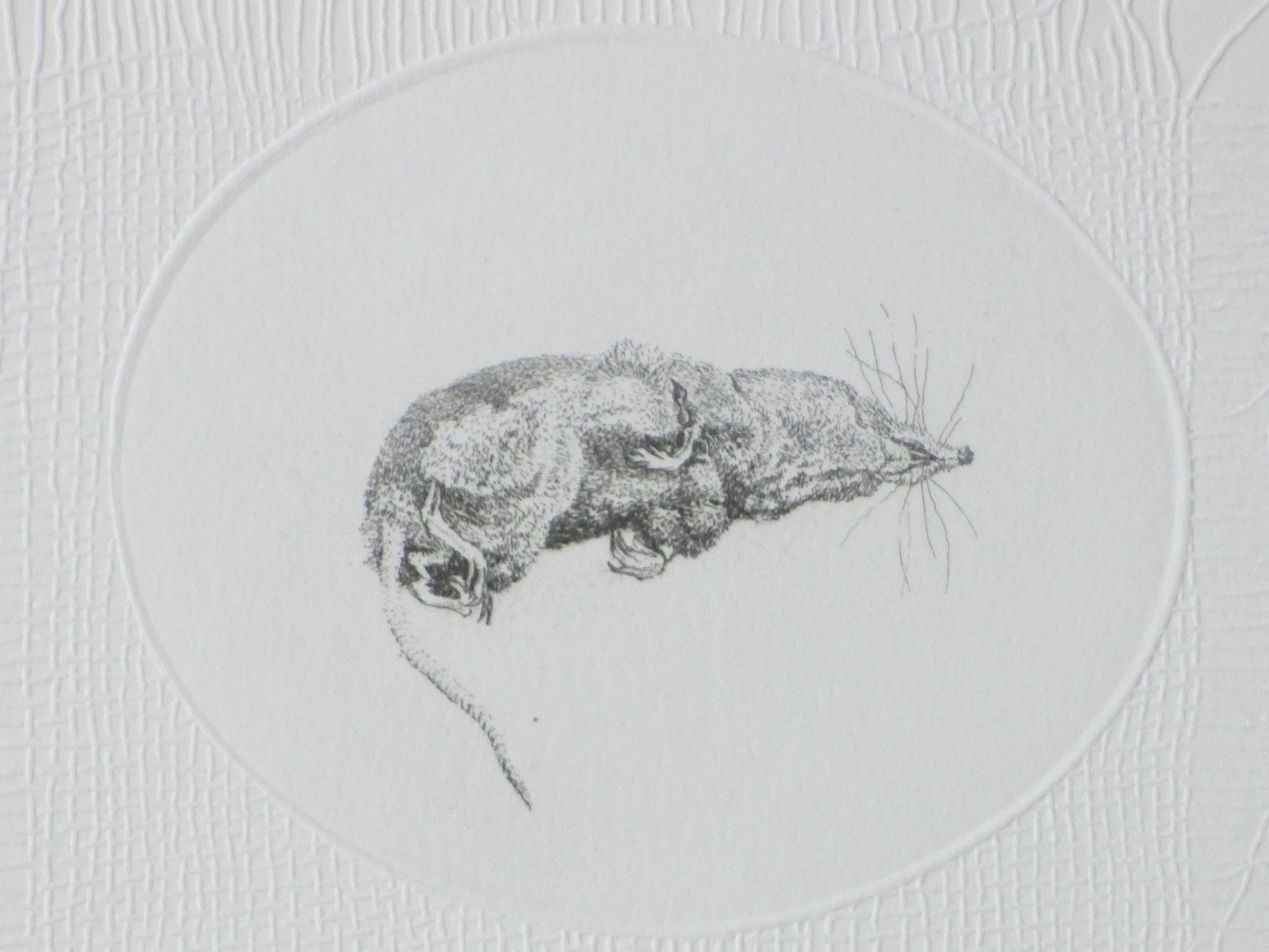 Ets in reliëfdruk door Gerard van Rooy Voorstelling van twee dode spitsmuisjes Losbladig, beeldmaat 30x19.5, bladmaat 50x32.5 Gesigneerd en gedateerd l.o. in potlood: 'GvRooy' '74' Getiteld m.o.: 'Spitsmuisjes' en annotatie r.o.: '2e staat e.a.' Authenticiteit volledig gegarandeerd