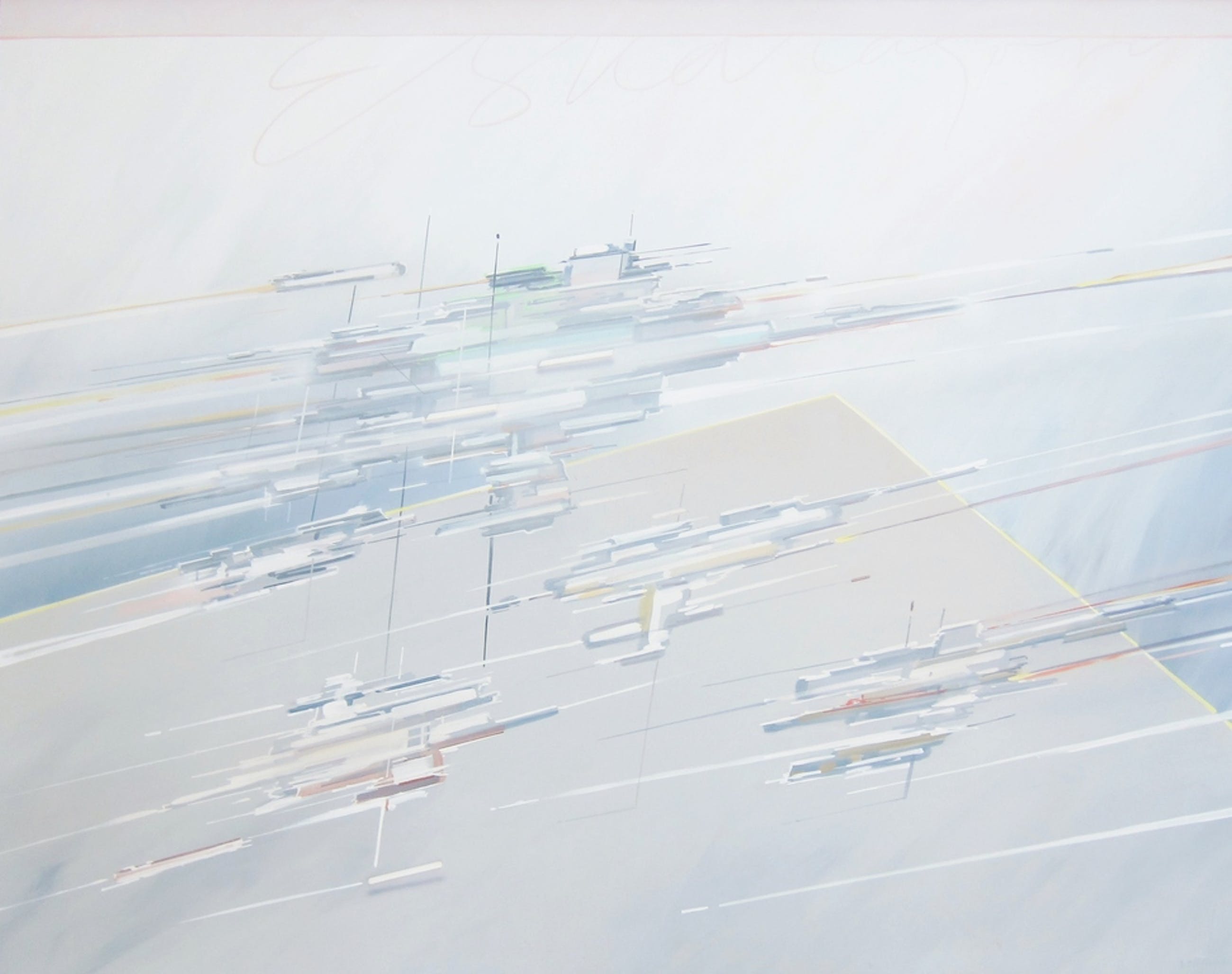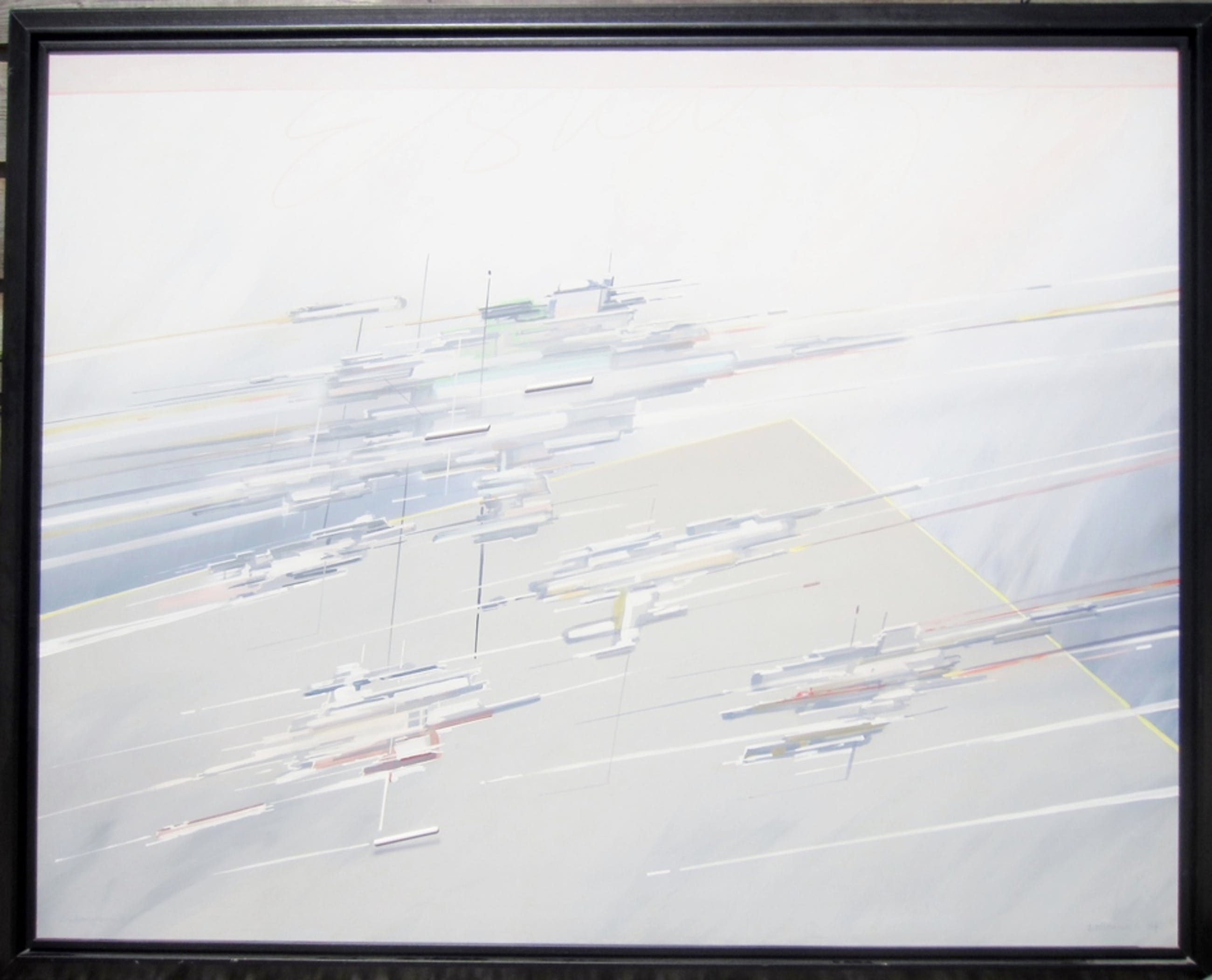 Omschrijving: prachtig en zeer groot schilderij van ontwerper Gerard Vollenbrock. Het is in heel mooie staat, gesigneerd, gedateerd en getiteld op het doek. De snelheid en de dieptewerking in het doek worden versterkt door enkele kunststof strookjes op het doek.