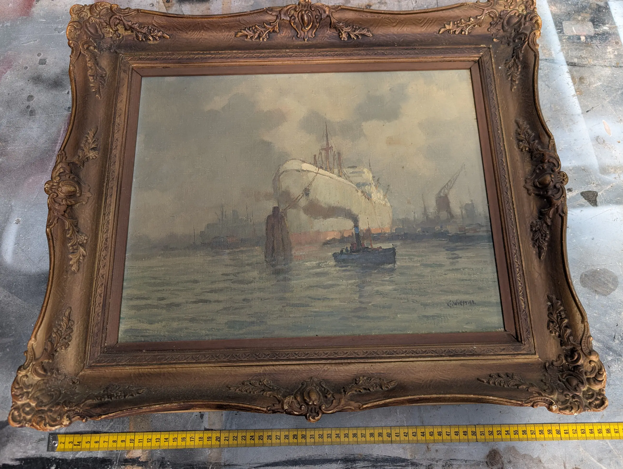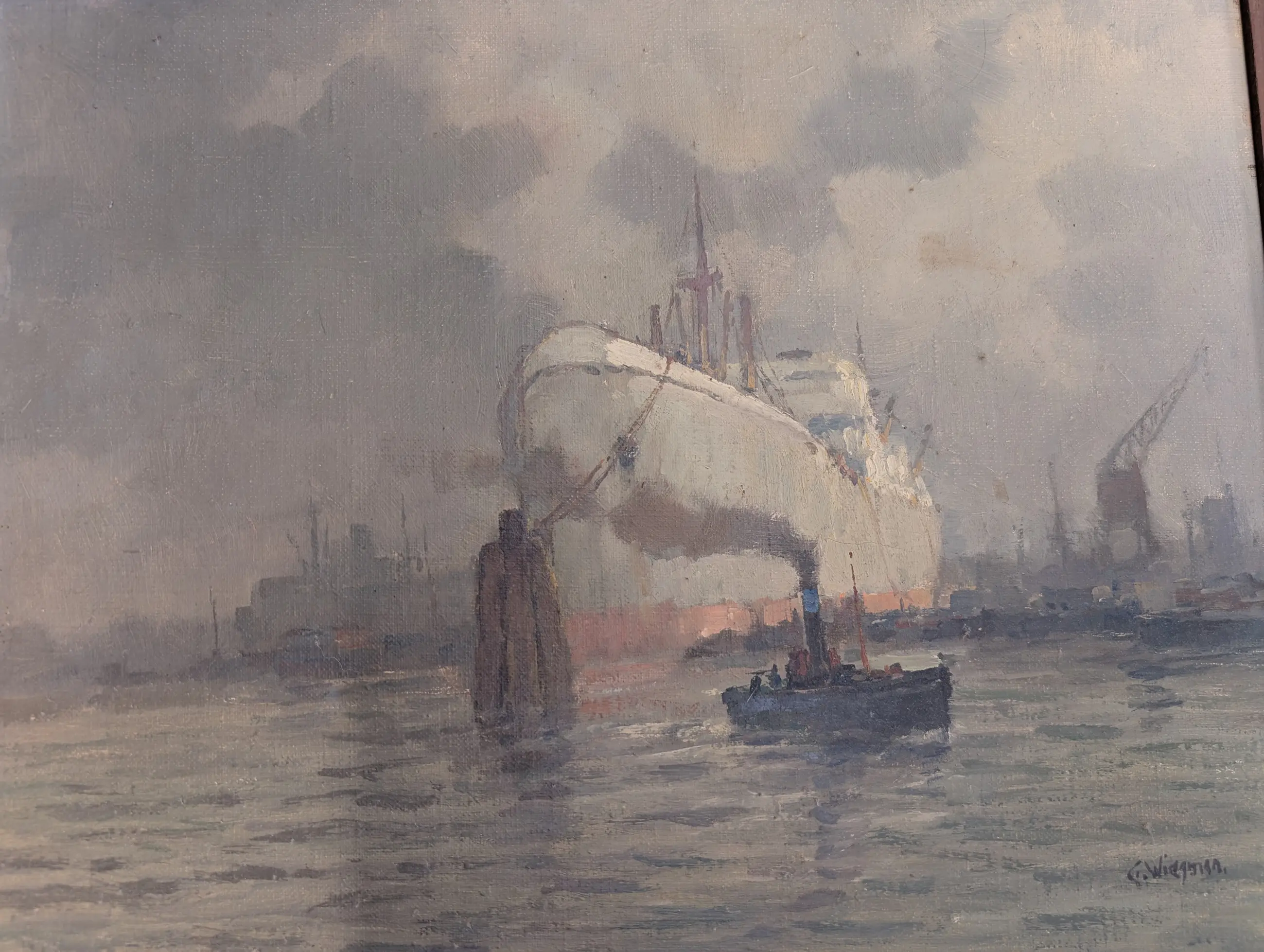 Omschrijving: een olieverf op doek havengezicht van Gerard Wiegman