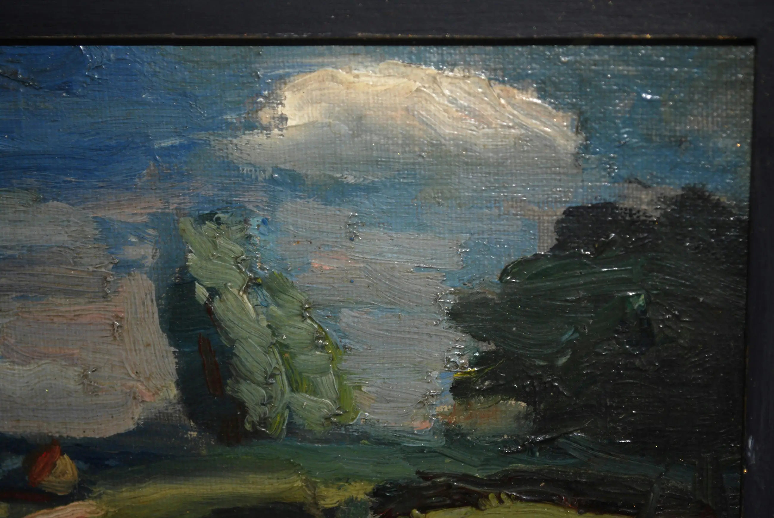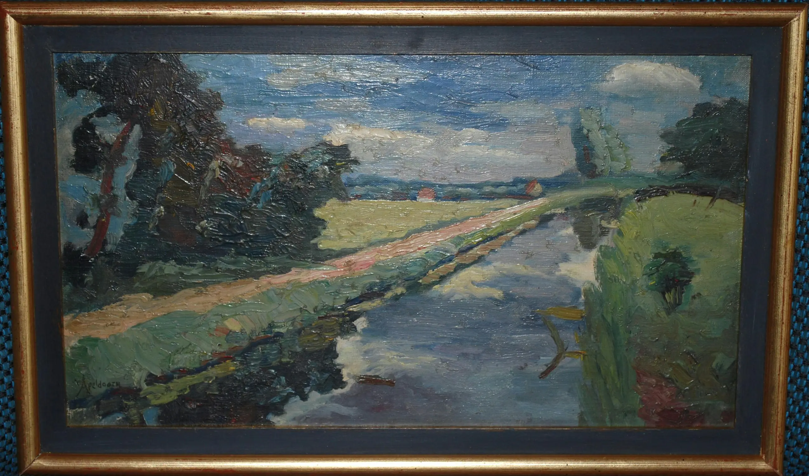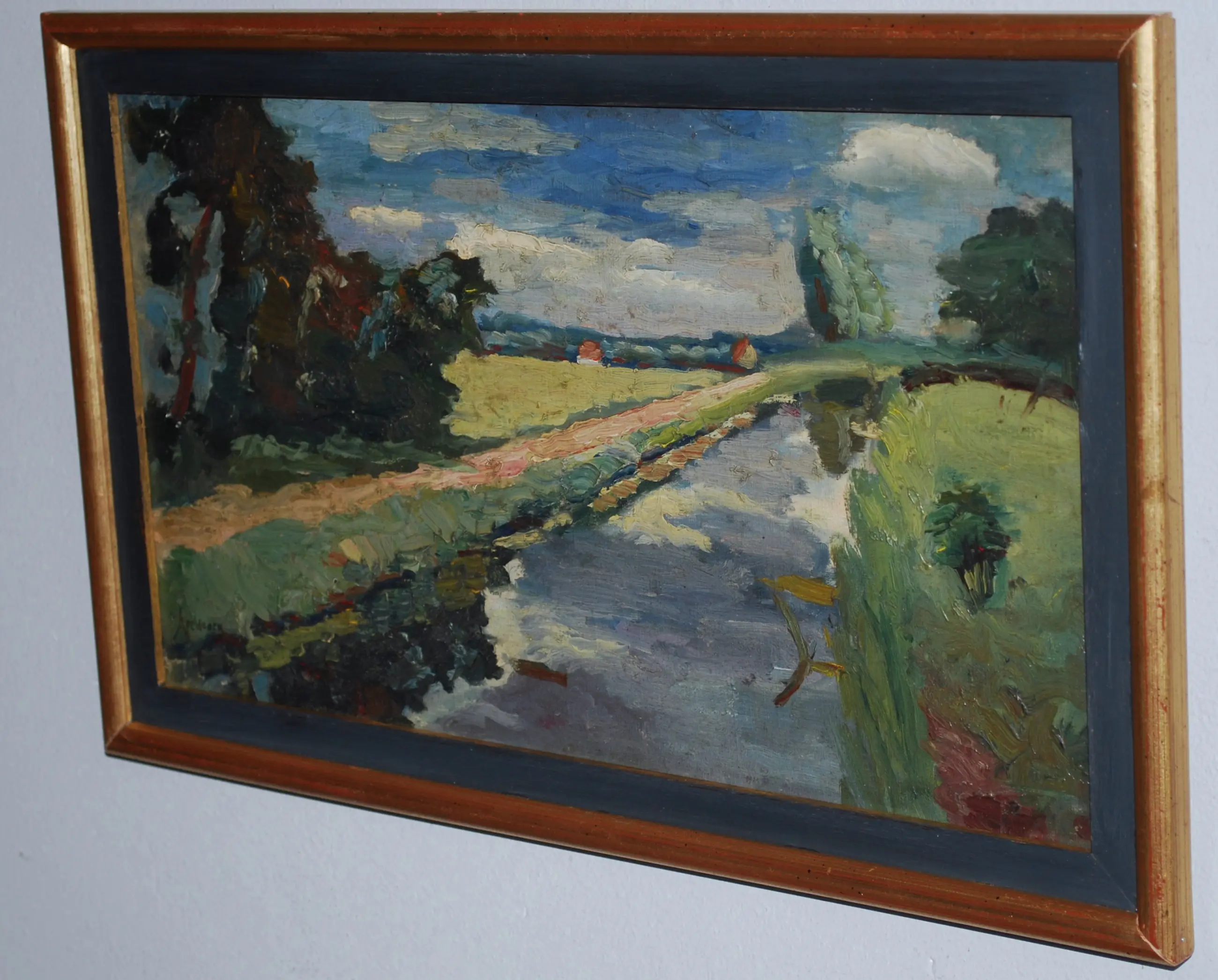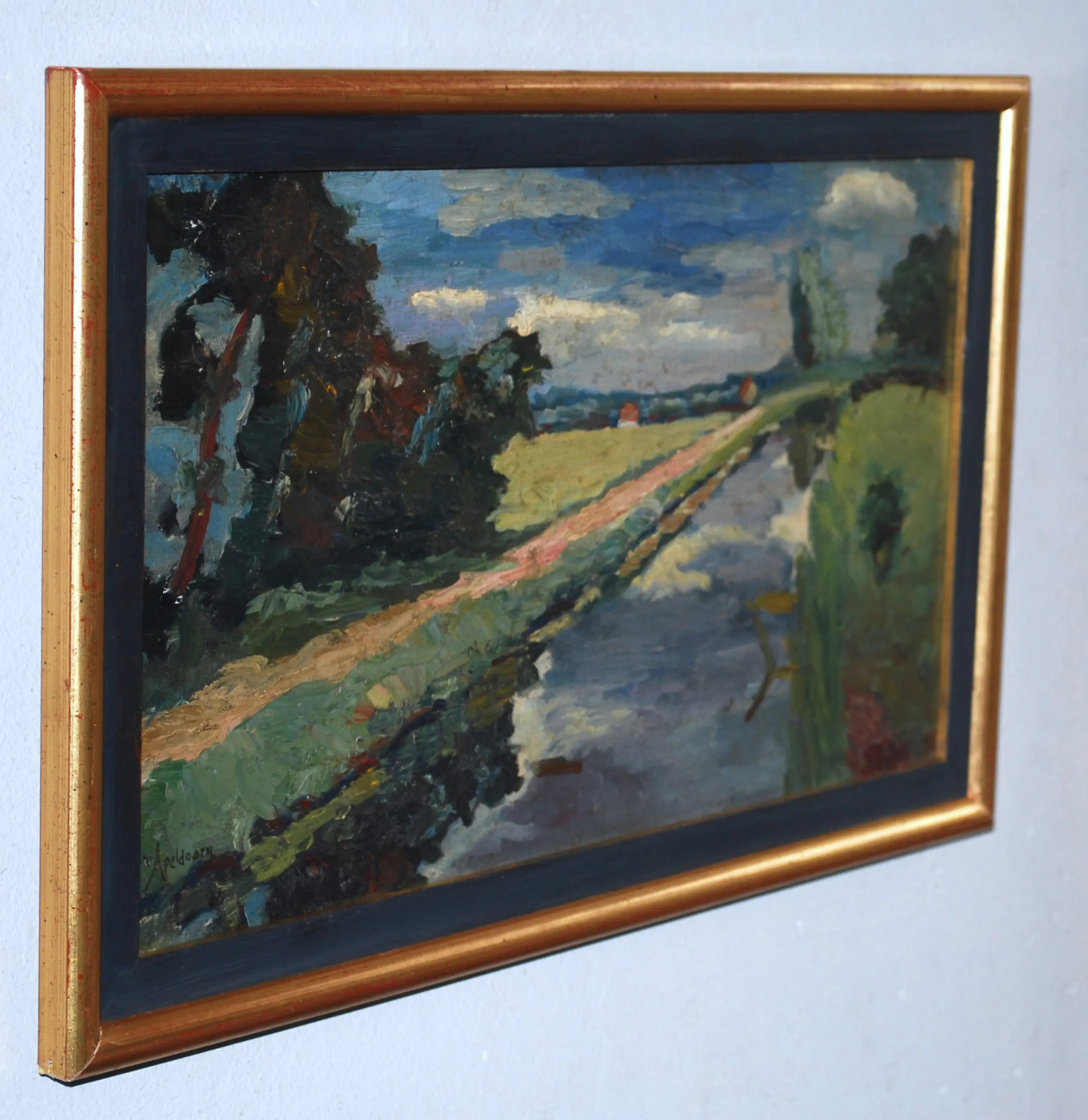 Olieverf op canvas, bevestigd op board. Gesigneerd l.o. Ingelijst.
