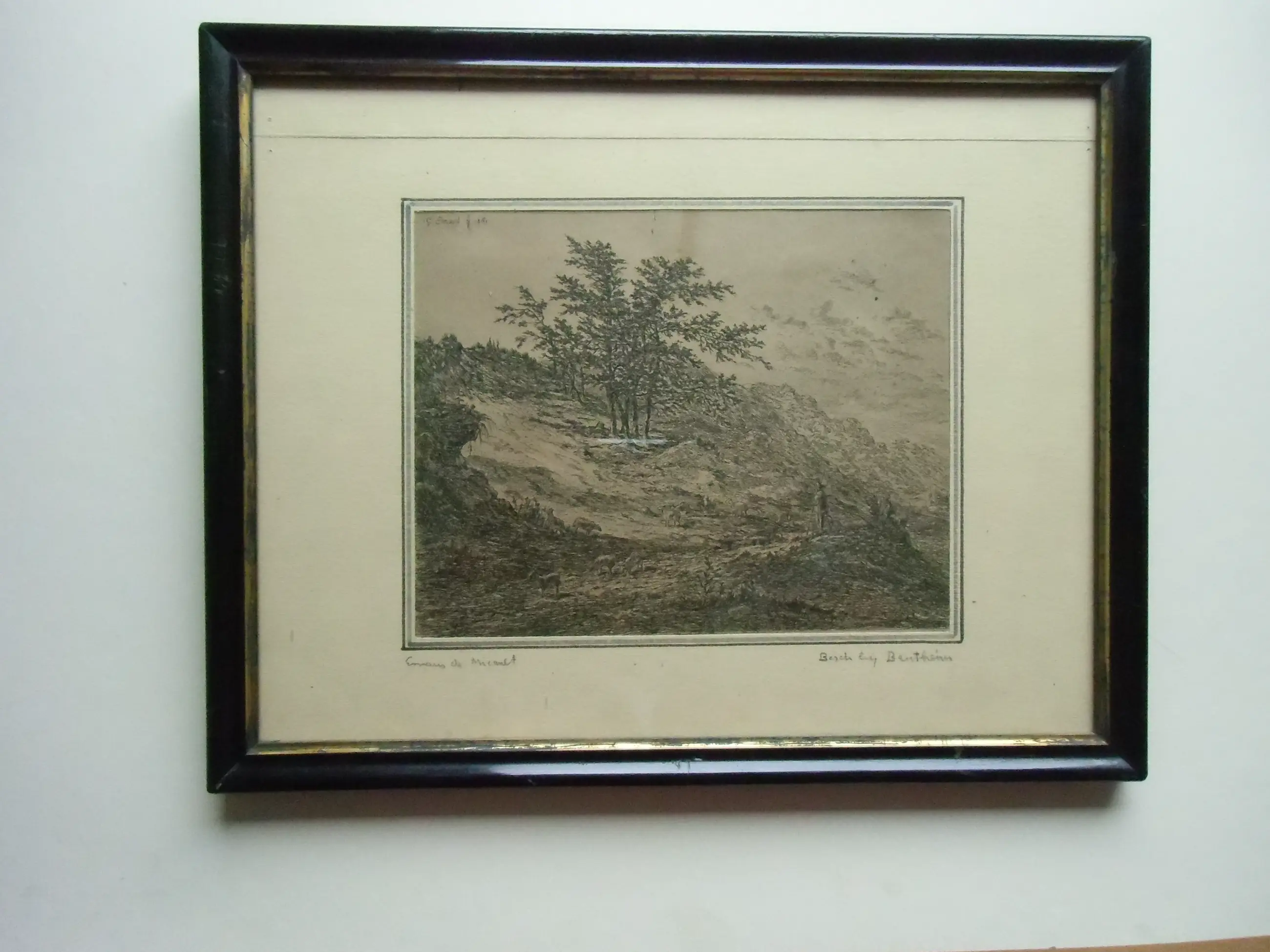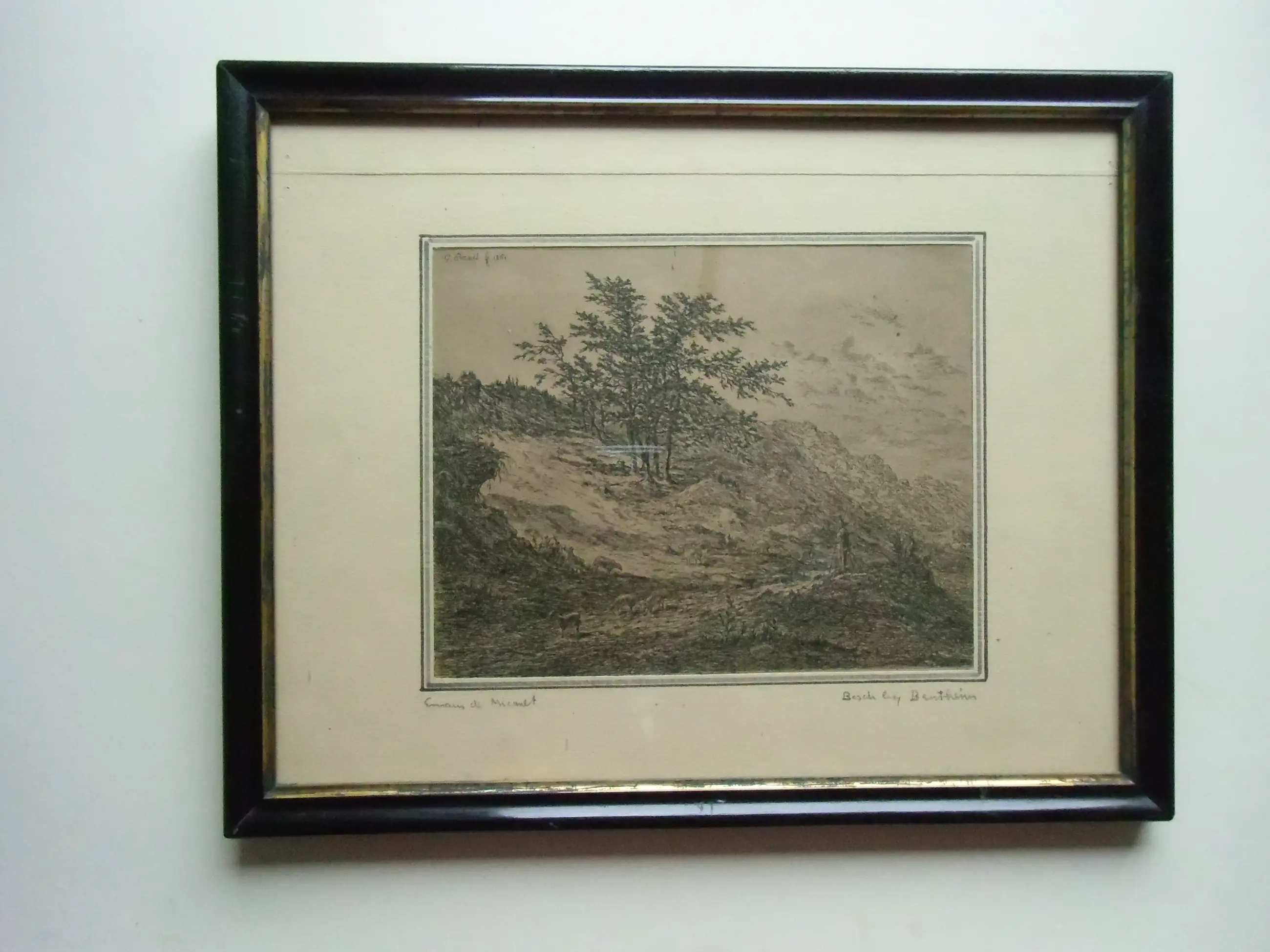 Doorwerkte ets van de 19e eeuwer Emaus de Micault in uitstekende staat. L.o. met potlood Emaus de Micault, r.o. met potlood Bosch bij Bentheim. In de plaat l.bov. G.Emaus f 1861. (in de foto's enige reflectie).
