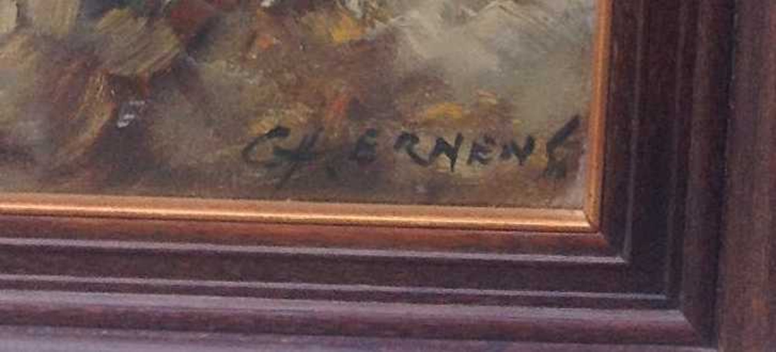 | staat doek: licht oppervlaktevuil door de tijd, retouche zichtbaar. staat lijst: licht oppervlaktevuil en slijtschade door de tijd. | |