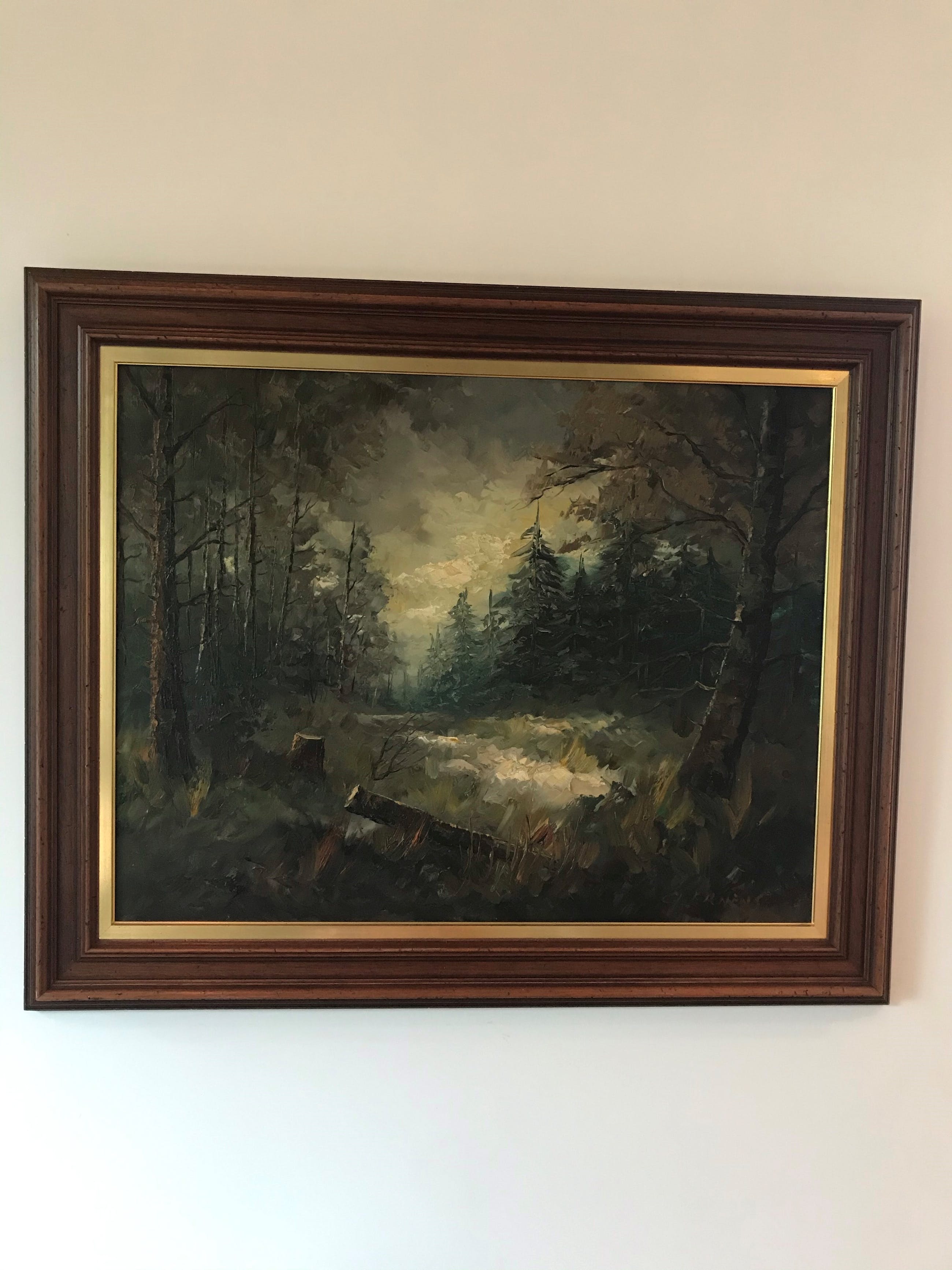 Dit schilderij is van de Nederlandse schilder Gerard J. Ernens (1935). Te zien op dit werk is een een open plek in een bos. Het werk is 69 x 89 cm (92 x 112 cm inclusief lijst), rechtsonder gesigneerd en in zeer goede staat. Verf is er in verschillende diktes opgezet waardoor een mooi effect ontstaat.