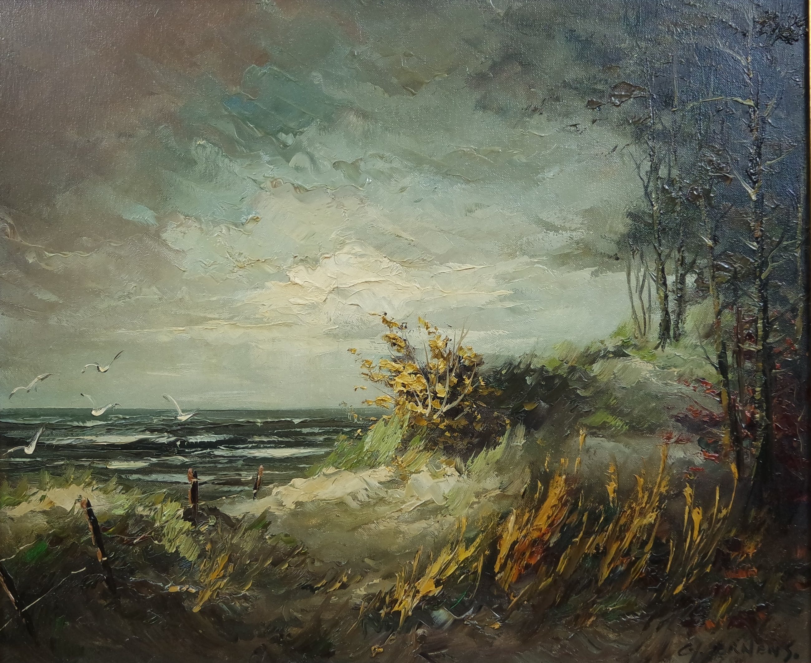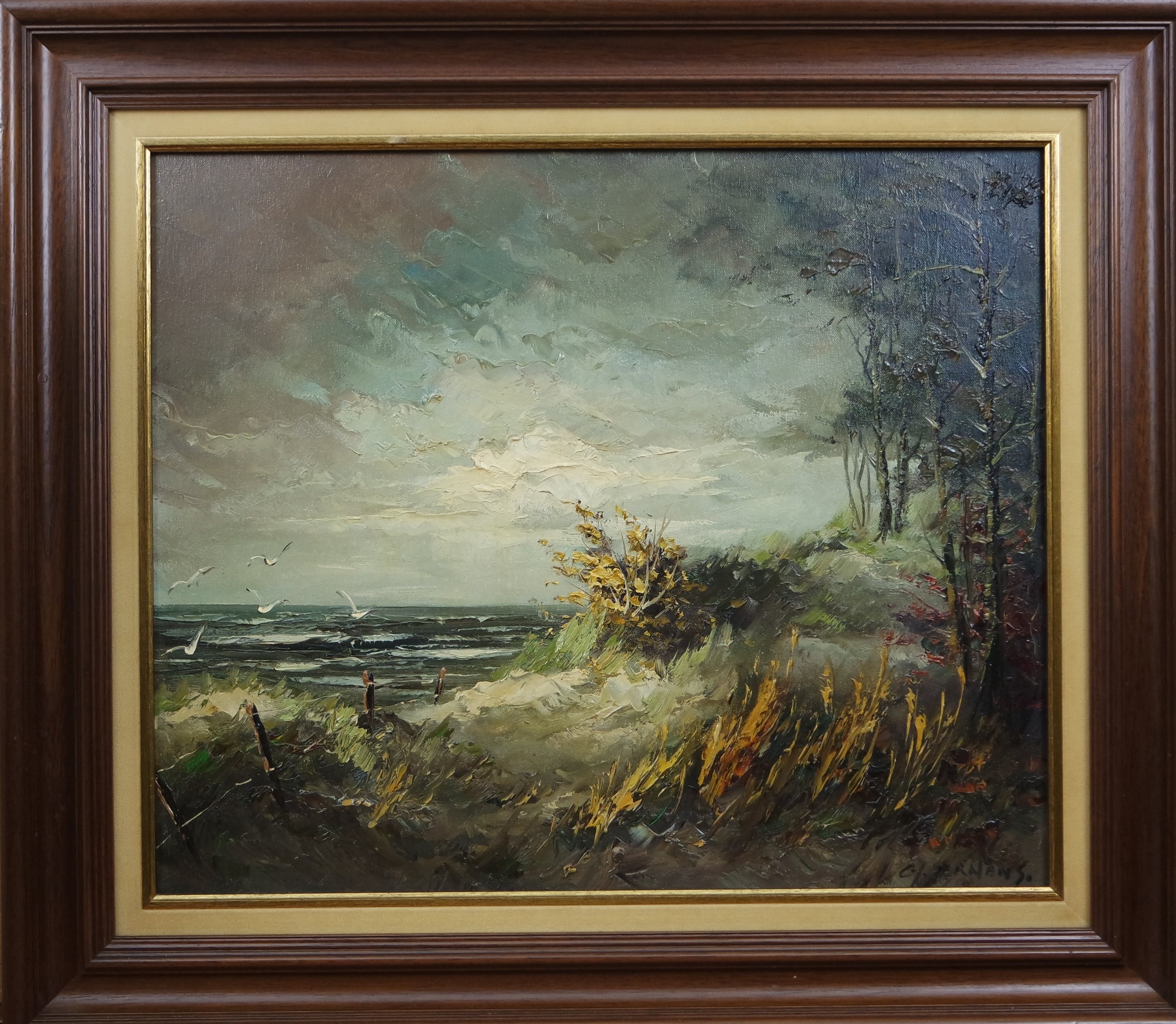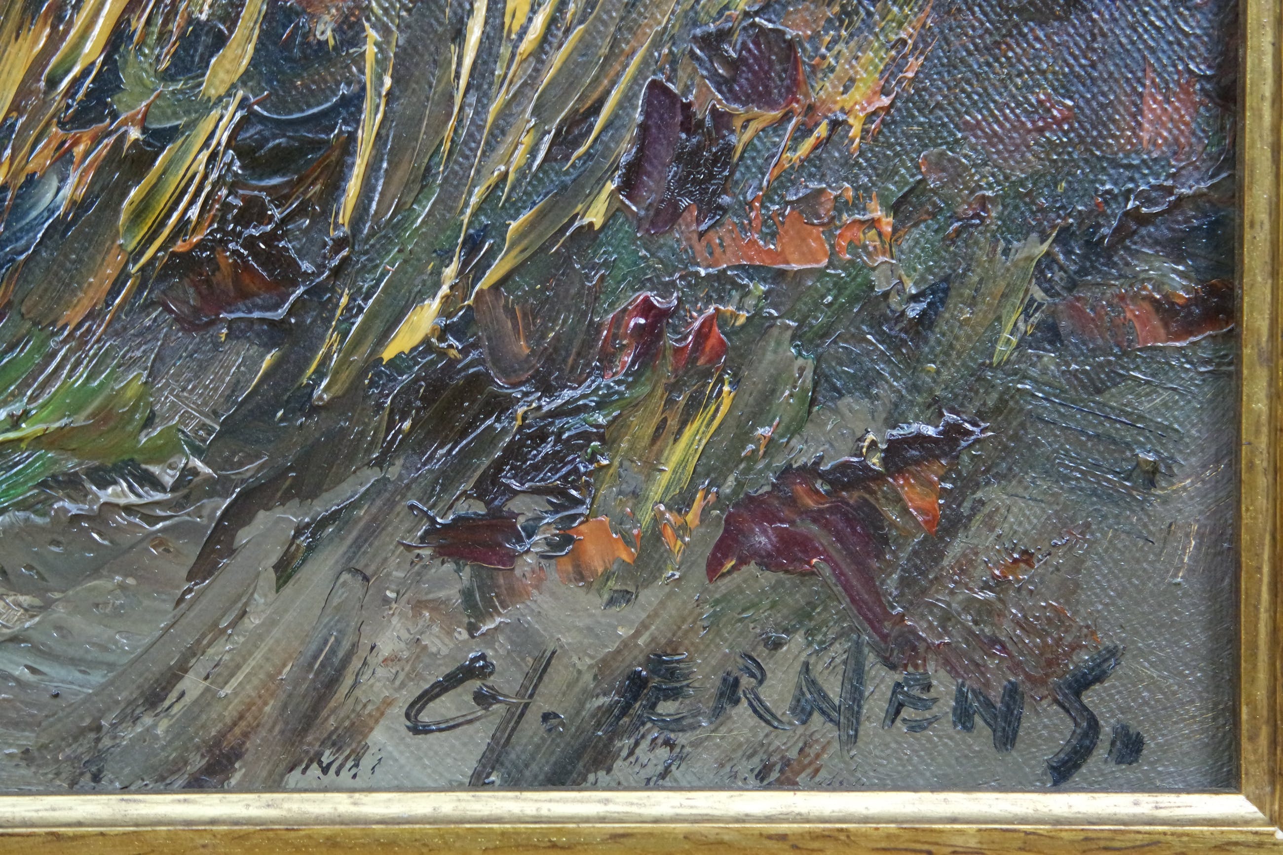 Info:Gerard Johannes Ernens werd in 1935 in Utrecht geboren, maar woonde en werkte in Antwerpen. Ernens kwam al jong in contact met de bekende kunstschilder J.Bevort, die hem hielp bij de ontplooing van zijn talent. Na Bevort werkte hij enige tijd samen met de interieur-en kerk schilder Jan Jumelet Ernens is vanaf het eerste uur een schilder van het paletmes.Omdat de verf door het paletmes op het doek wordt gemend, verkrijgt men de effecten die niet licht zijn te benaderen. Geïnspireerd door het werk van Bevort, is hij zich hierop gaan toeleggen en met verwonderlijke resultaten. Zijn schilderijen hebben een licht impressionistische inslagen zijn toch duidelijk herkenbaar. Hoofdzakelijk schildert hij landschappen. Zijn landschappen hebben een hollands karakter, deze sfeer wordt bijzonder gewaardeerd. Ernens geniet reeds nu een grote bekendheid en is sterk komende. Steeds komt er weer een nieuwe kijk op zijn werk.
