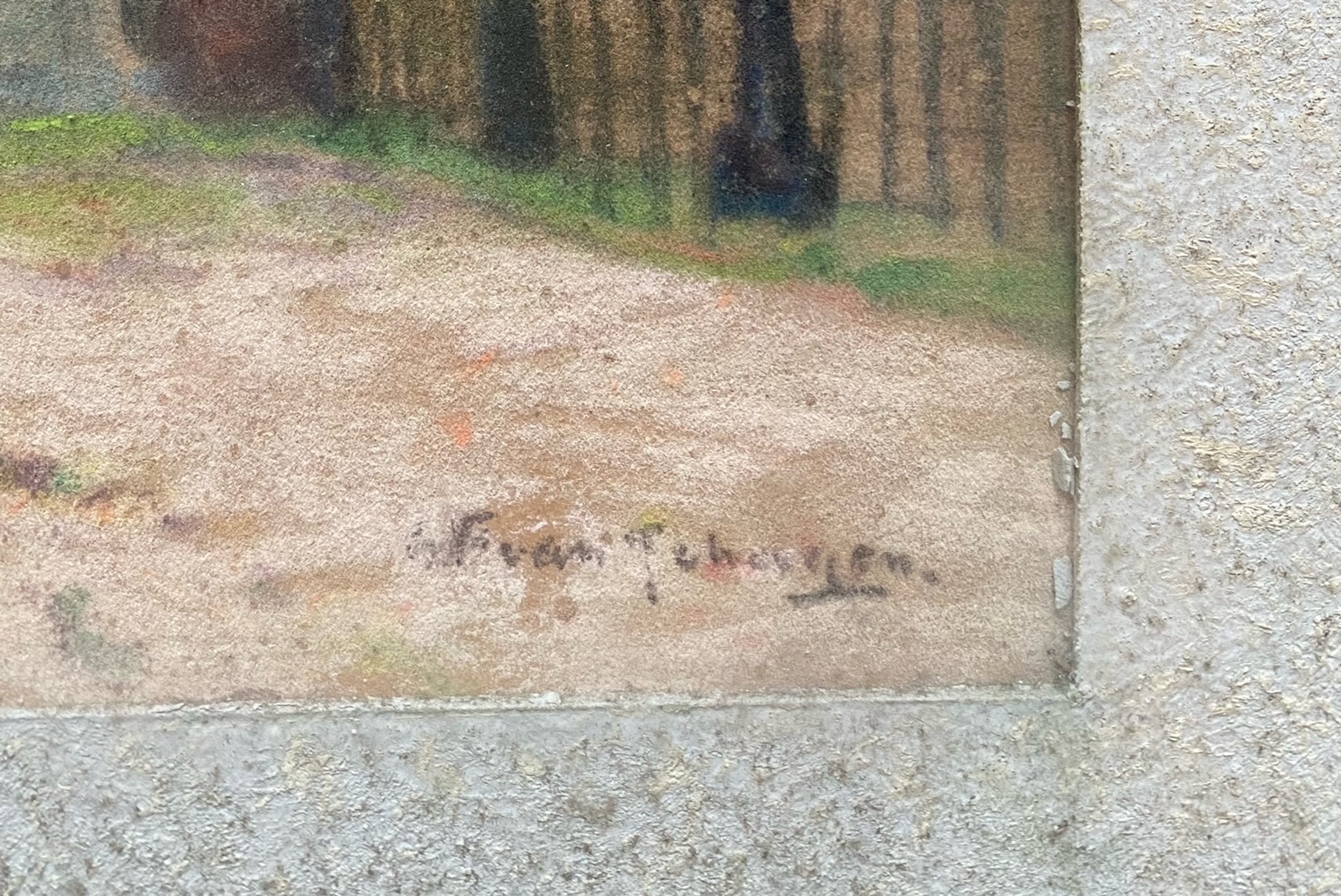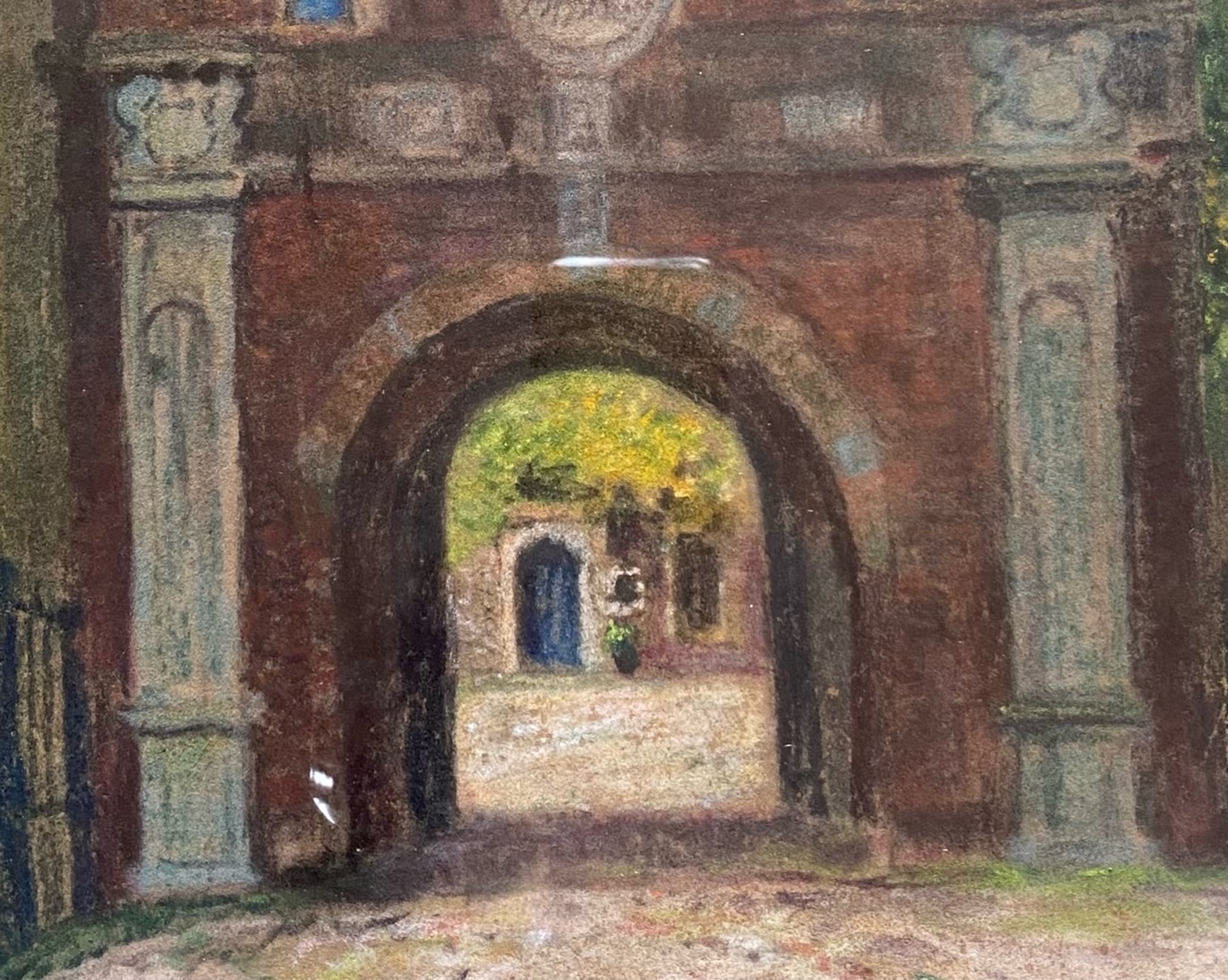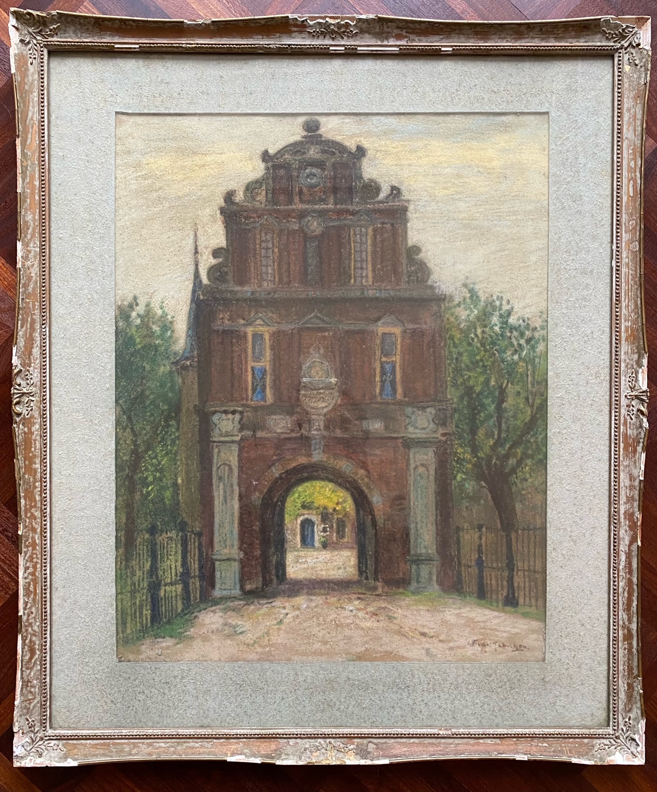 Deze grote pastel is van een toegangspoort (niet bekend waar). De kleur en helderheid is nog erg goed. De lijst is echter gehavend en zou samen met passe-partout vervangen moeten worden. Dat laatste is echter niet mijn specialisme.