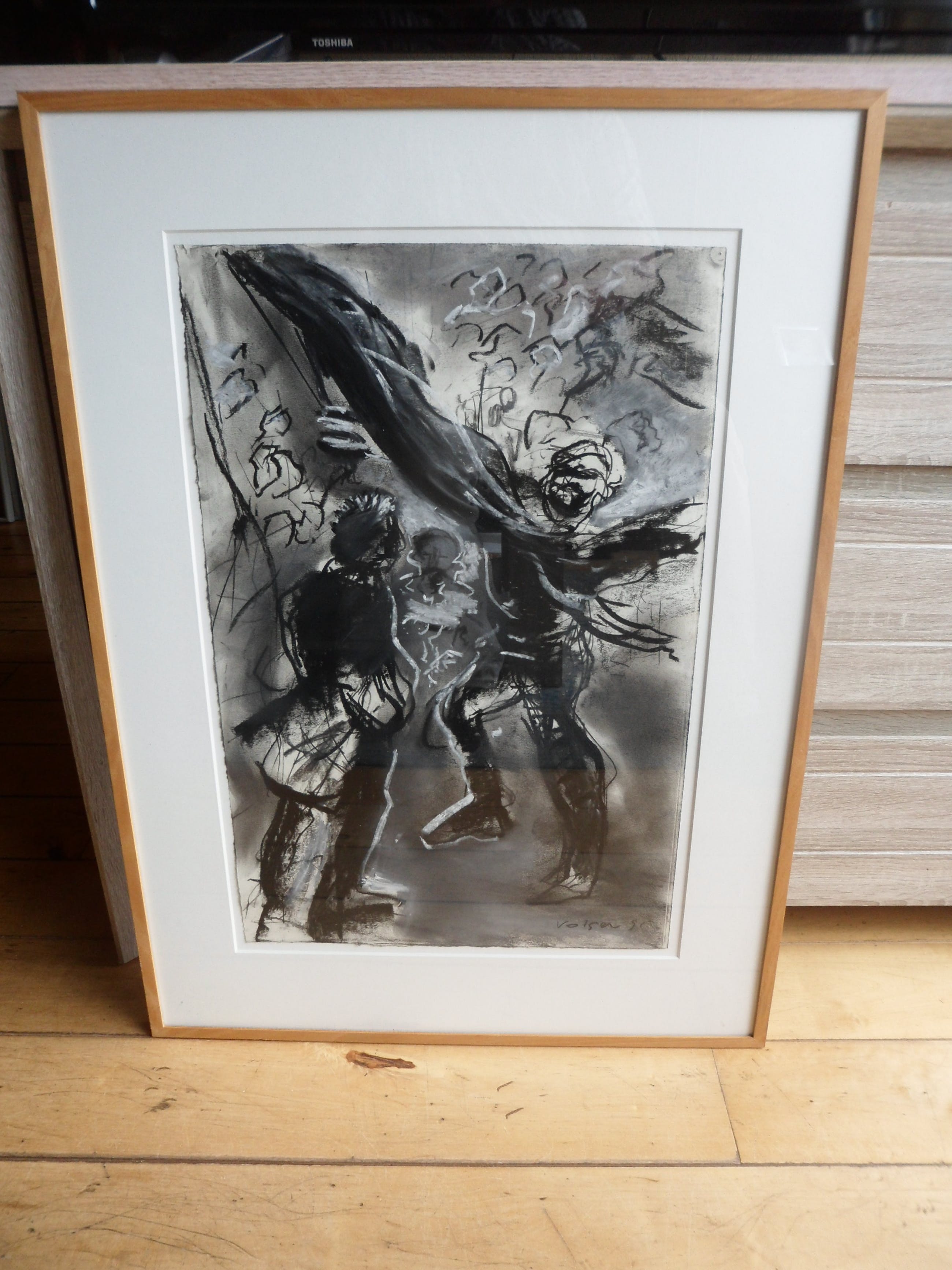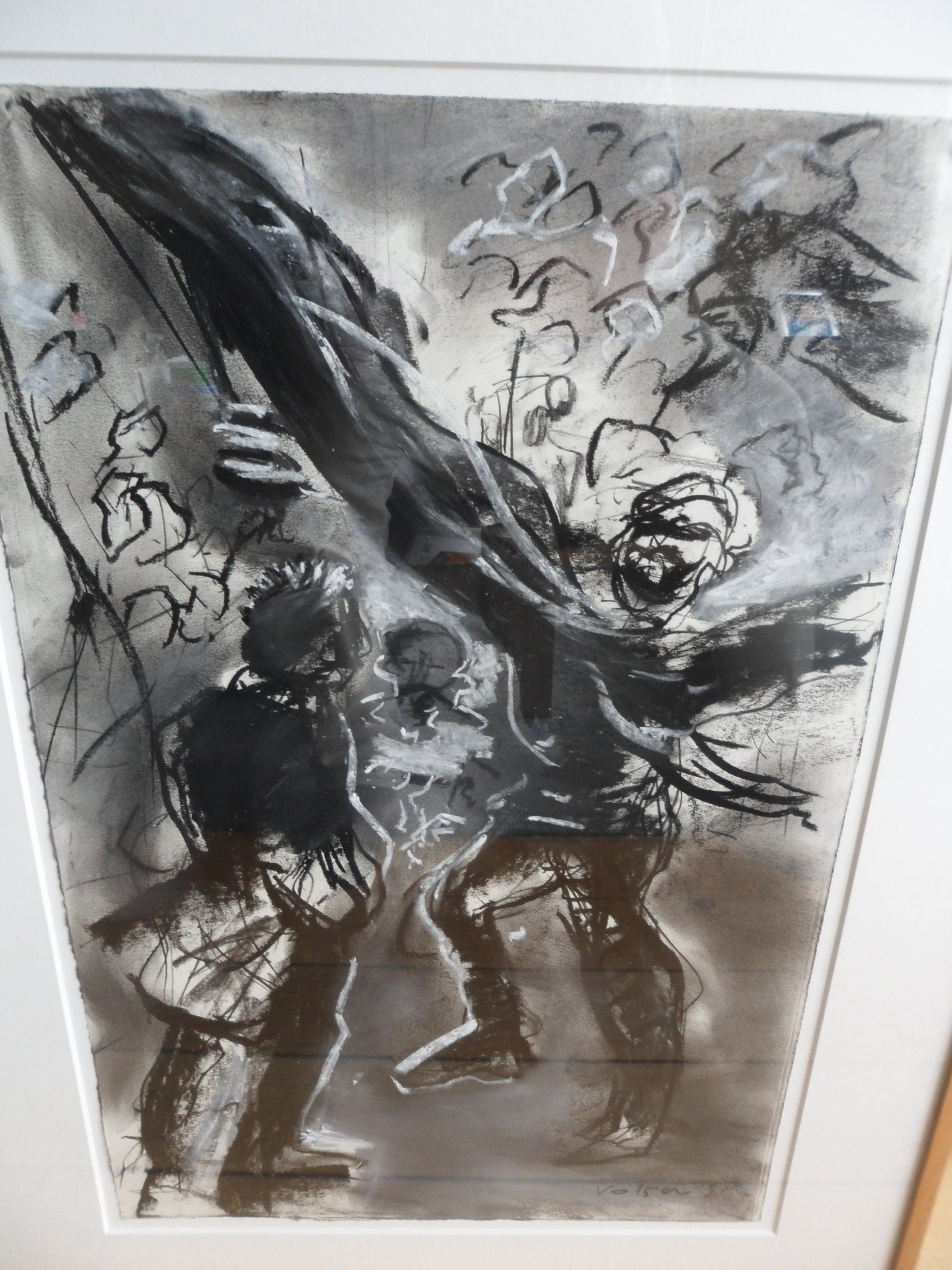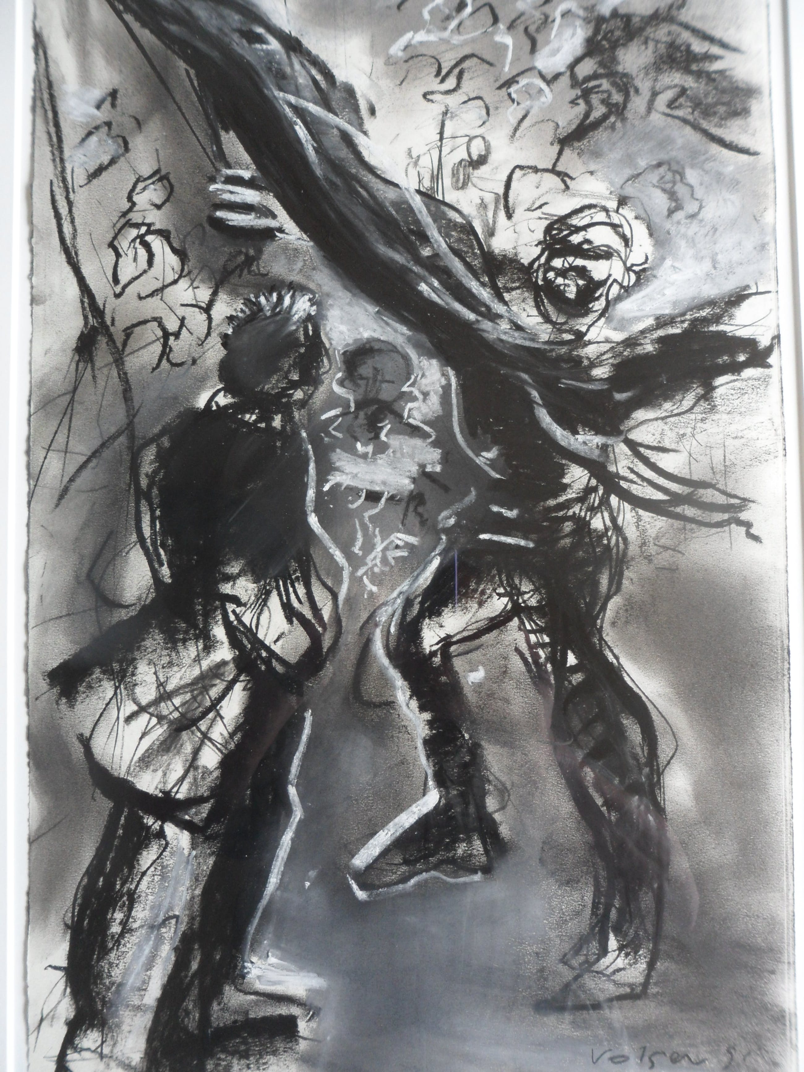 Houtskool en pastelkrijt op papier. Titel Straatfeest.