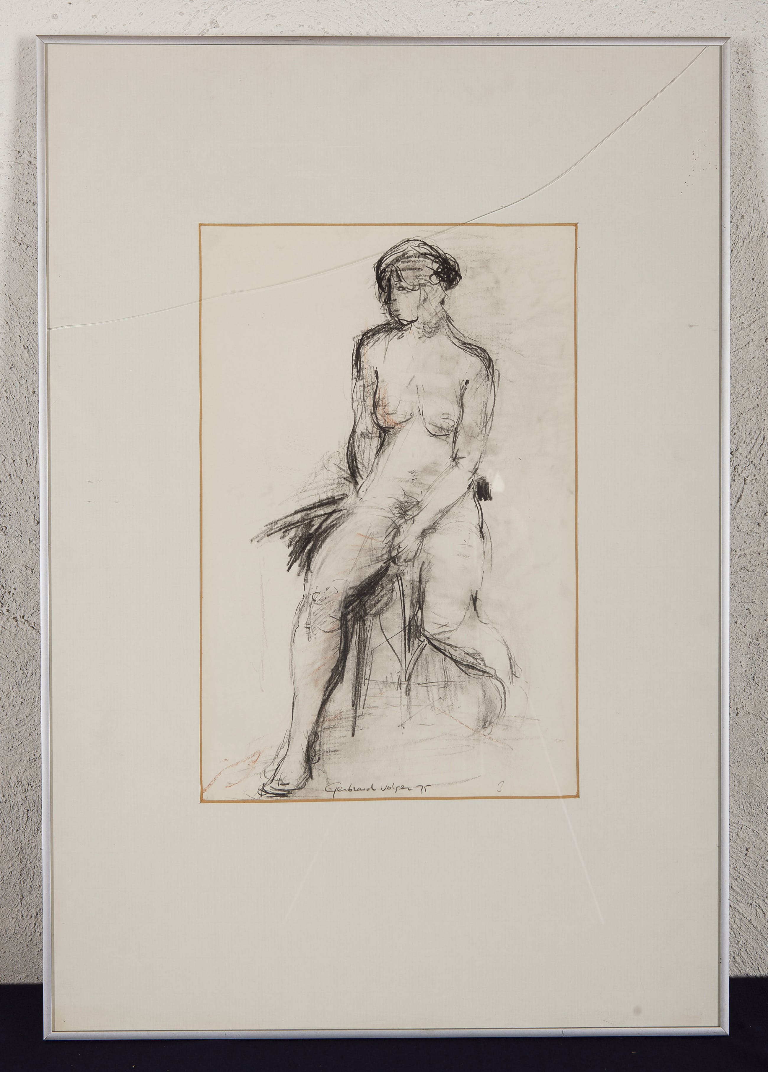 | De glasplaat van de lijst ontbreekt. Er is een kleine beschadiging aan het passe-partout aan de rechter bovenzijde. | |