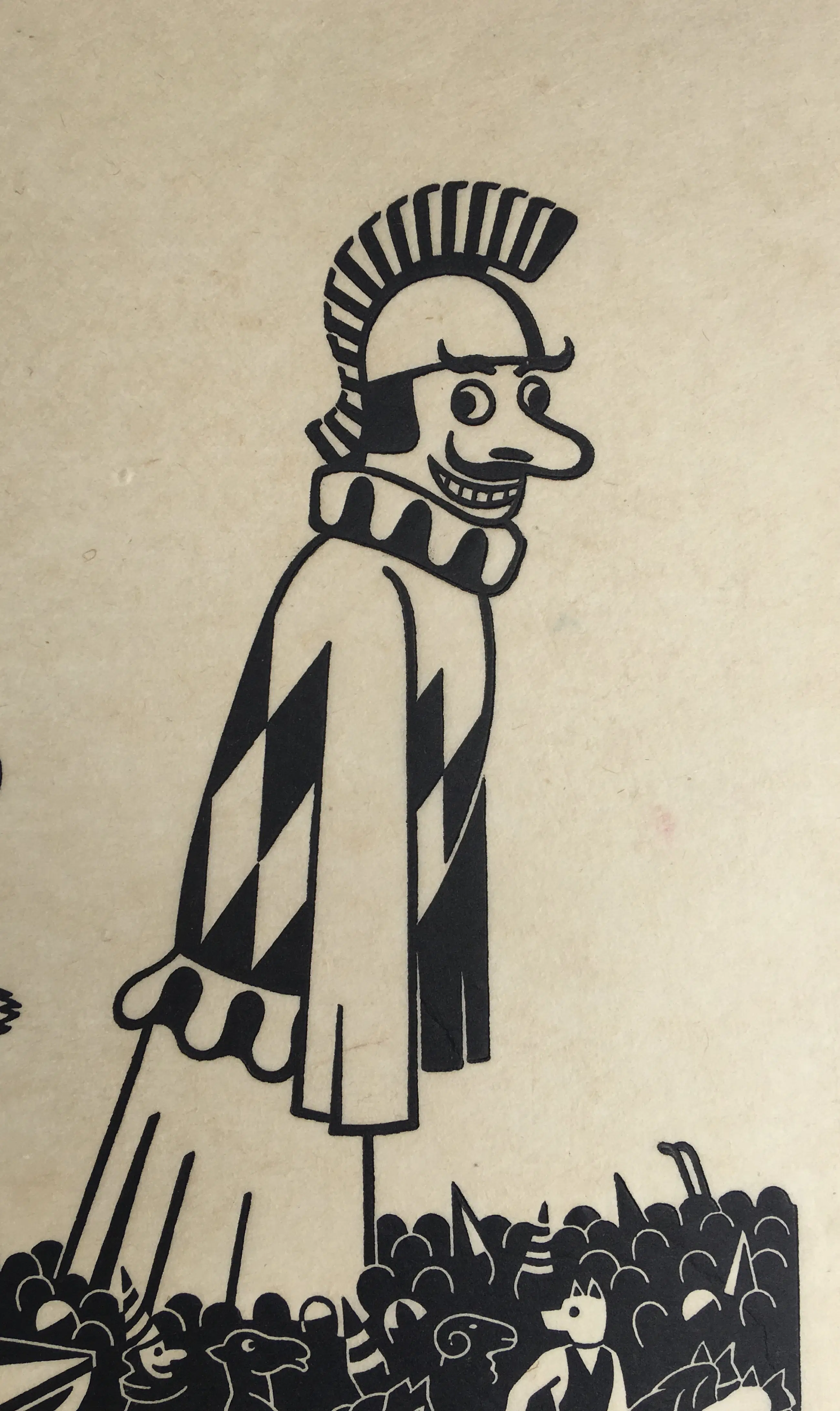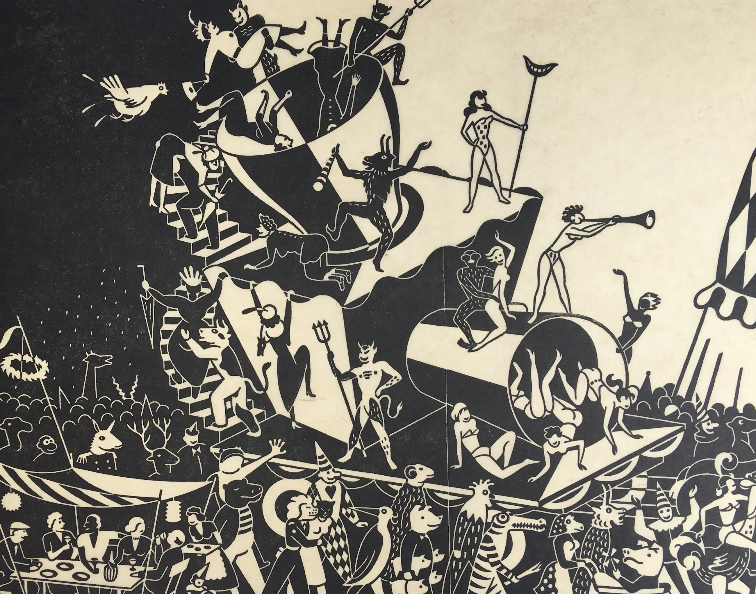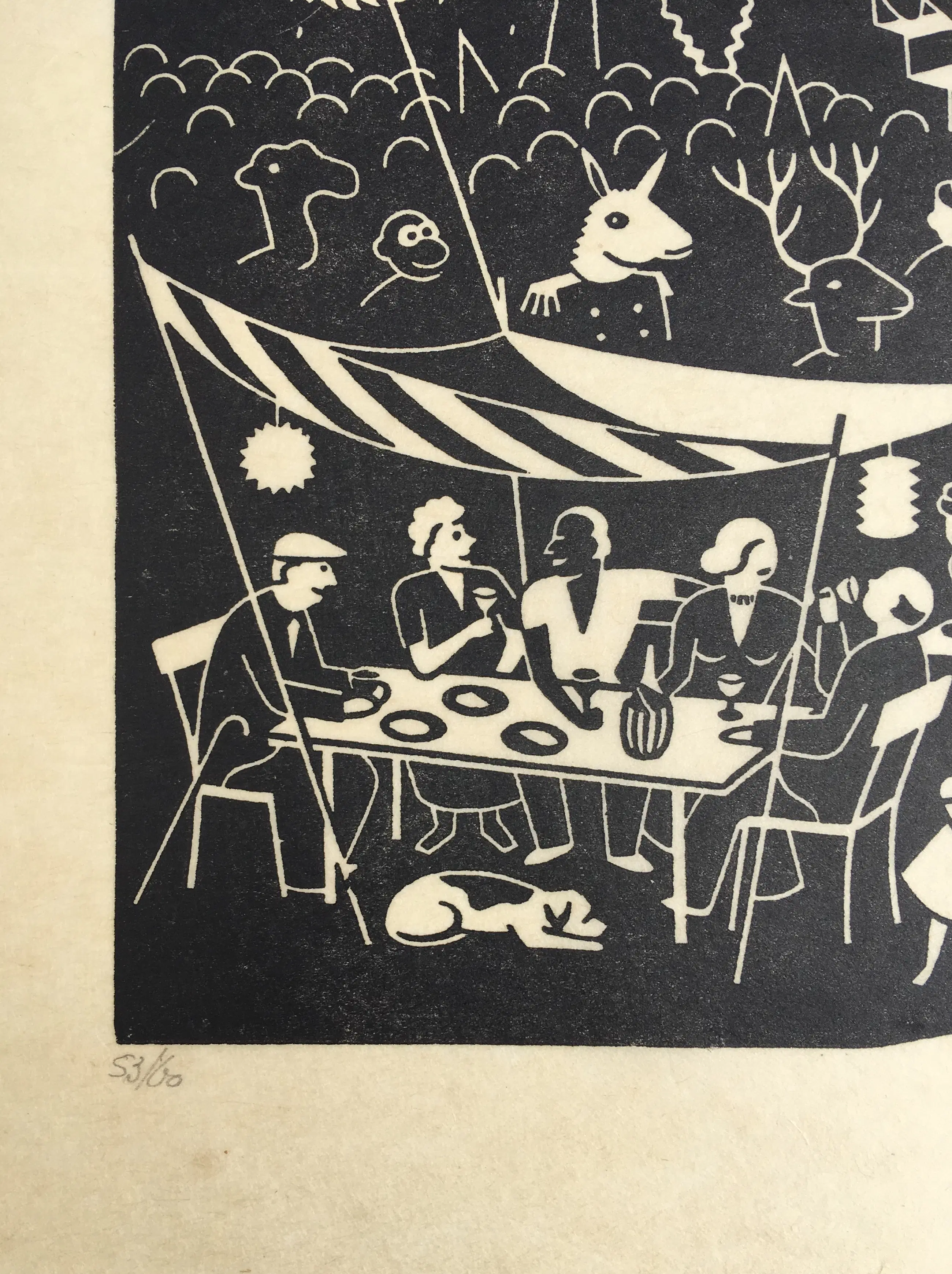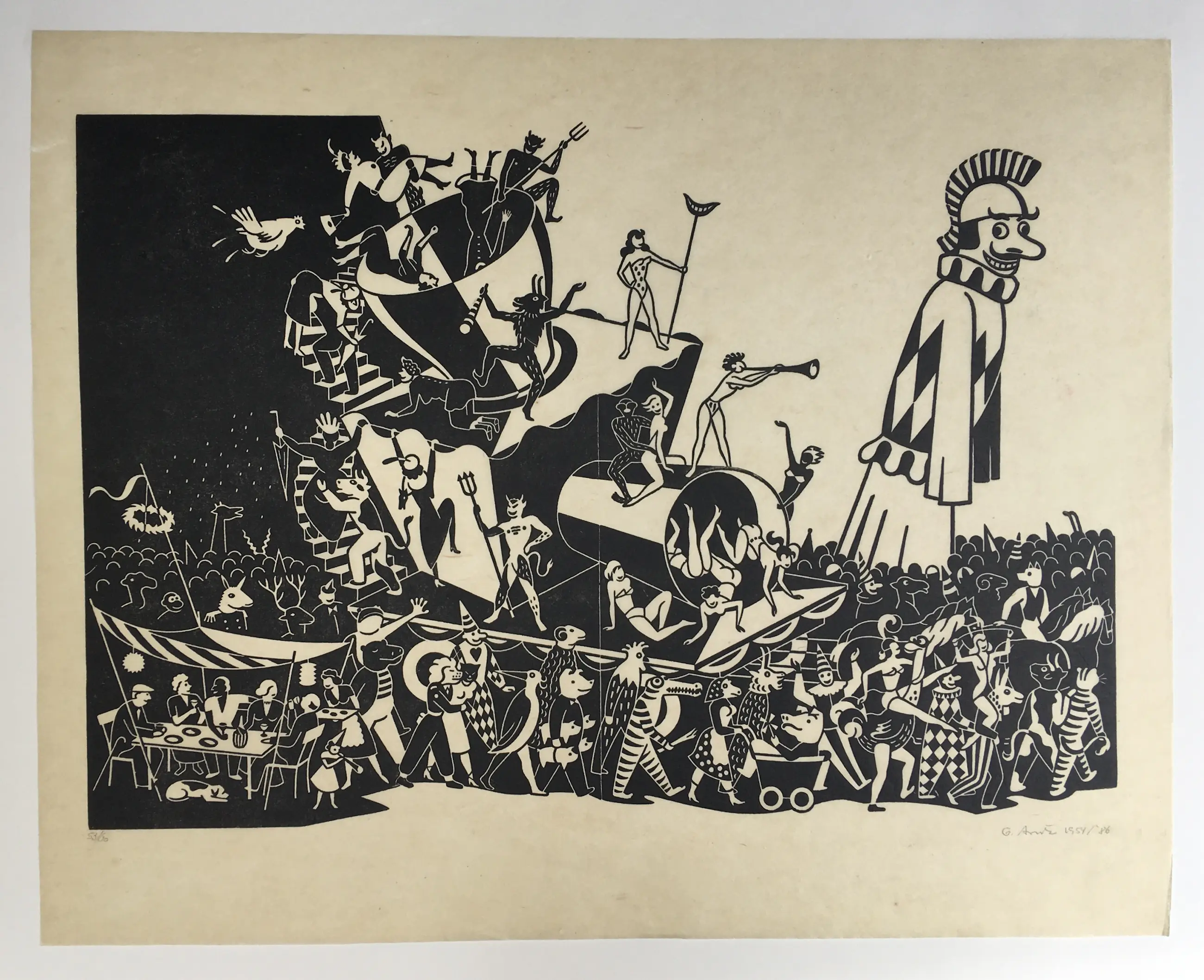 Een fraaie linoleumsnede van Gerd Arntz getiteld: Carnaval - Een verjongingsmolen - 1954/1986. Het werk is uitgevoerd op handgeschept Japans ‘Kozo’ naturel papier. Oplage 53/60
