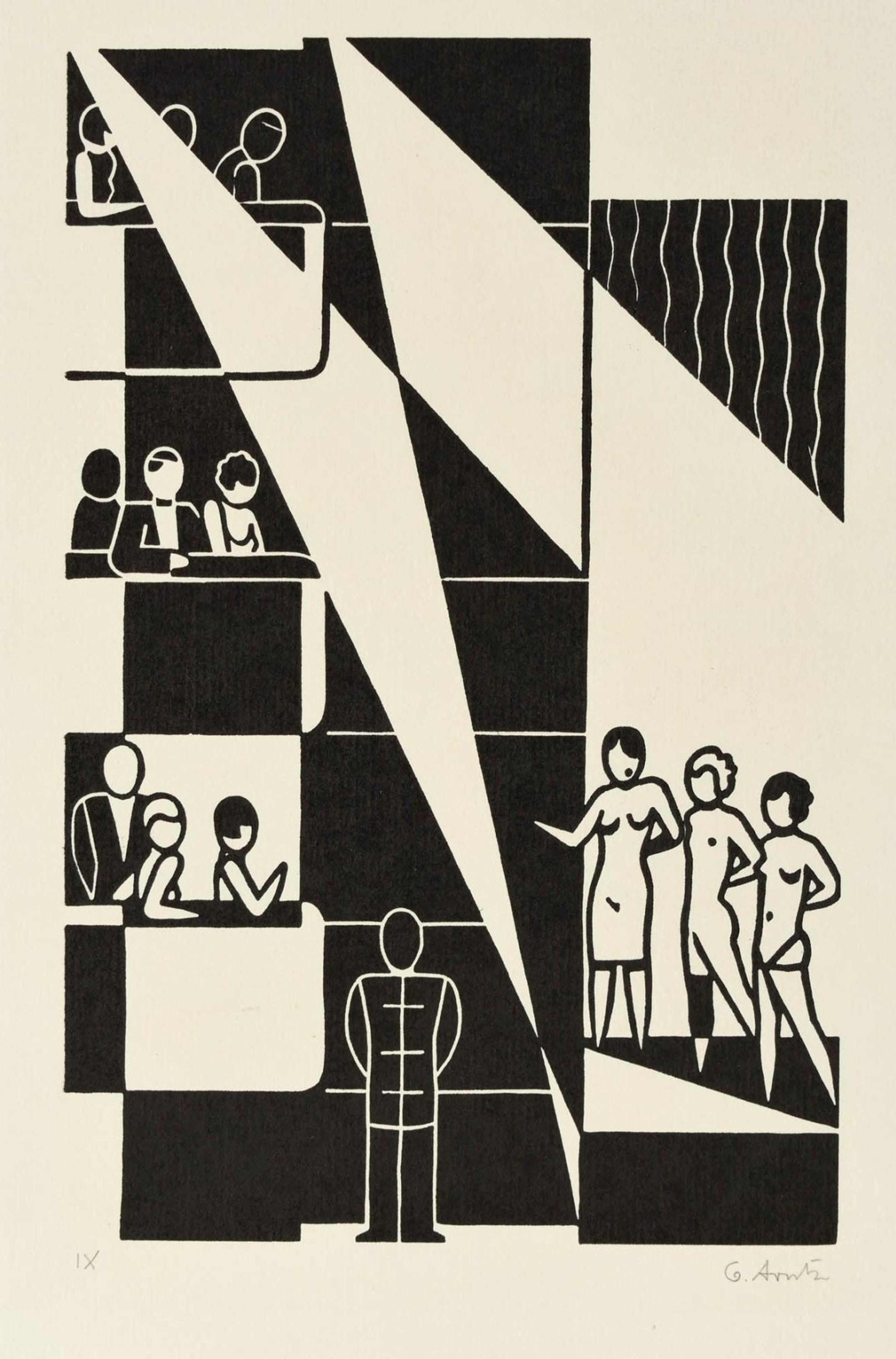 Gerd Arntz (1900 Remscheid - 1988 Den Haag) Theater. Original-Holzschnitt 1927. Druck von 1973 auf chamoisfarbenem Bütten. Handsigniert unten rechts: G. Arntz. Nummeriert unten links: IX. Rückseitig Montagereste. Gute Erhaltung – sehr satter Plattenton. Dies ist einer der legendären Holzschnitte aus dem Arntz-Zyklus „12 Häuser der Zeit“.