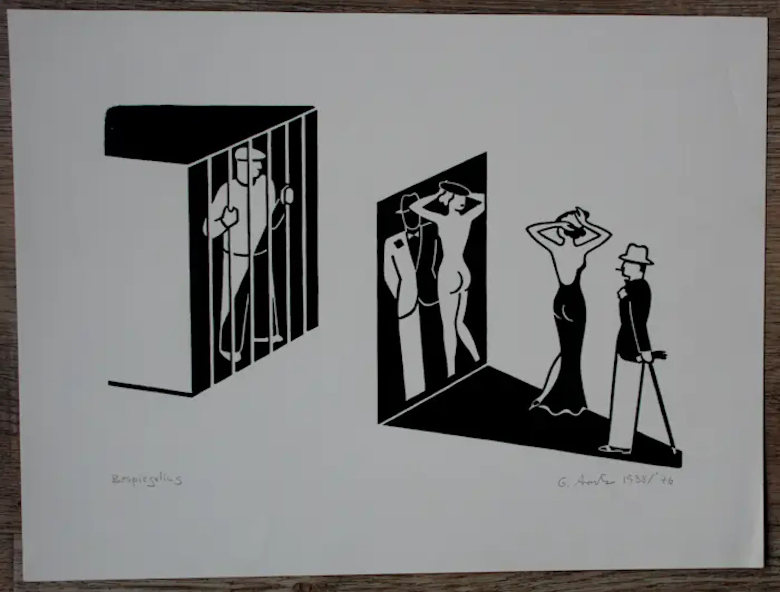 Zeefdruk van Gerd Arntz. Titel: Bespiegeling. Jaar: 1976. Afmetingen blad: H24.5 x b32.5cm. Afmetingen voorstelling: H17 x b24cm. Het werk is, rechts onderaan, door de kunstenaar, gesigneerd met potlood. De authenticiteit van het, aangeboden, werk wordt volledig gegarandeerd. Een certificaat van echtheid kan, op aanvraag, worden gemaild.