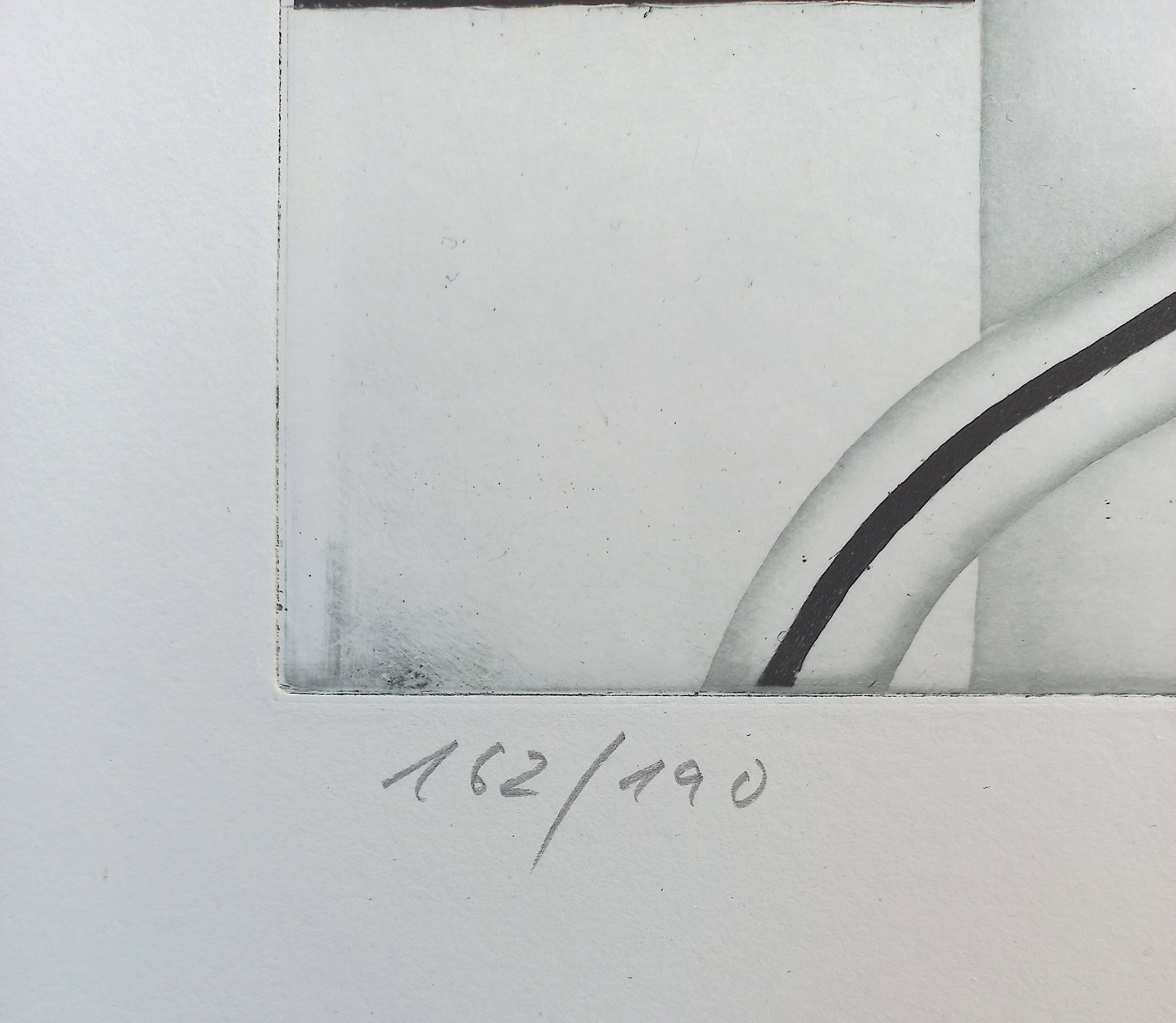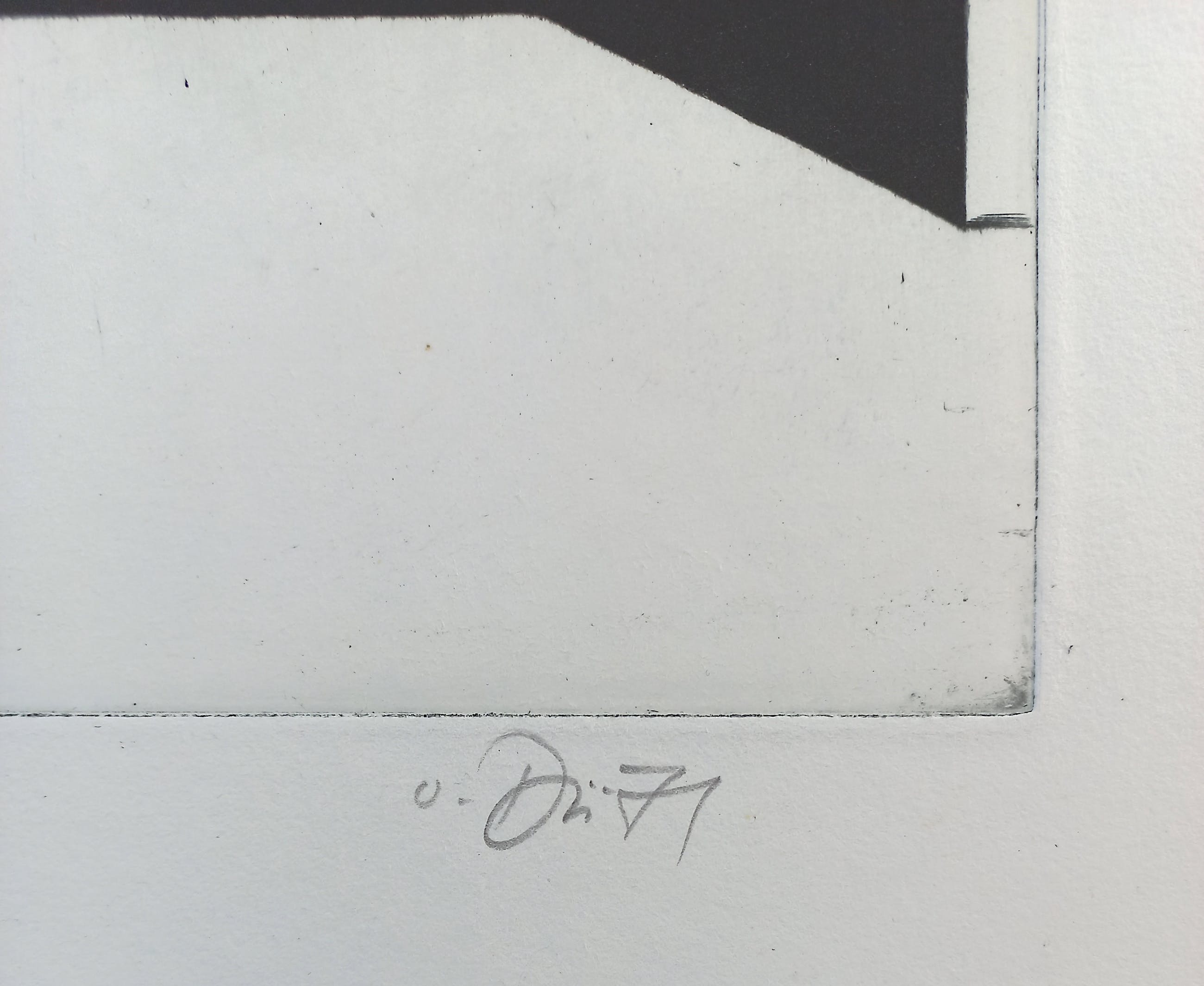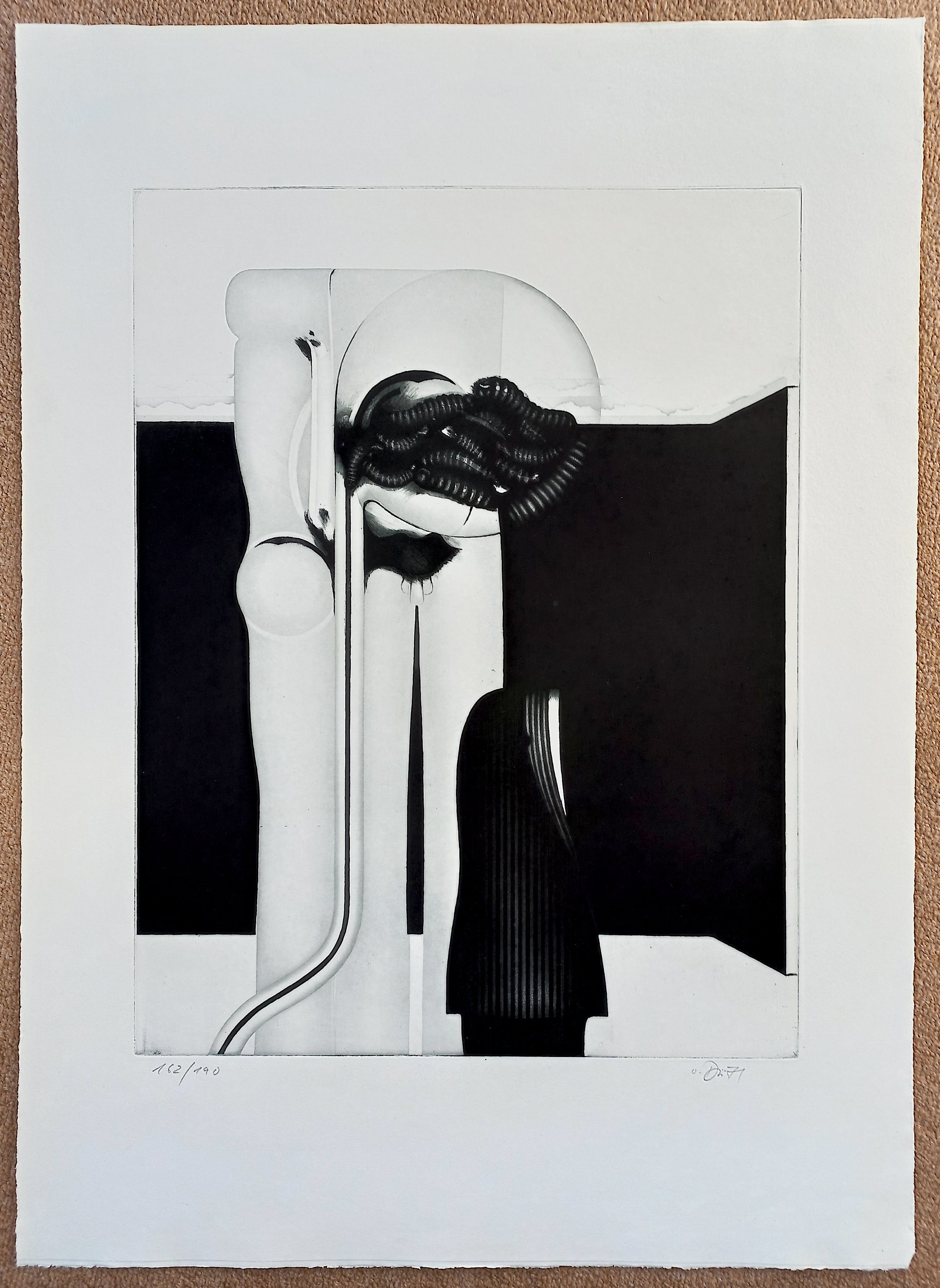 Apart, karakteristiek werk van Gerd van Dulmen. Aquatint ets op geschept papier, met potlood gesigneerd, gedateerd (‘71) en genummerd (162/190). In zeer goede conditie.