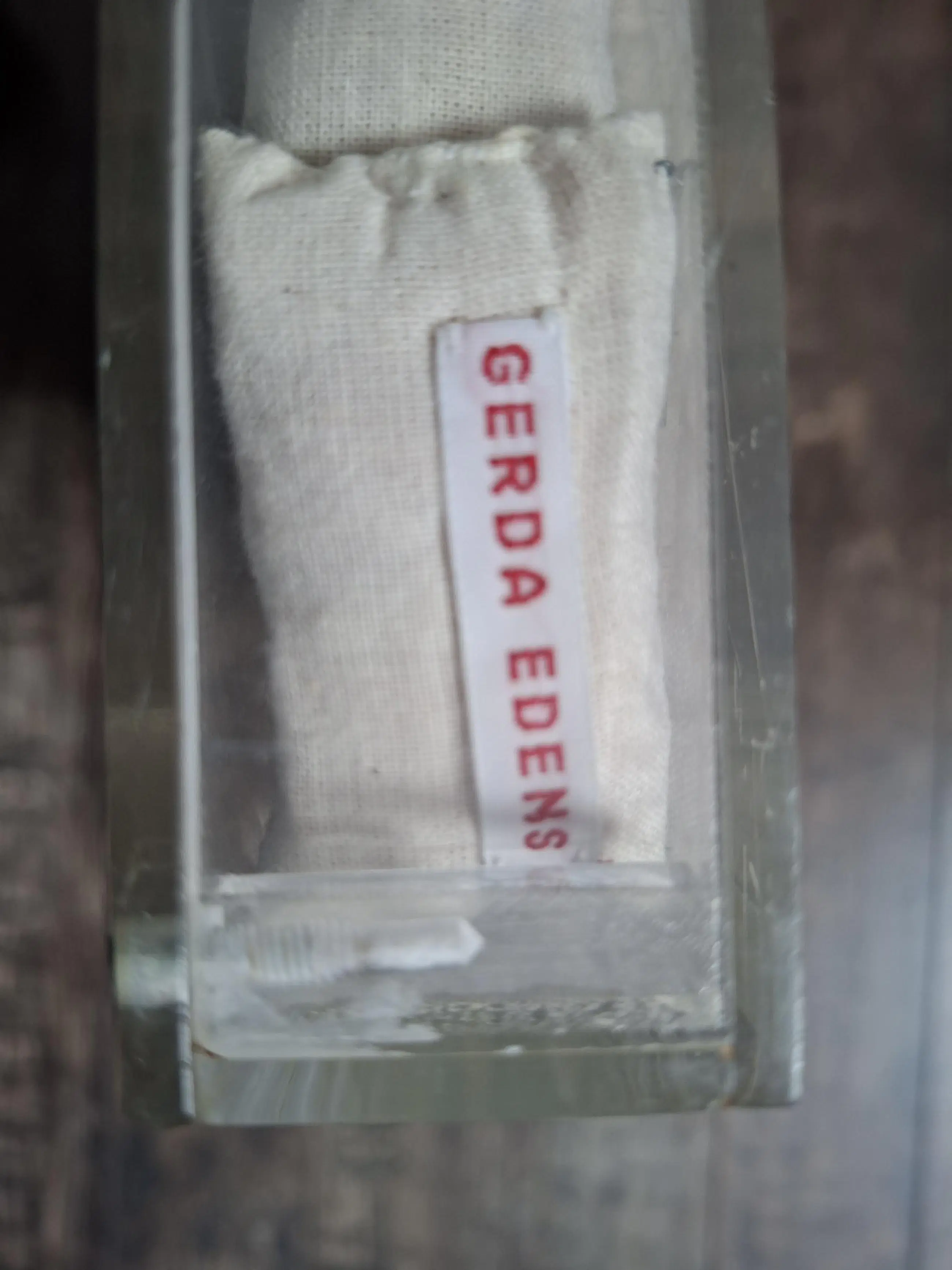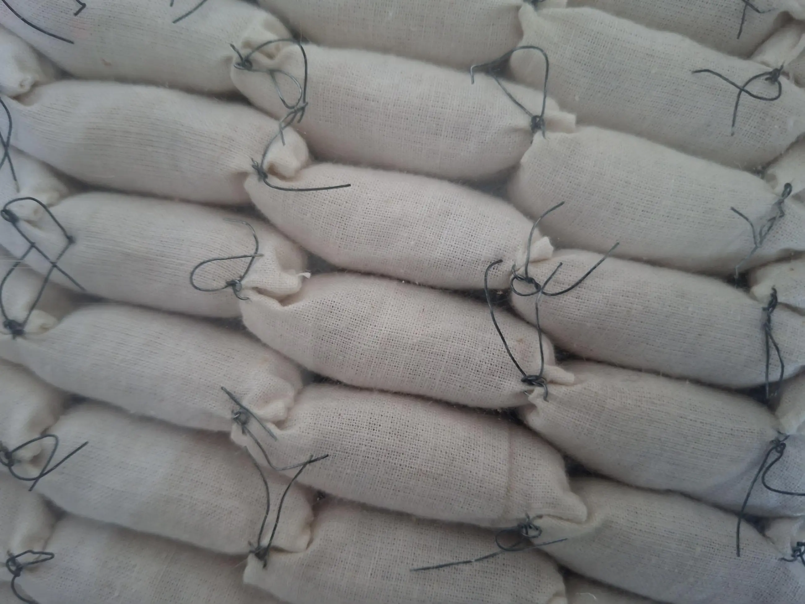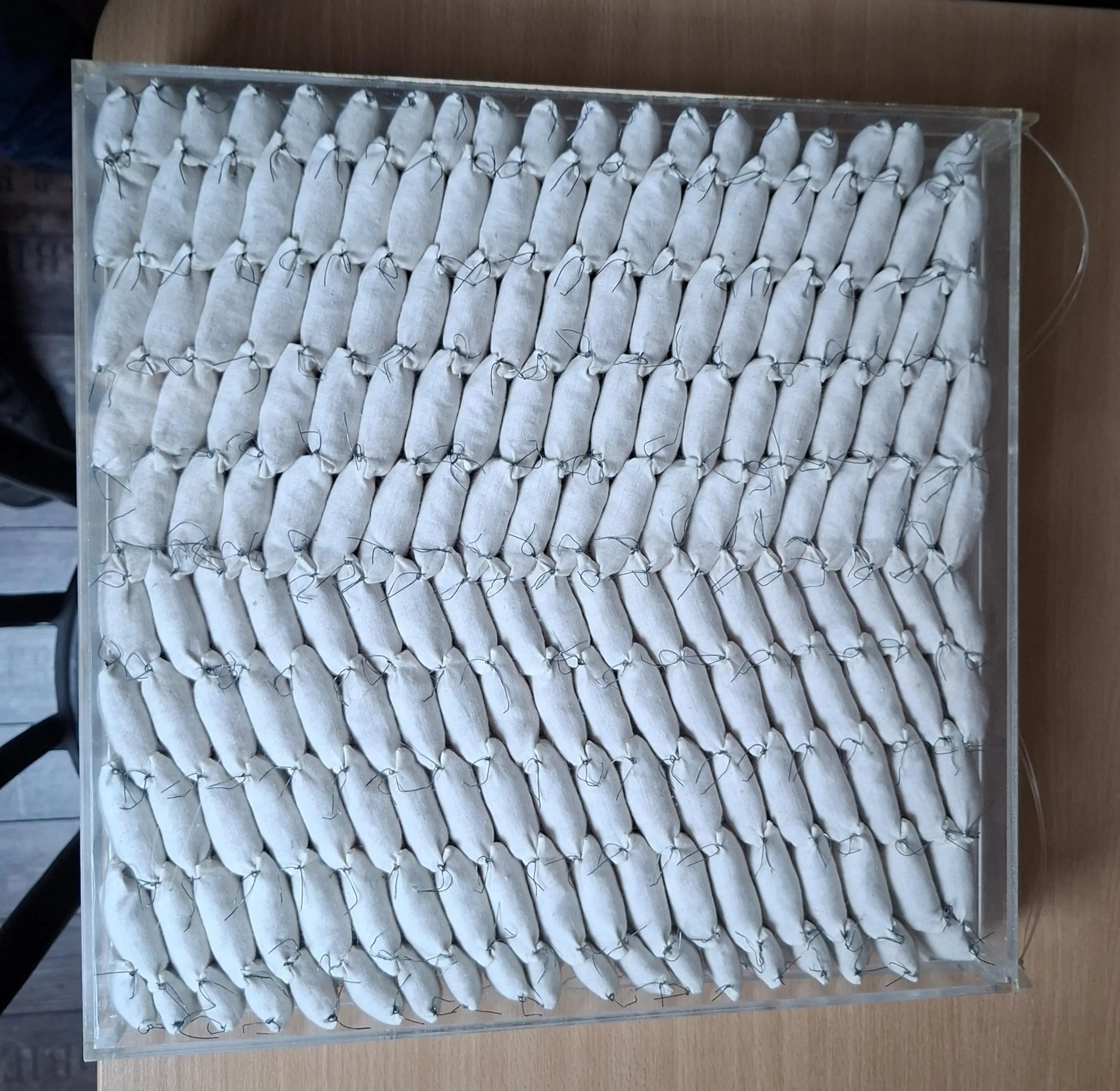 2 abstracte assemblages van stoffen zakjes in perspex