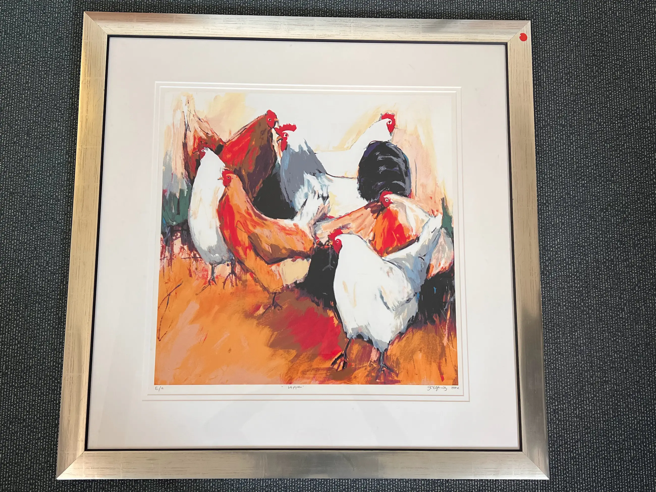 Een origineel mooi levendig werk van Gerda Elfring waarop een groep kippen staat afgebeeld. Gesigneerd. Uitstekende staat.