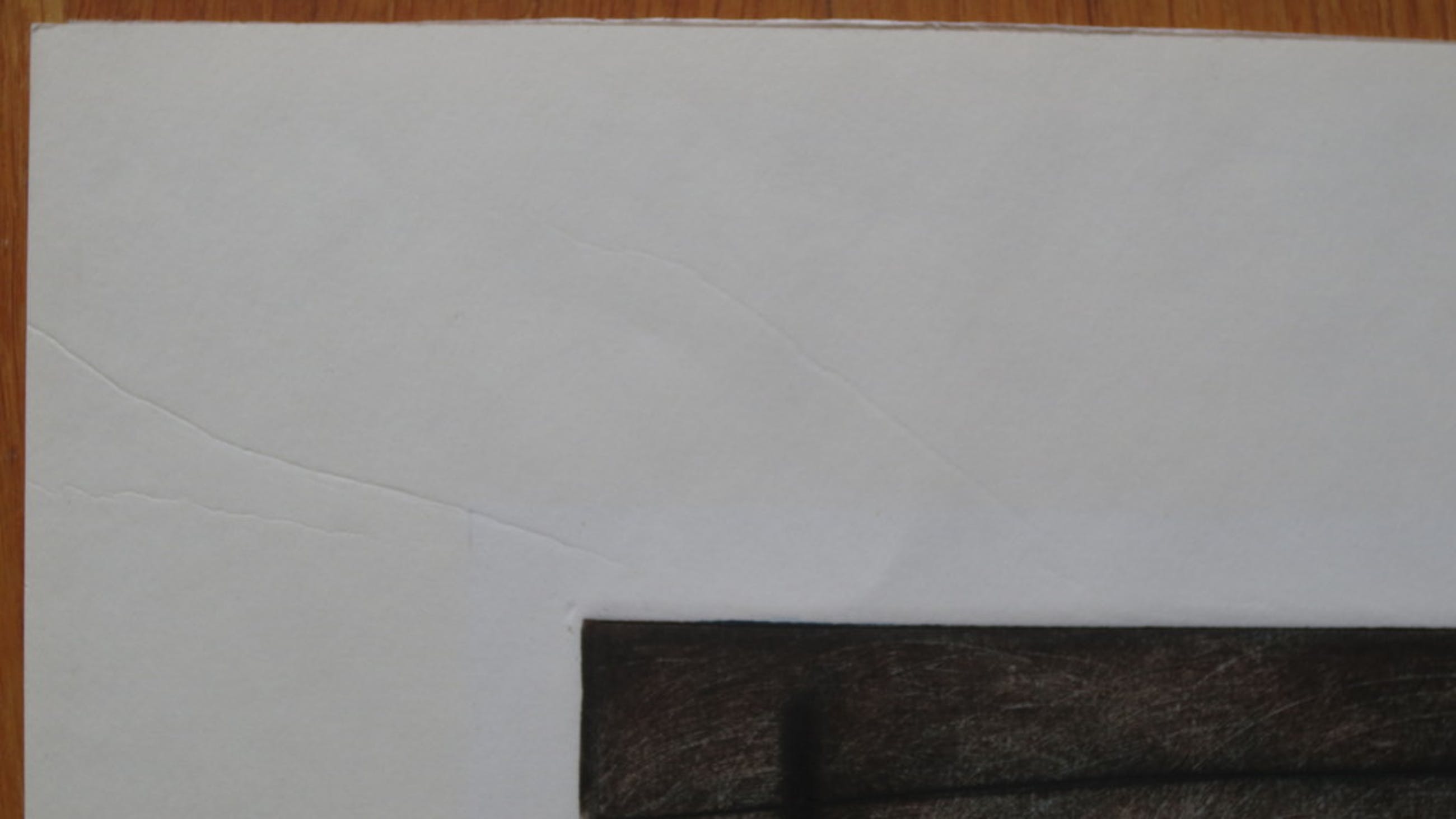 In witte kader zitten ter linkerzijde aan zowel boven- als onderkant enkele krassen. (detailfoto)
