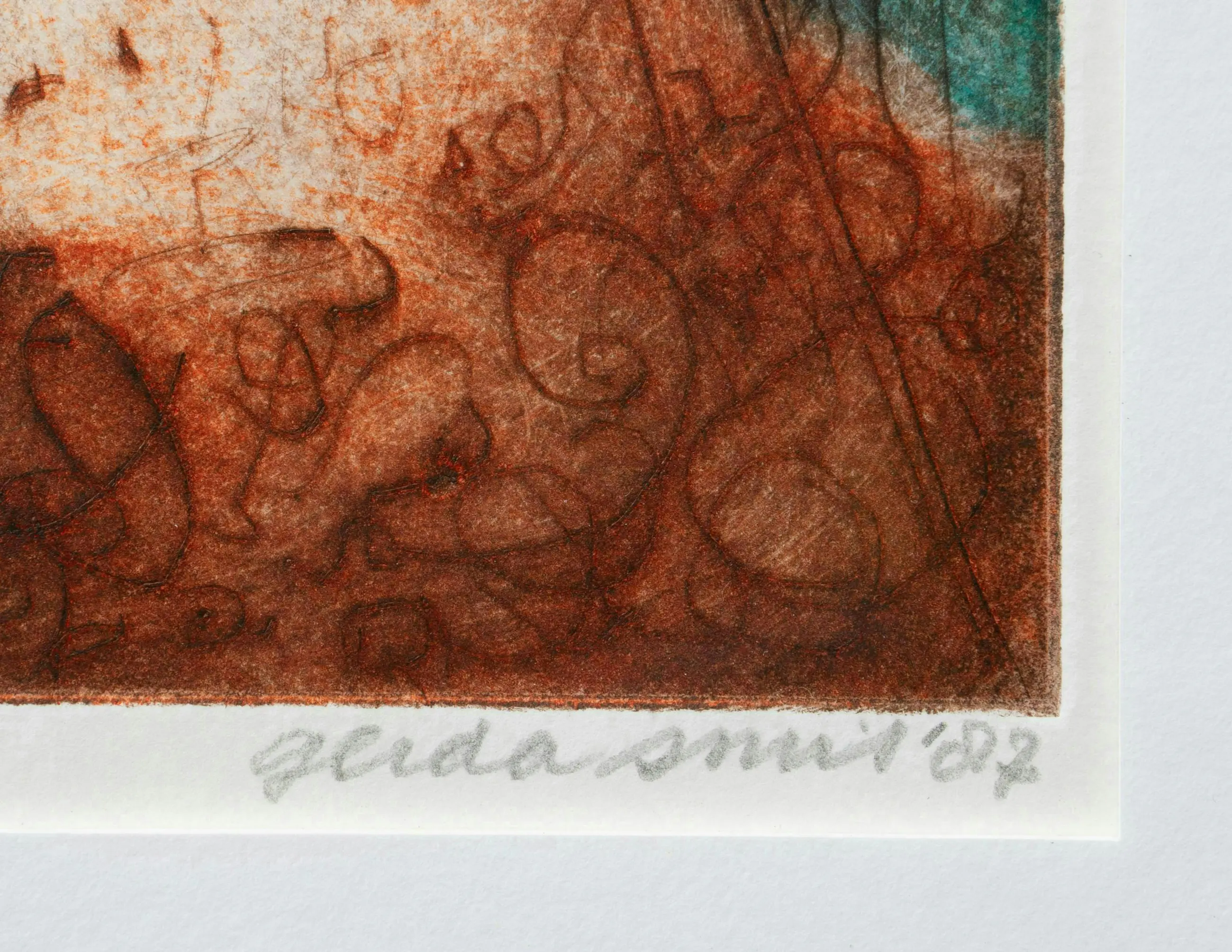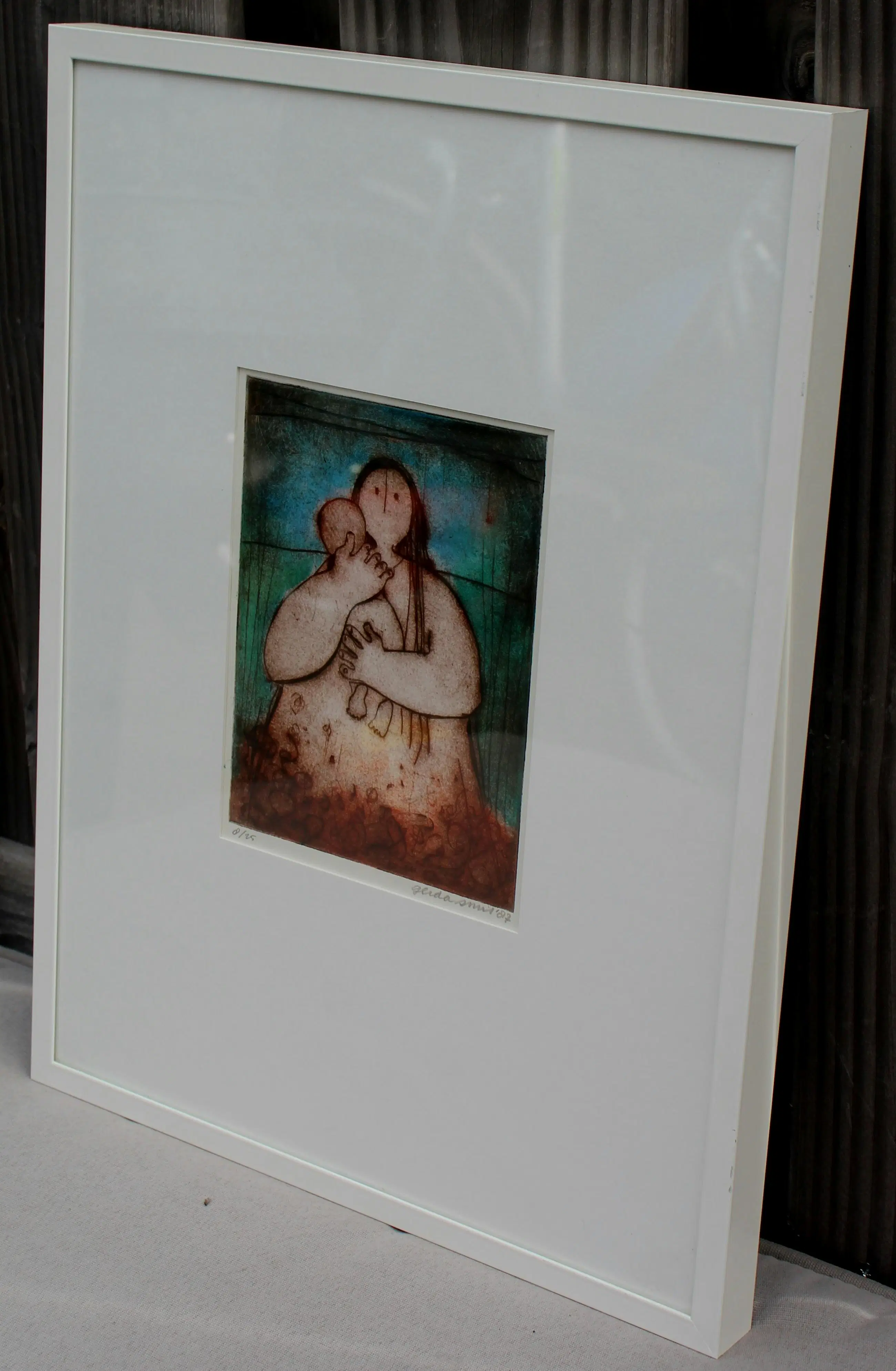 Ingelijste ets/aquatint van Gerda Smit. Titel: ‘Moeder en kind'. Oplage: 8/25. Afmetingen incl. lijst: H41 x B31cm. Afmetingen voorstelling: H18 x b13cm.