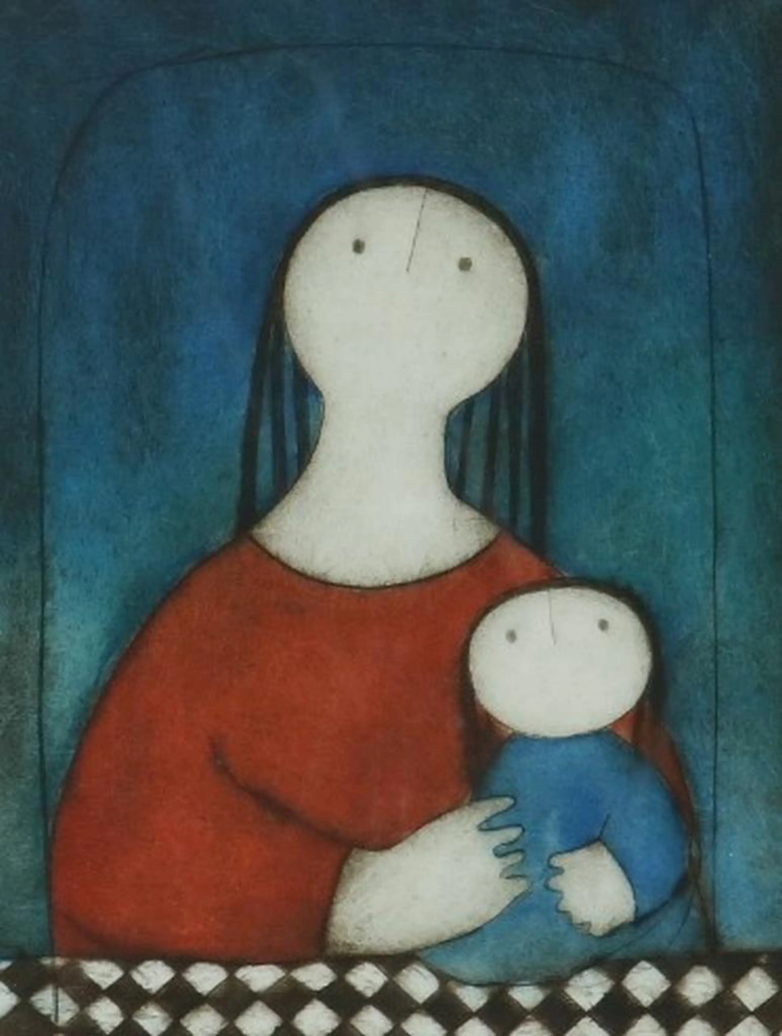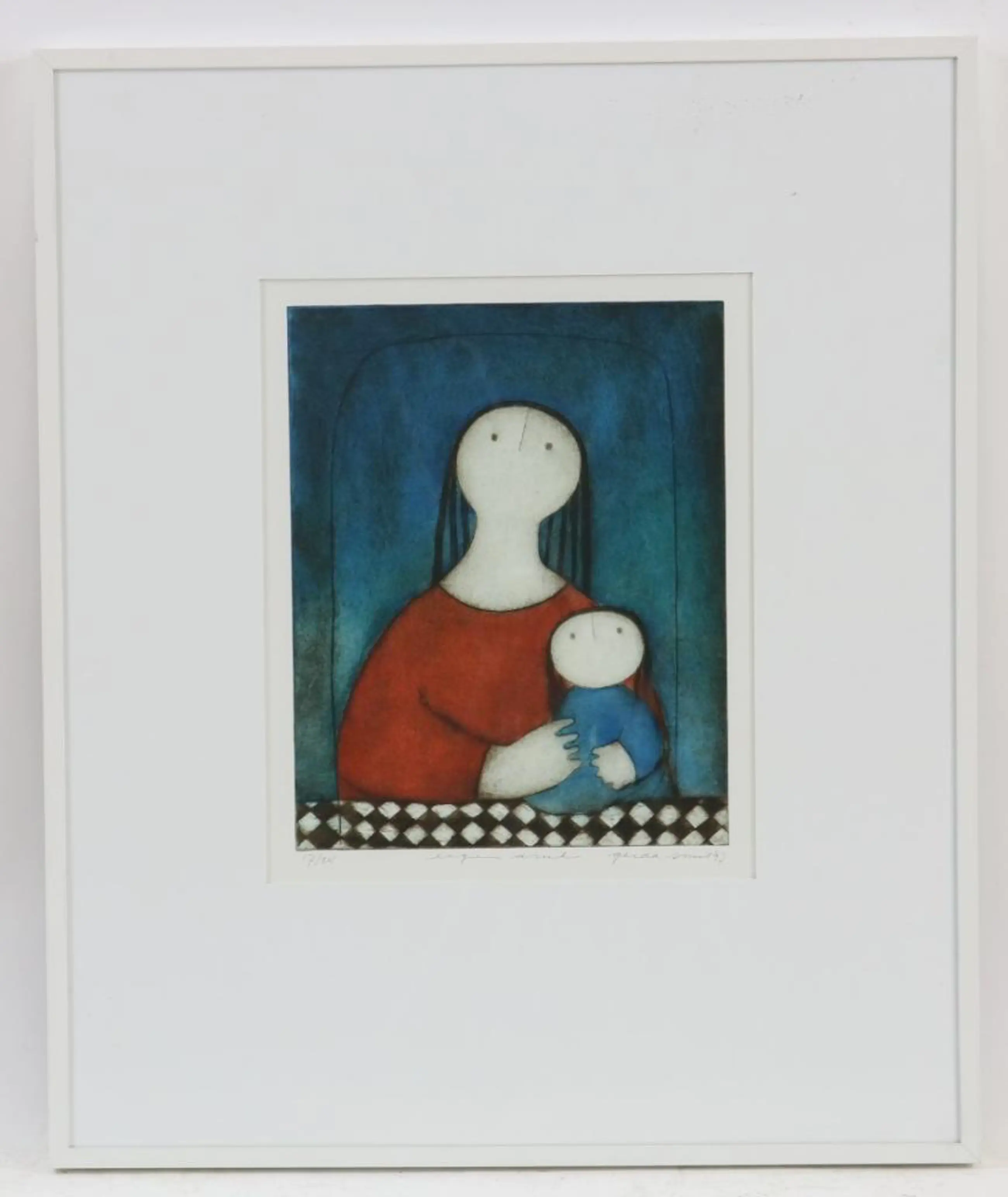 Kleurenets van Gerda Smit. Titel: Moeder met kind. Jaar: 1997. Oplage: 17/25. Afmetingen incl lijst: H61 x b51cm. Afmeting beeld: H29.5 x b23.5cm. Het werk is rechts onderaan, gesigneerd met potlood, door de kunstenares. De authenticiteit van het aangeboden werk wordt volledig gegarandeerd. Een certificaat van echtheid kan, op aanvraag, worden gemaild.
