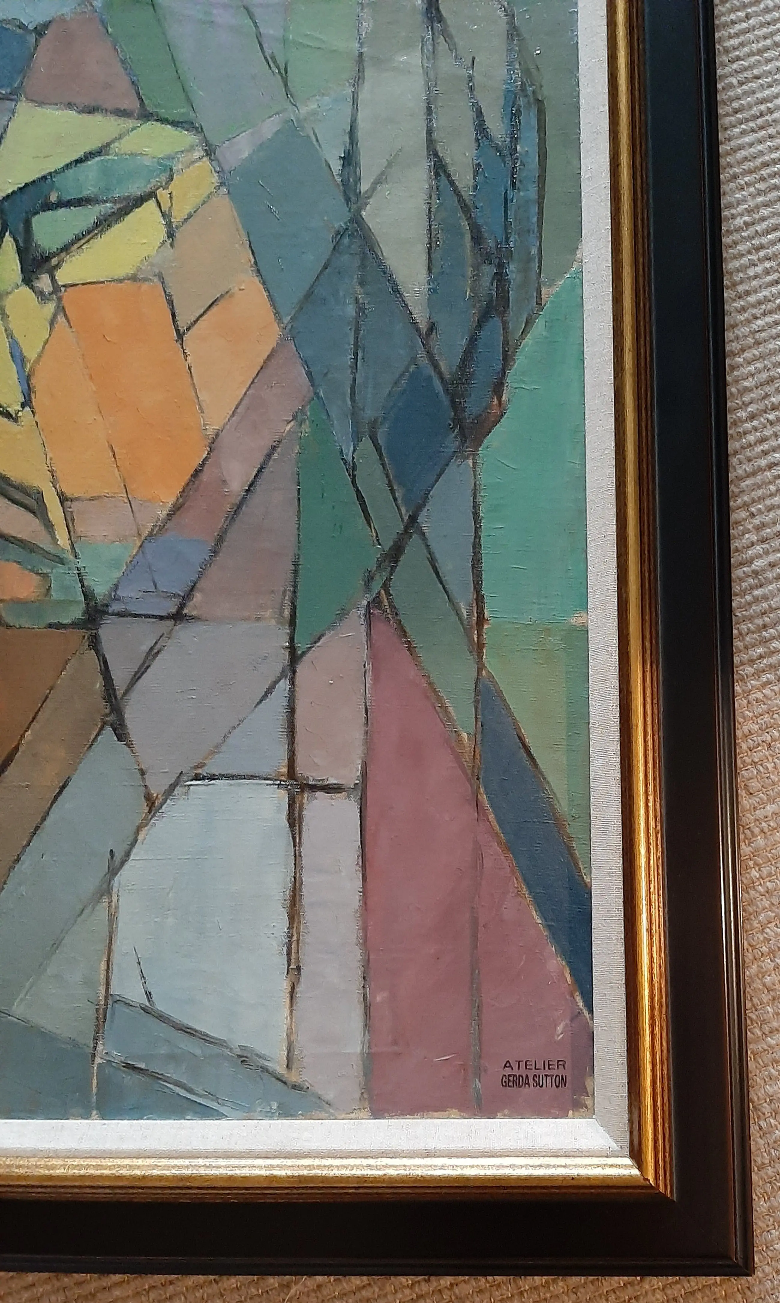 Gerda Sutton 1923-2005. De kunstenares werd in Engeland geboren, maar vertrok na haar studie aan de kunstacademie, naar Parijs. Daar zou ze blijven wonen en werken tot haar overlijden. Zij werkte met een helder palet in een neo kubistische stijl. Dit werk is aan de voorzijde voorzien van haar atelierstempel en aan de achterzijde gesigneerd.