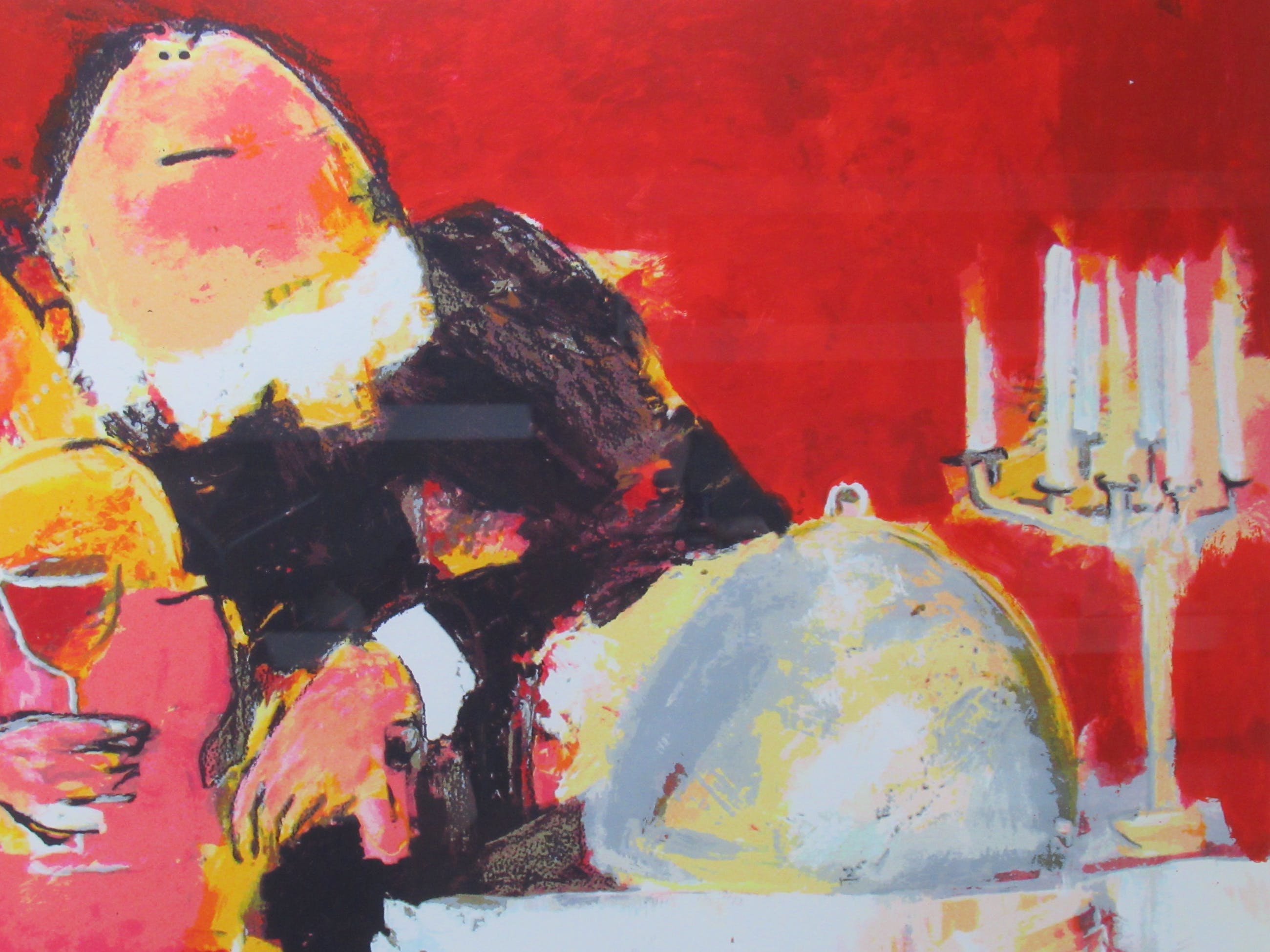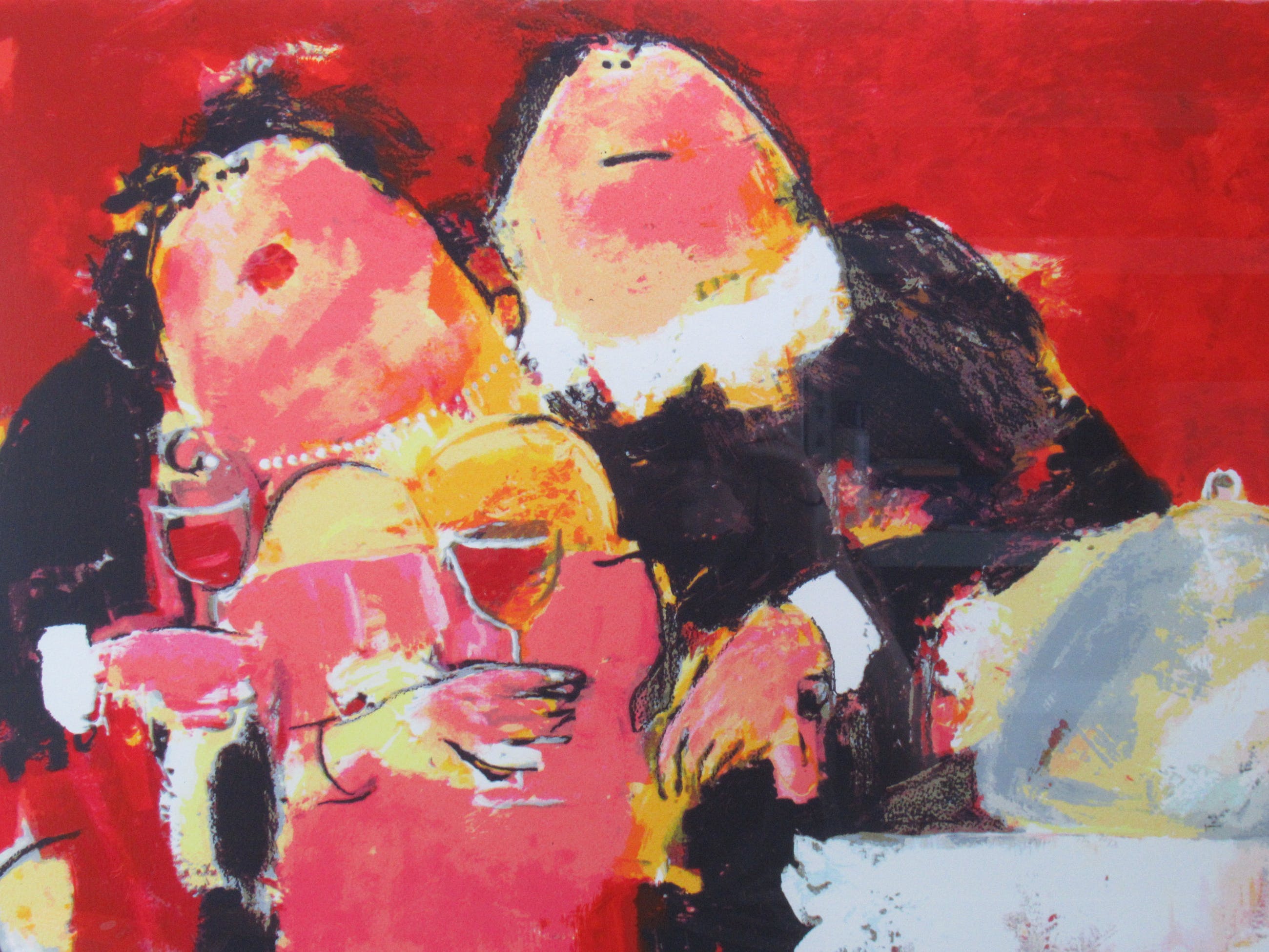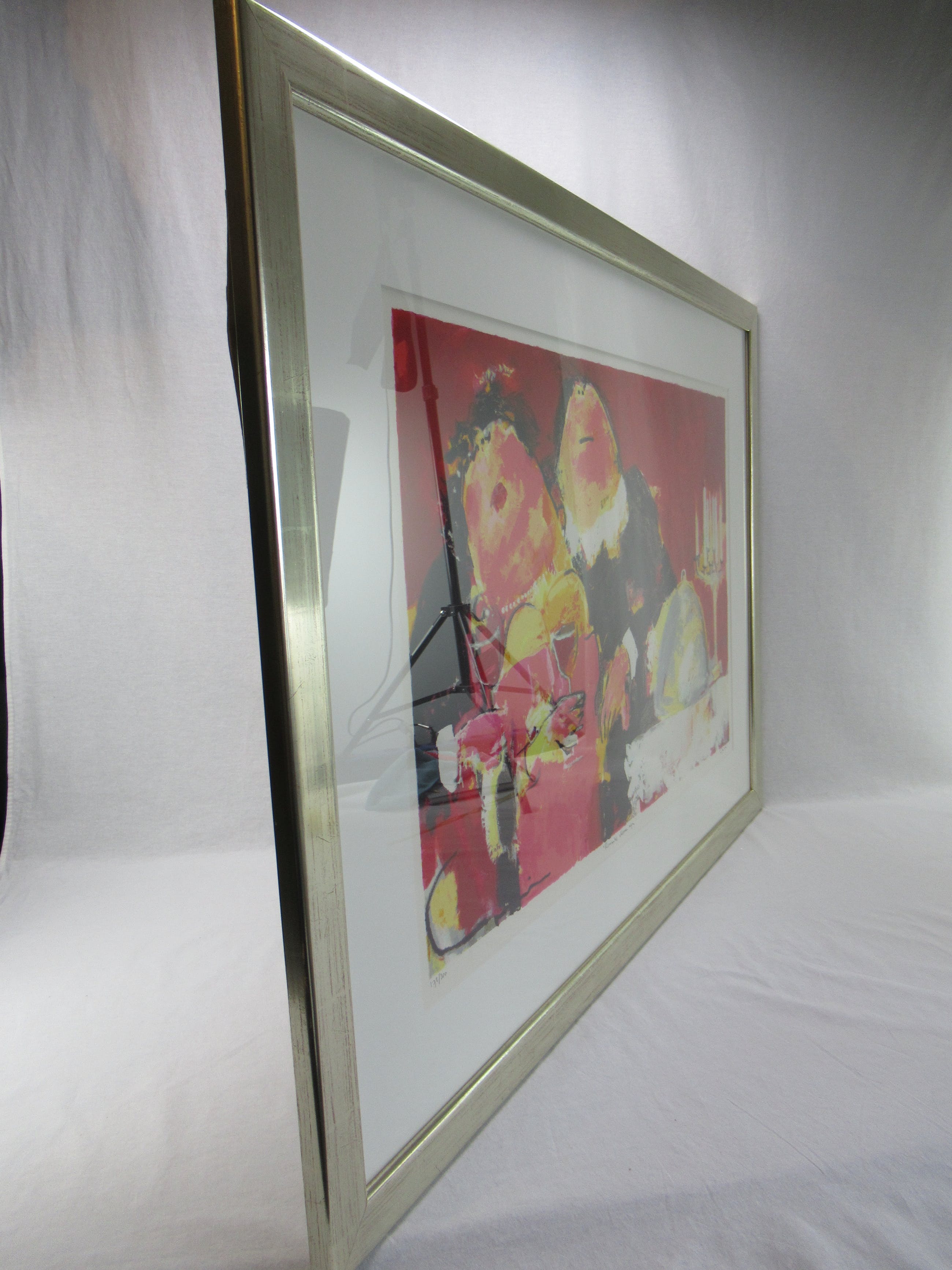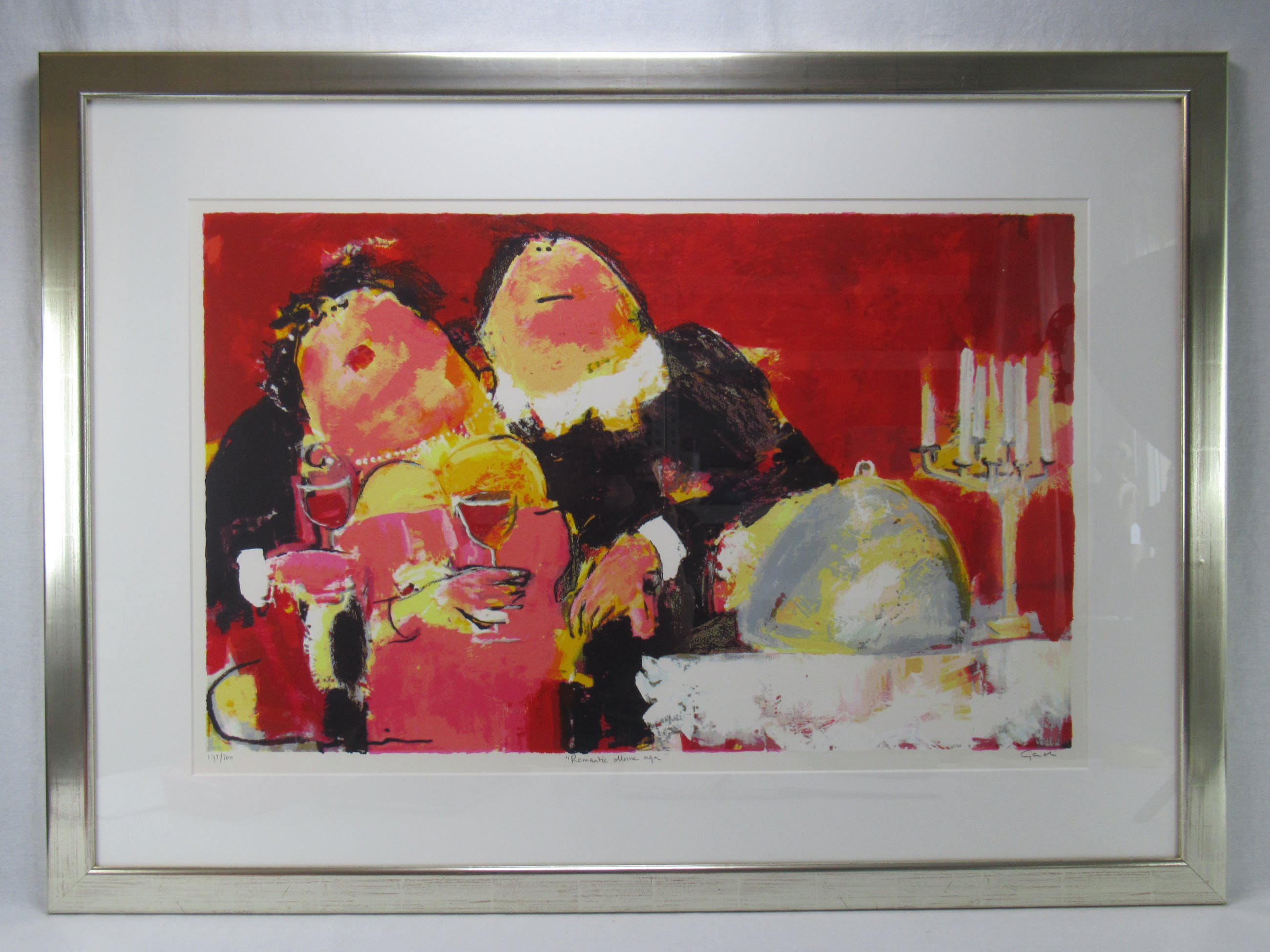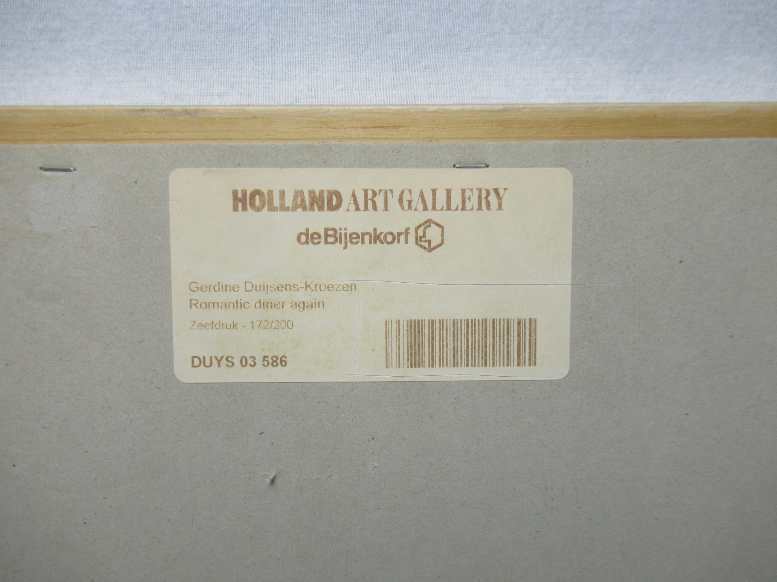 Prachtige zeefdruk van een romantisch dinerend koppel. Was onderdeel van de Holland Art Gallery bij de Bijenkorf in Amsterdam. Het werk is professioneel ingelijst. Het heeft een mooie passe-partout. Kan direct aan de muur worden gehangen!Wordt zorgvuldig verpakt en gebracht binnen Nederland. (Voor aflevering: woont u 100 kilometer vanaf ons adres worden de kosten: 100 * bedrag per kilometer)