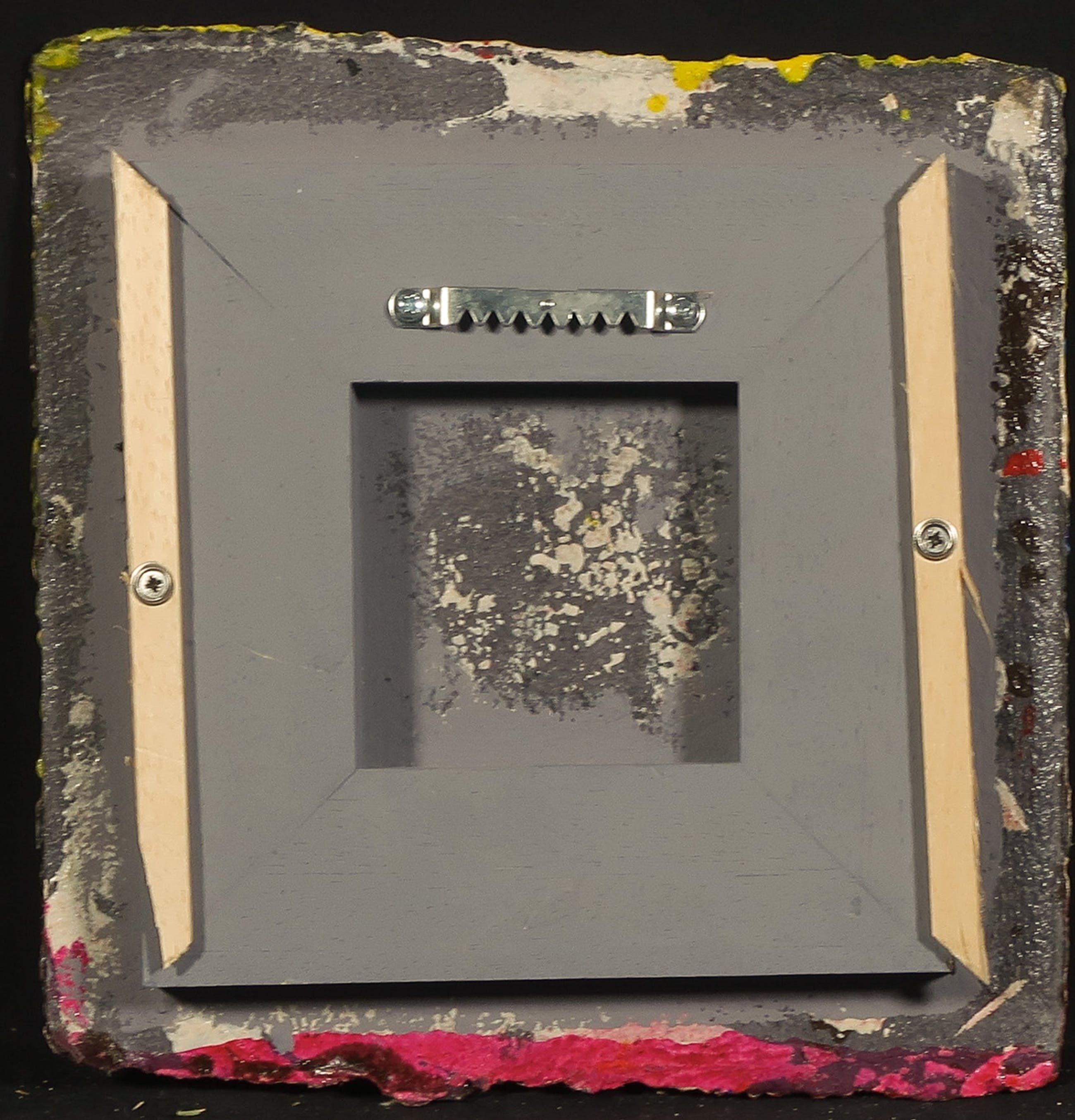 Zeefdruk is bevestigd op houten frame met ophangsysteem (zie foto)