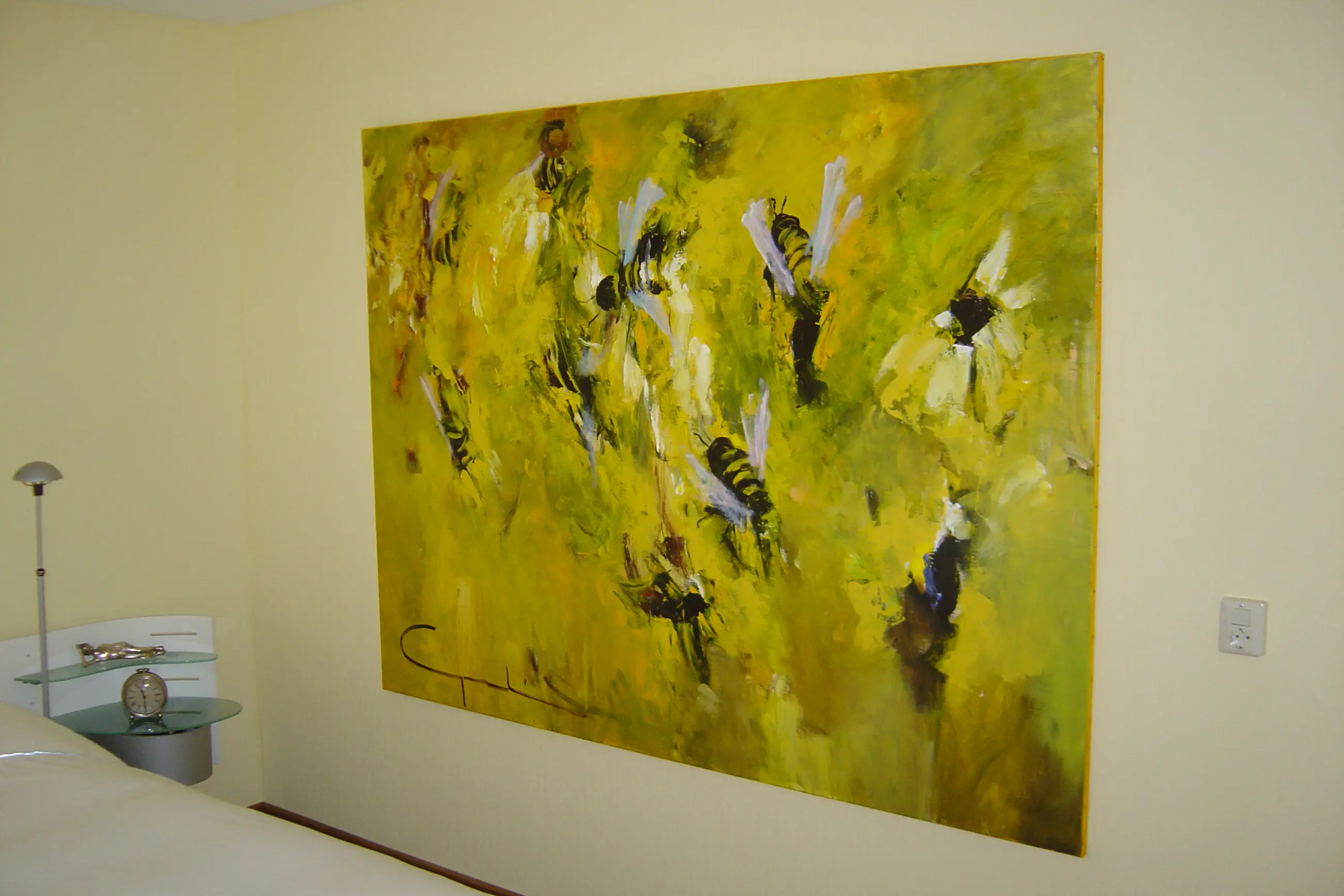 Dit schilderij van Gerdine Duijsens-Kroezen is gemaakt in haar atelier van haar huis met uitzicht op haar eigen tuin. Een veld met zonnebloemen en hommels vormden de inspiratie.