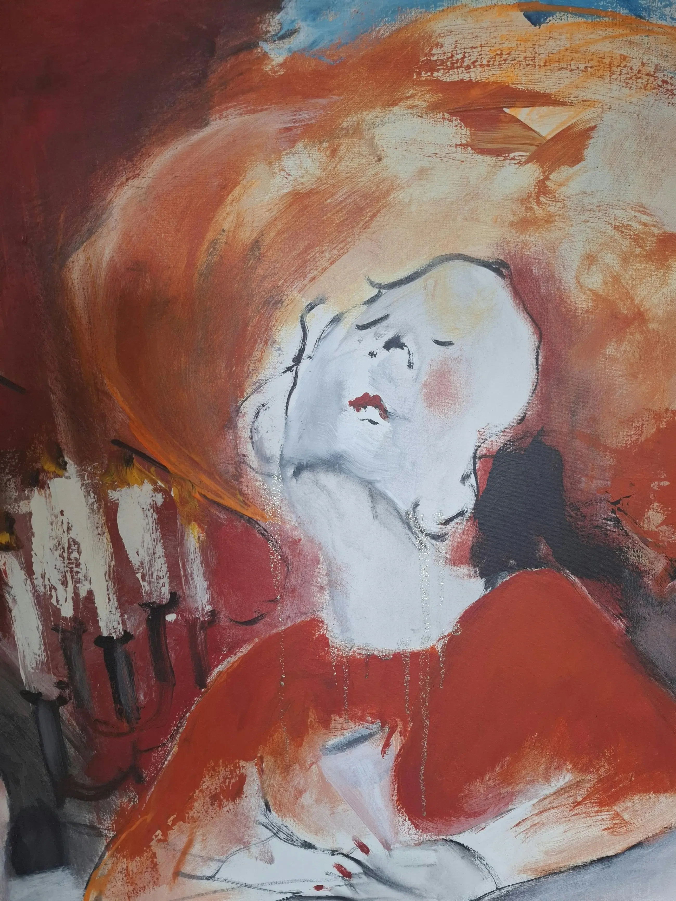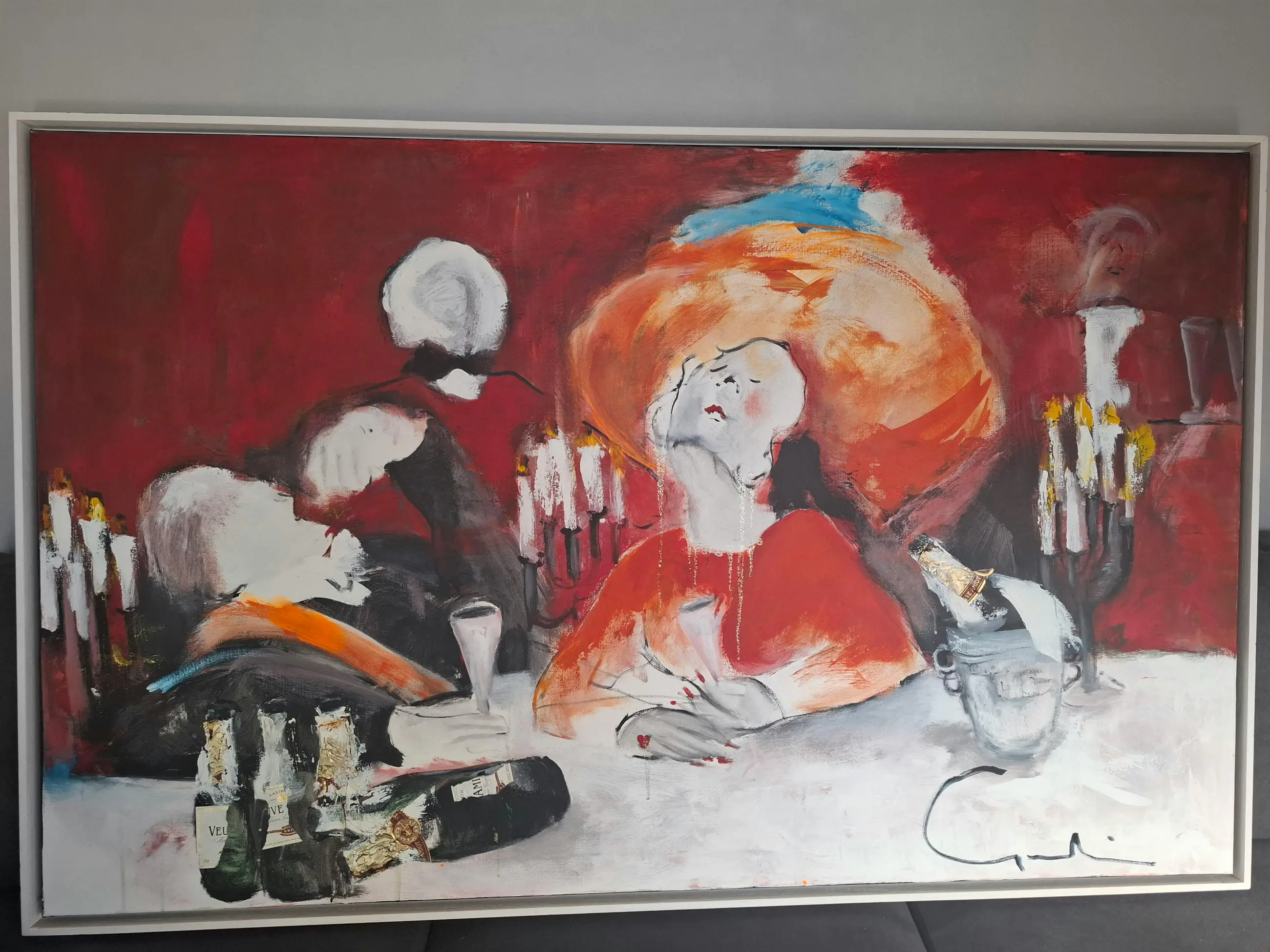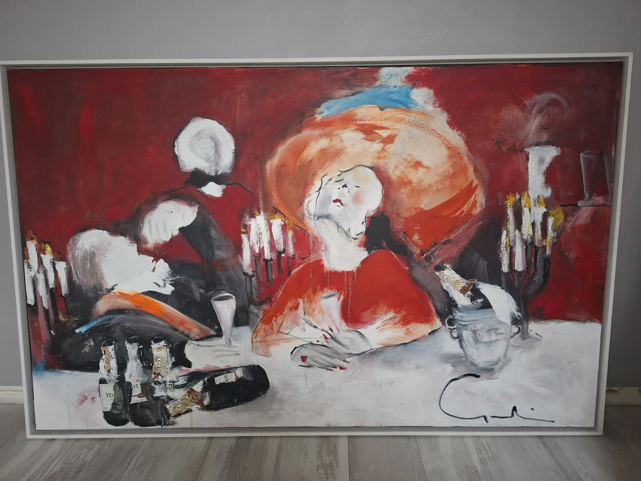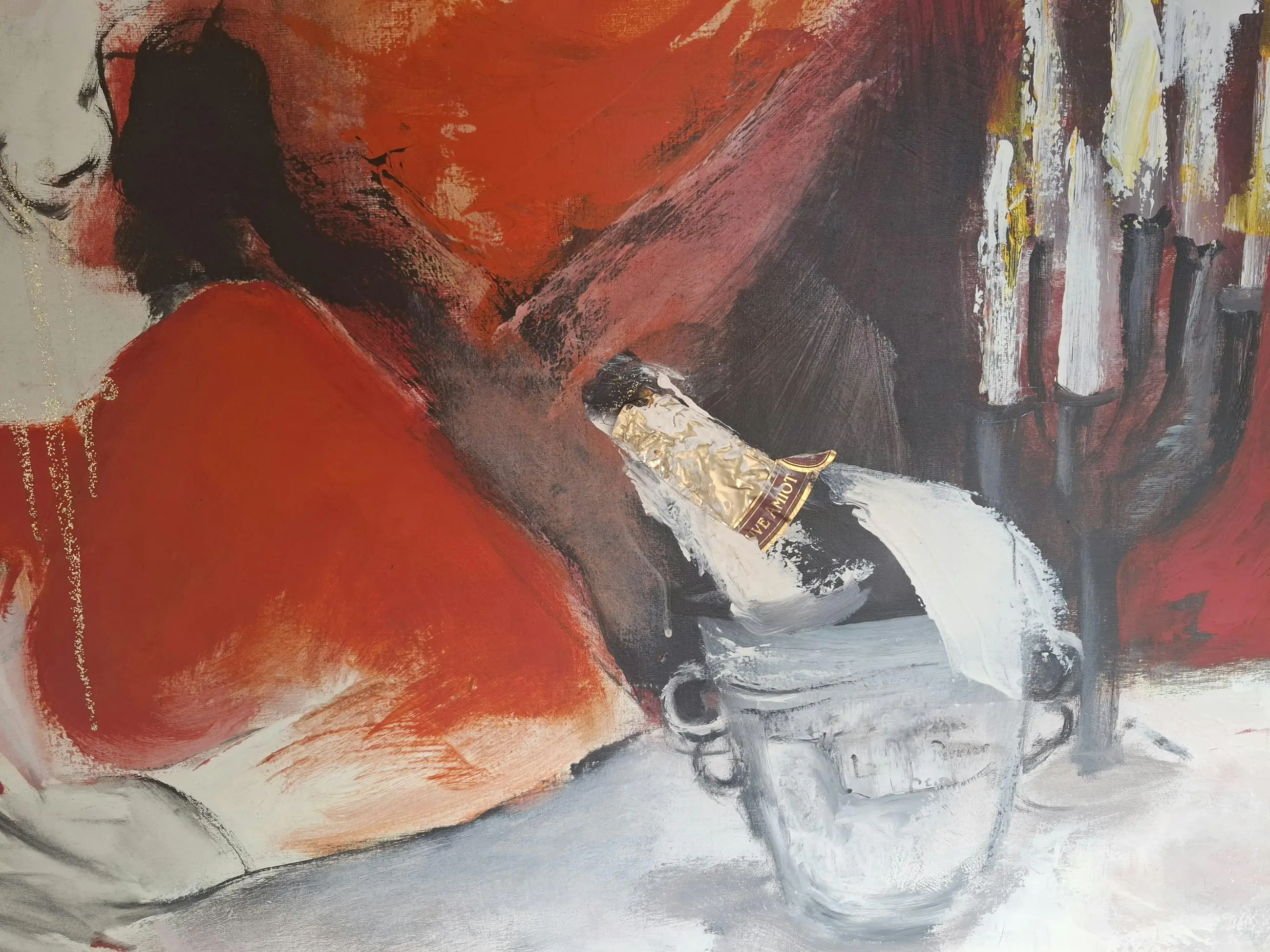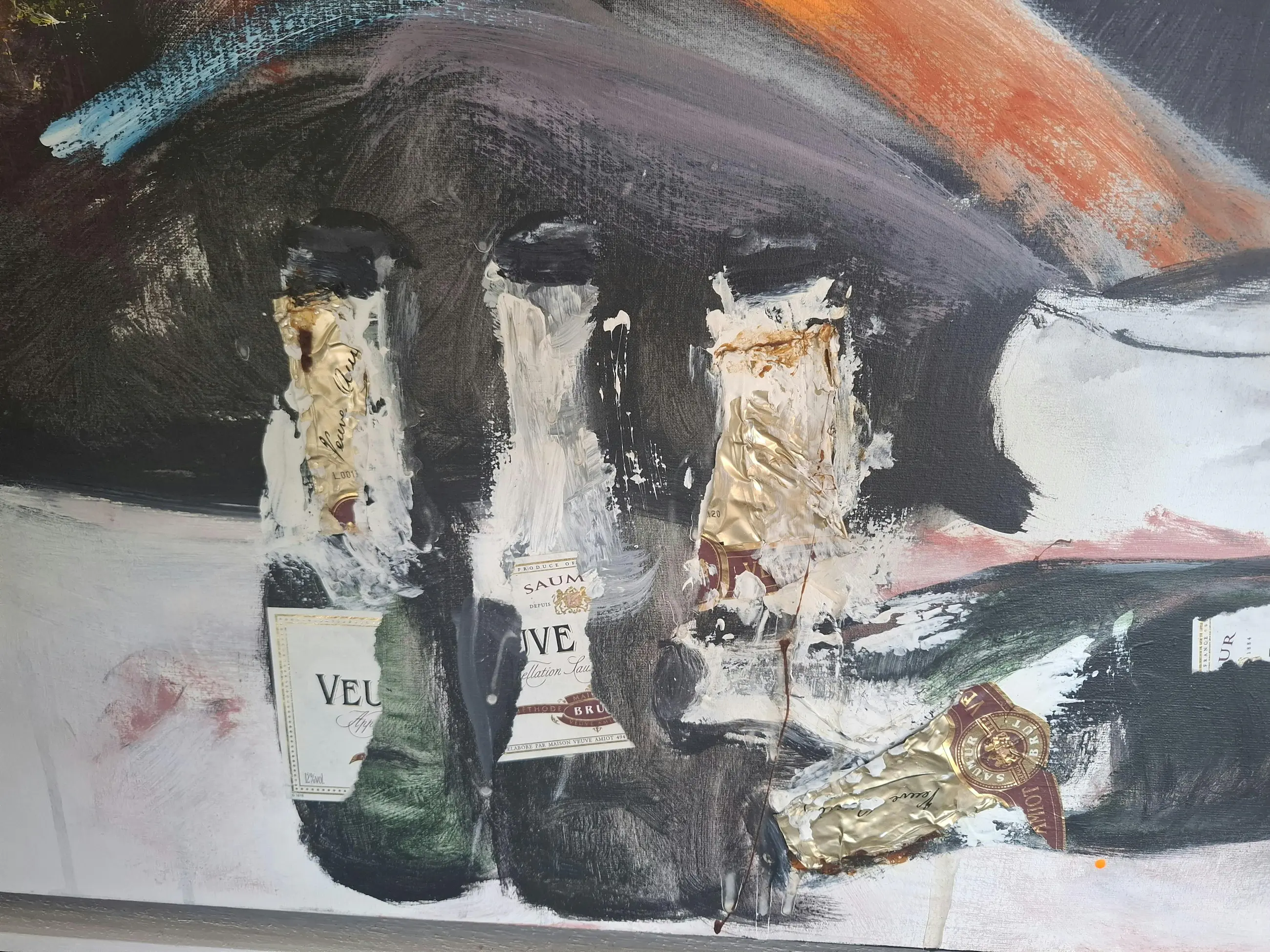 Het Diner van Gerdine Duijsens. Originele champagne etiketten verwerkt en kleine goudverf accentjes. Lyrisch expressionisme.