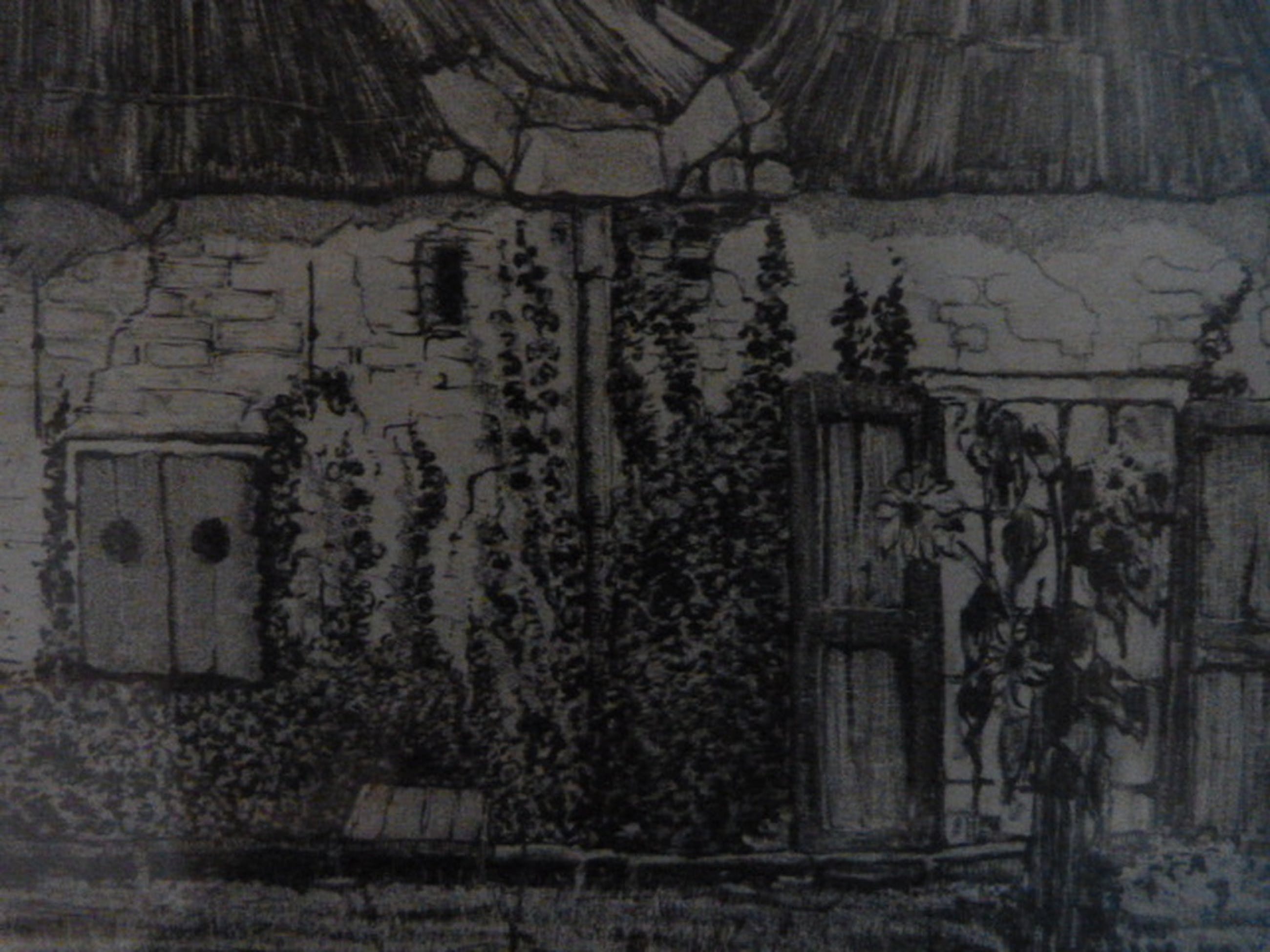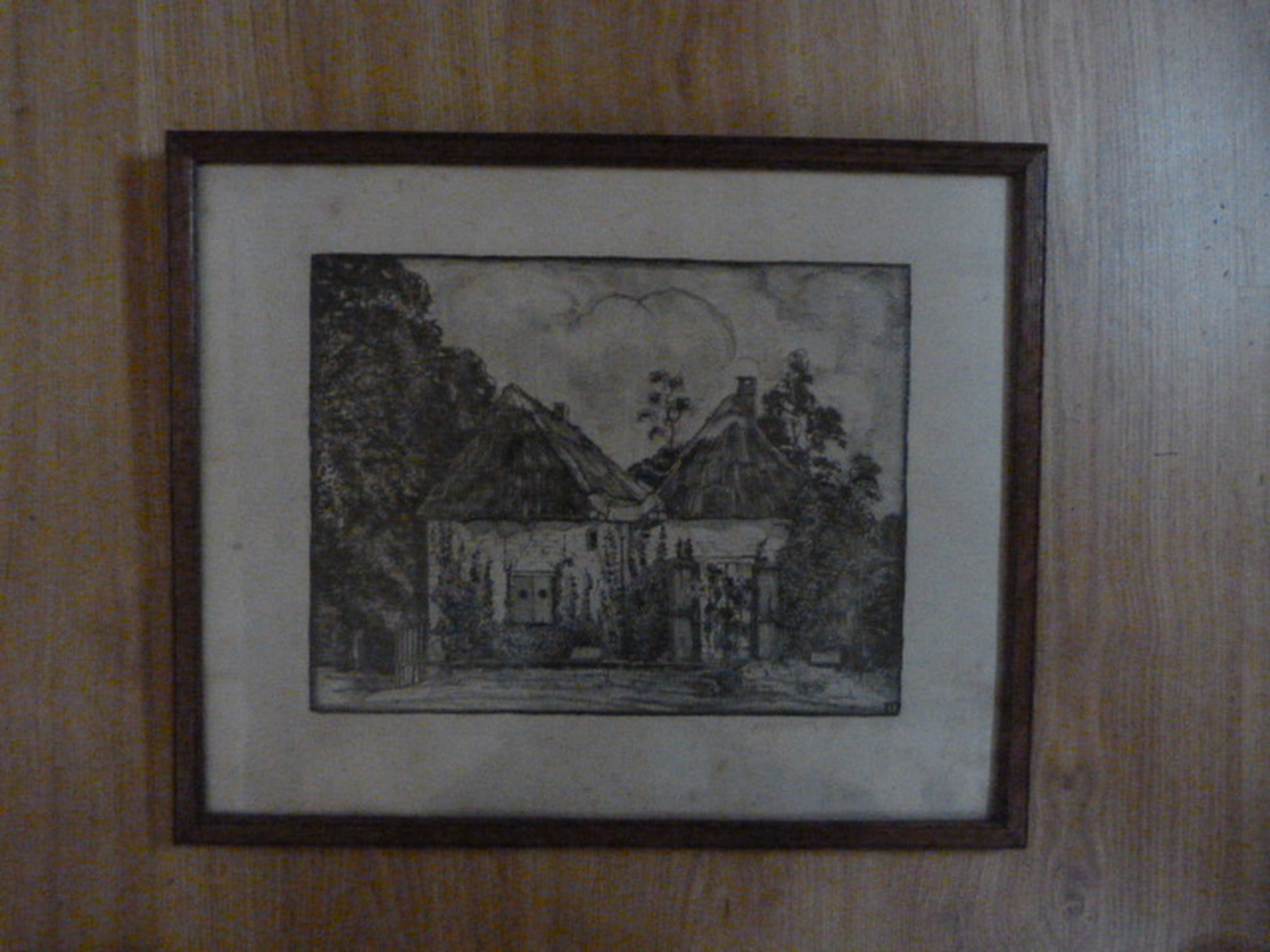 Litho van een boerderij, waarschijnlijk in Blaricum.