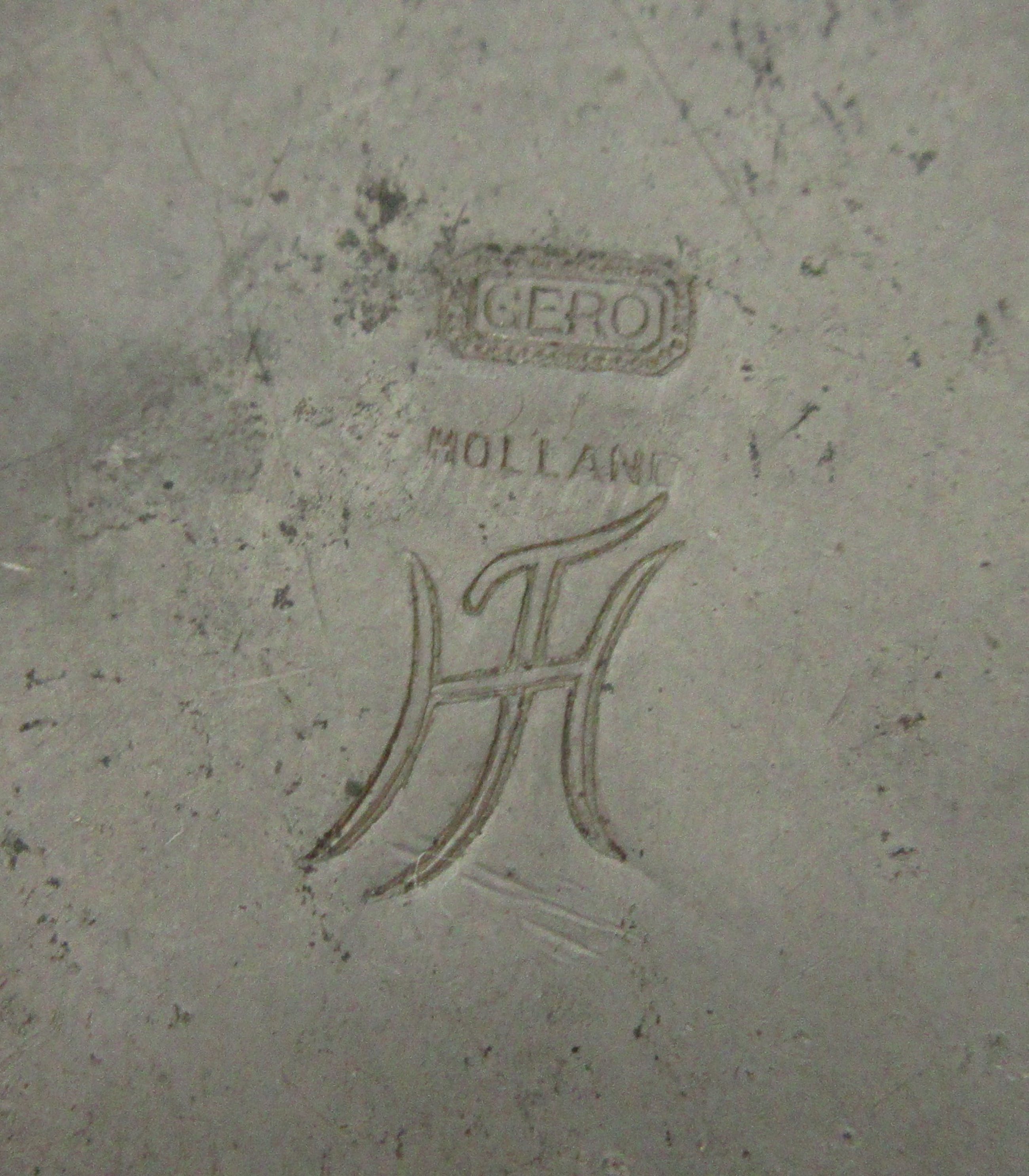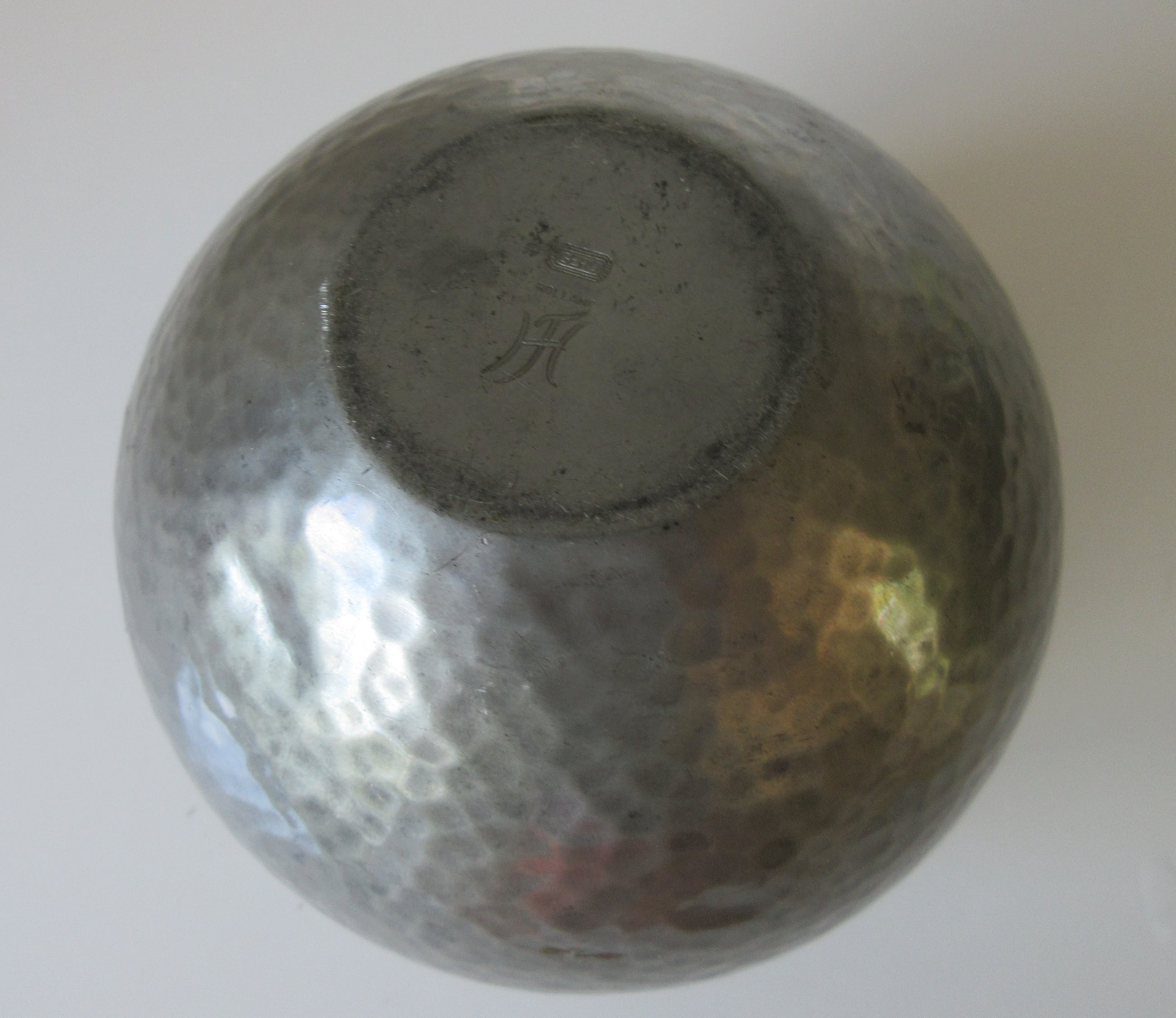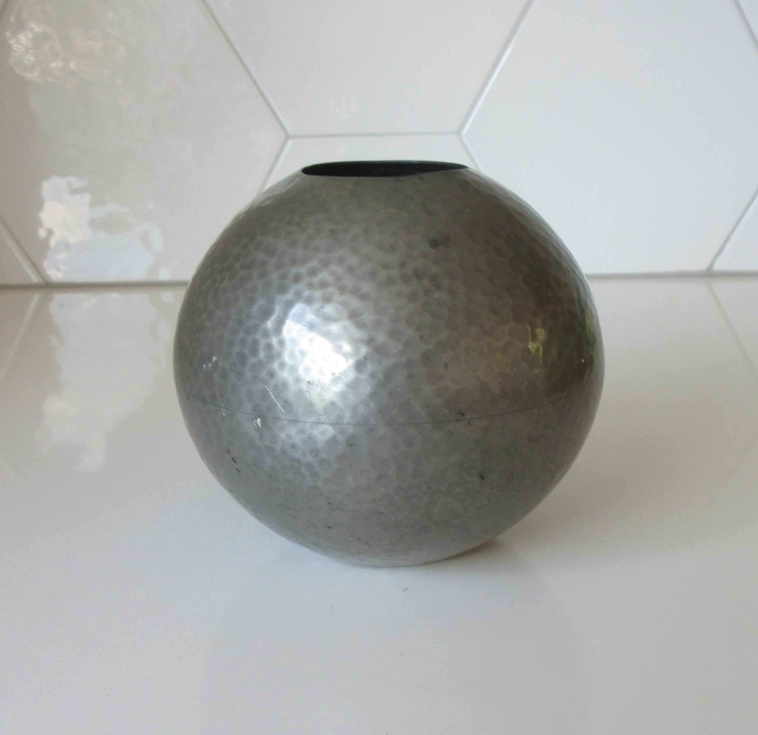 Art deco hand gehamerd tinnen bolvaasje ontwerp Theo Hooft voor Gero Zeist. In goede gebruikte conditie en gemerkt aan de onderzijde en voorzien van het monogram van Theo Hooft (TH).