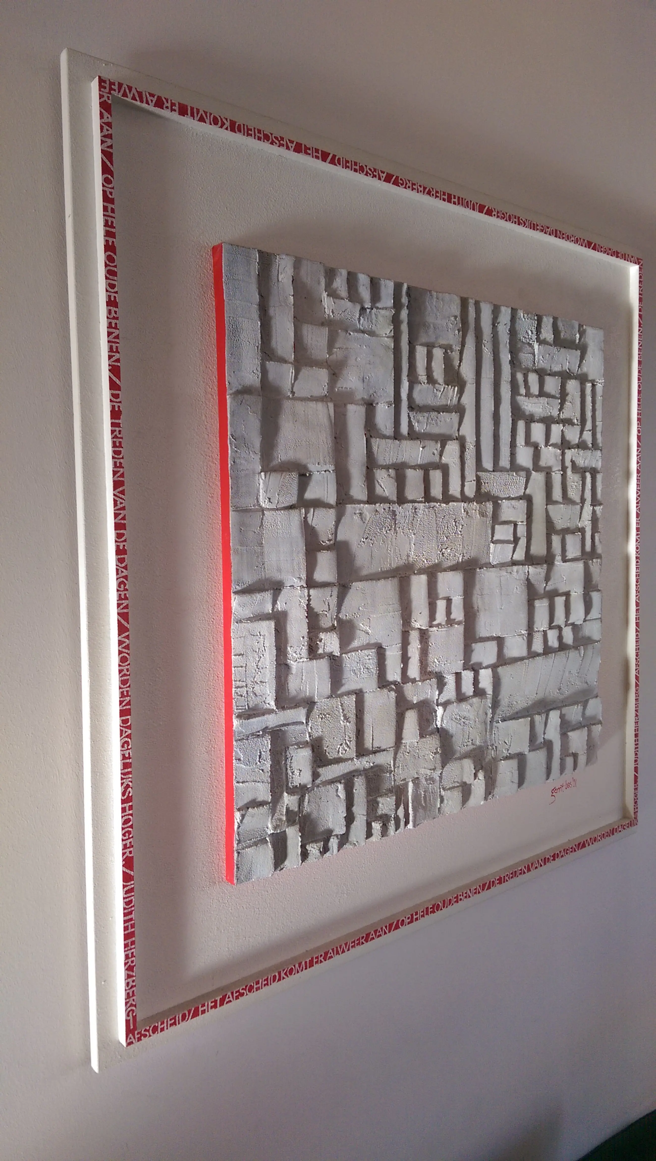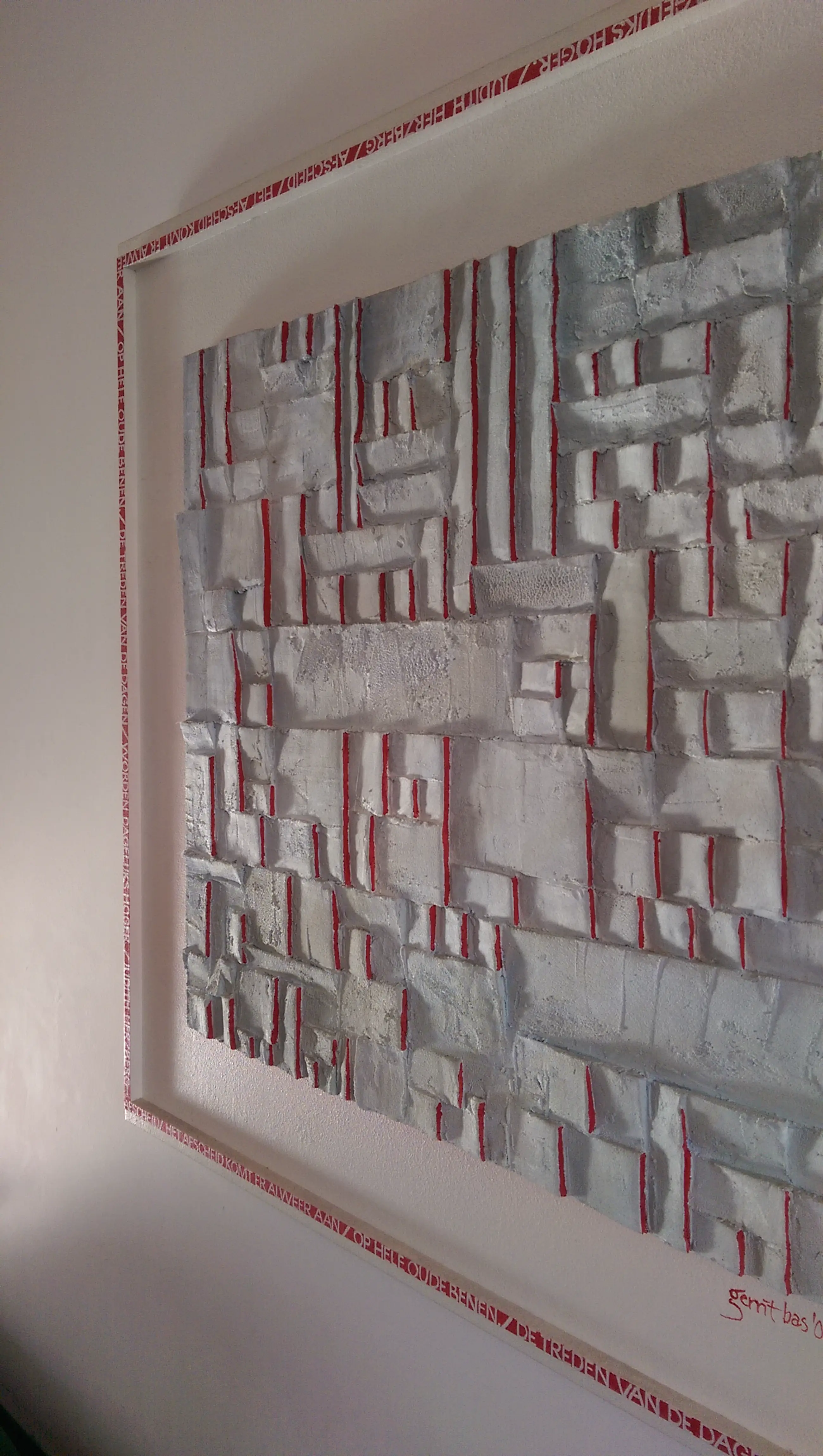 Prachtig verbeeldend werk van kalligrafist Gerrit Bas. Het reliëf in het werk verbeeldt voor ons de hinder in ons leven van het ouder worden. Een gedicht van Judith Herzberg is in de rand opgenomen: 'Het afscheid komt er alweer aan, Op hele oude benen, De treden van de dagen, Worden dagelijks hoger'.