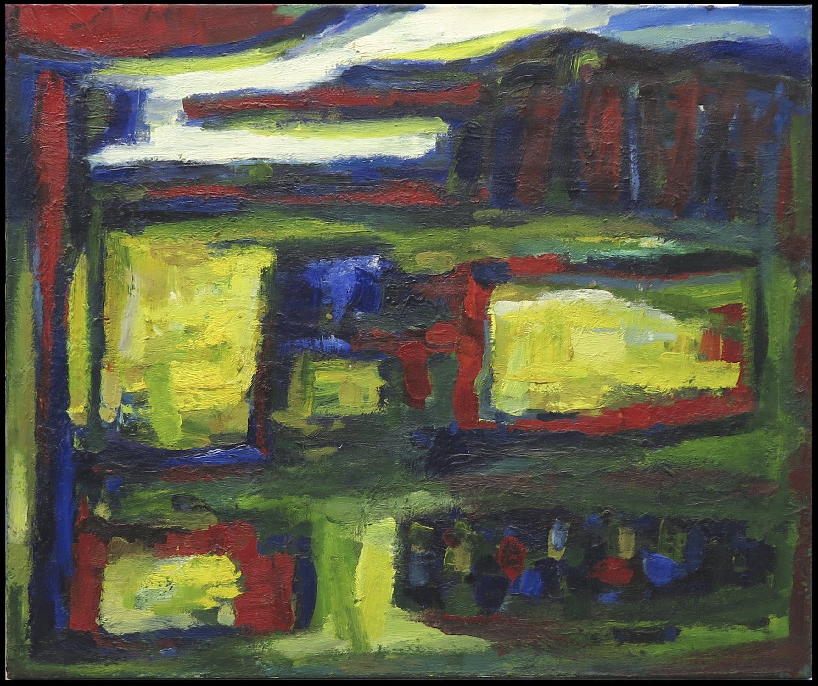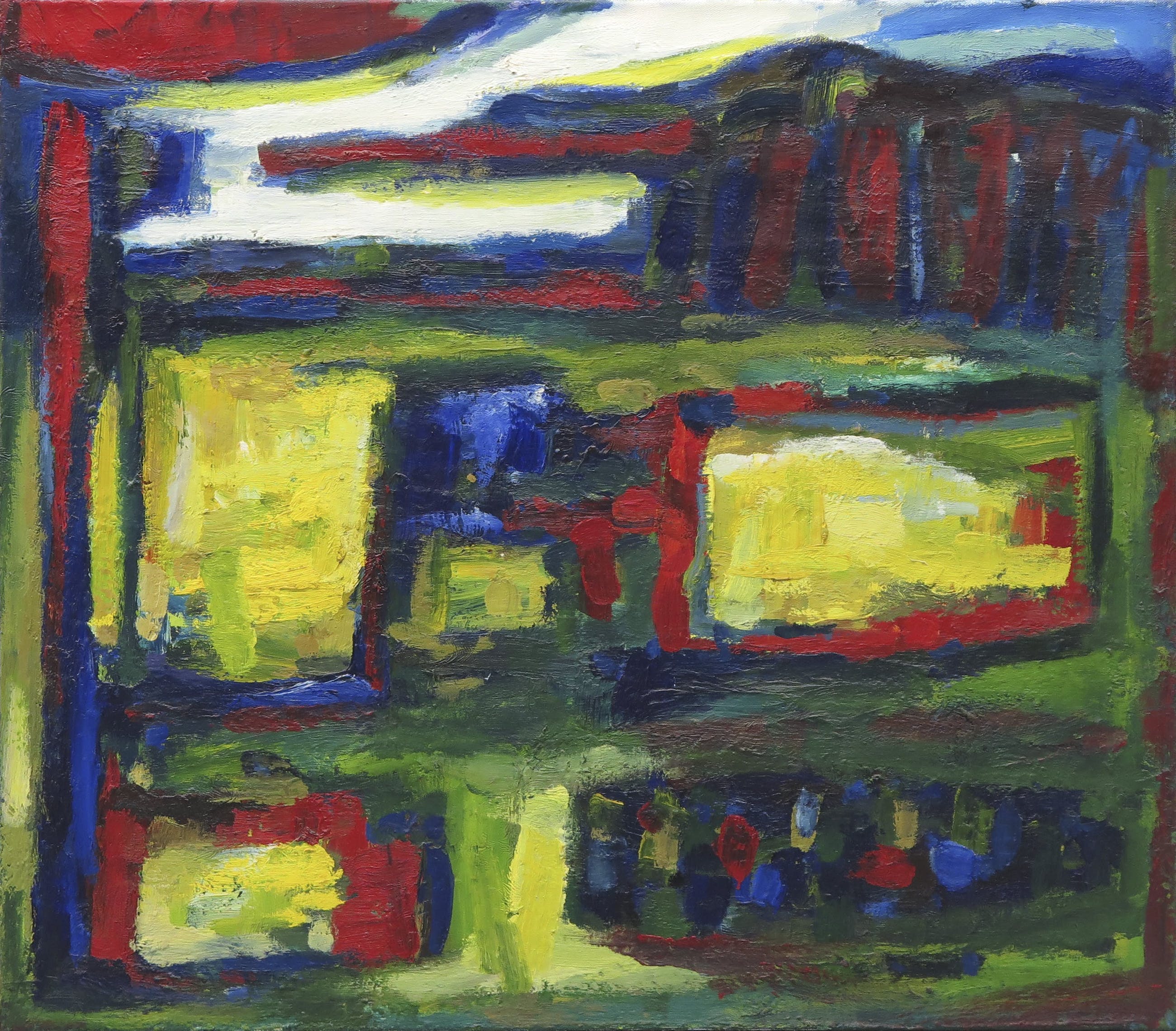 Gerrit Benner werd vooral bekend door zijn abstracte en veelkleurige landschappen in neo-expressionistische stijl, waar het hier aangeboden schilderij een uitstekend voorbeeld van is. Benner wist met grote kleurrijke vlakken en enkele kleine toetsen het doek tot leven te wekken. Iedereen herkent er de Nederlandse landschappen in, met grote levendige wolkenluchten en platteland zover het oog reikt. Met een klein rood vlak wist Benner een boerderij aan de horizon te toveren, met een groene streep plaatst hij een bomenrij, geplant aan een boerenweg en welke de oneindigheid van het platteland kort onderbreekt. Zijn landschappen ademen de sfeer alsof hij in de openlucht daar in het Friese land tussen de koeien zat, maar hij schilderde ze in het atelier in Amsterdam.
